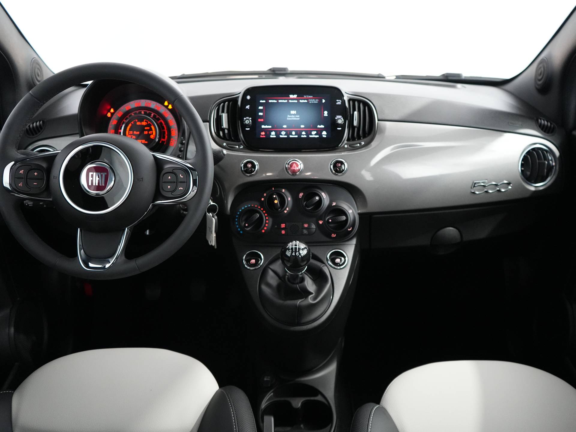 ✓ Zacht dashboard bekleed met gemêleerde stof RIMINI en open bergruimte in grafeen , glanzend zwart voorpaneel en ventilatieopeningen met decoratie in Stene Grey
