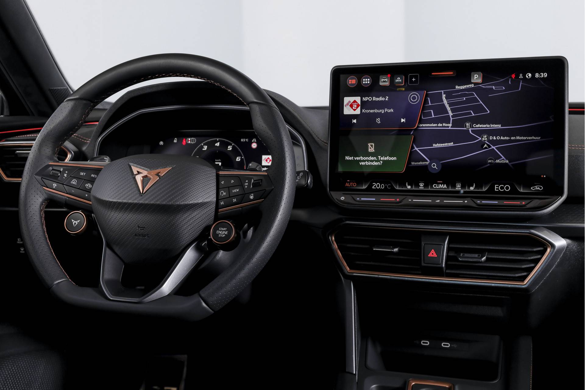 Het interieur is sportief en hoogwaardig afgewerkt, met kuip sportstoelen in microvezel bekleding. De elektrisch verstelbare bestuurdersstoel met geheugen zorgt ervoor dat je altijd direct de juiste zitpositie hebt. Voor extra comfort zijn de voorstoelen verwarmd en is ook het stuur verwarmd, prettig op koude dagen. Daarnaast beschikt de auto over interieur voorverwarming/(koeling), zodat je altijd instapt in een aangename temperatuur. Alle rij-informatie wordt overzichtelijk weergegeven via het volledig digitaal instrumentenpaneel.