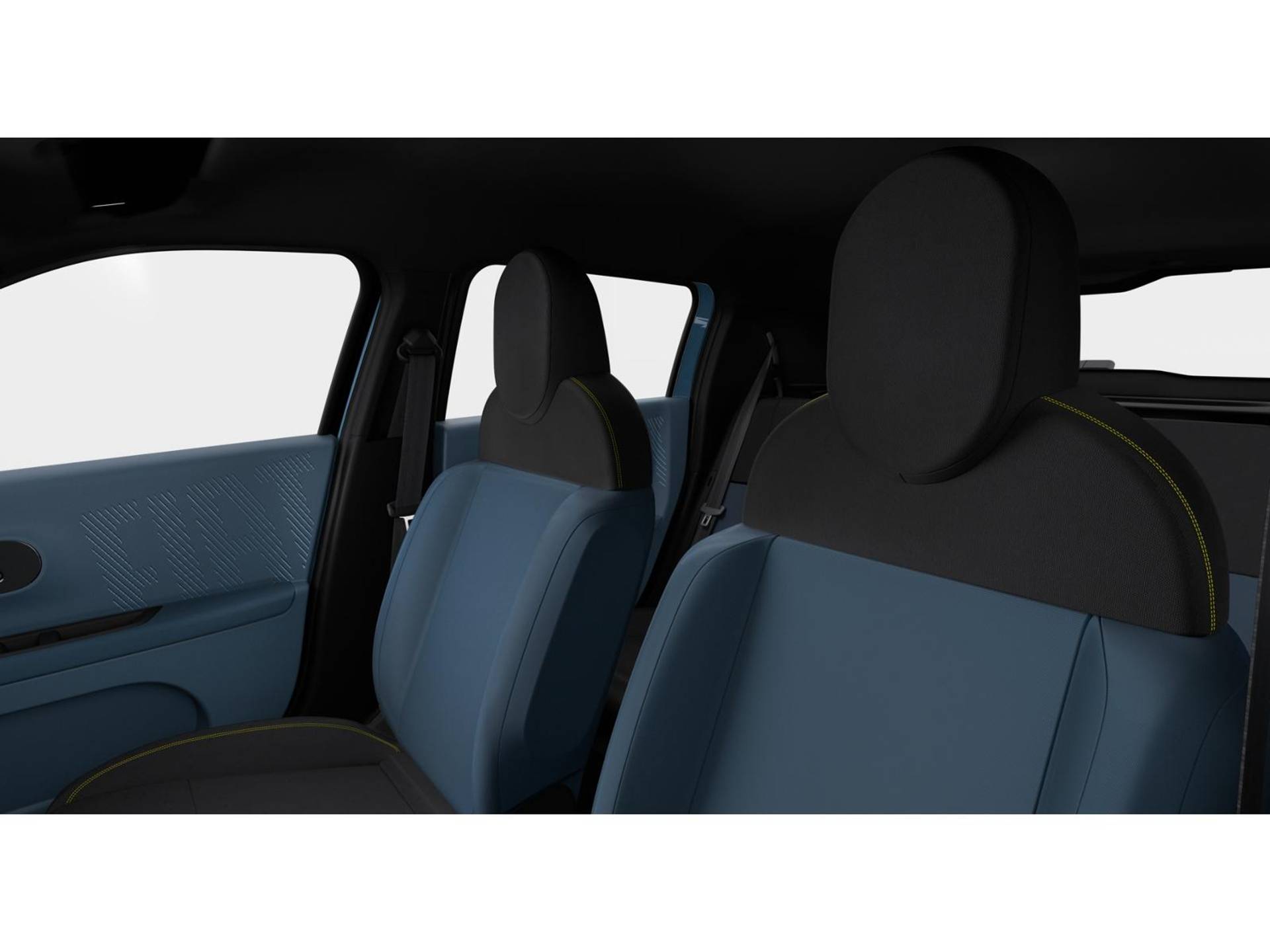 ✓ Stoelbekleding – blauwe en zwarte “Base” stof met gele stiksels