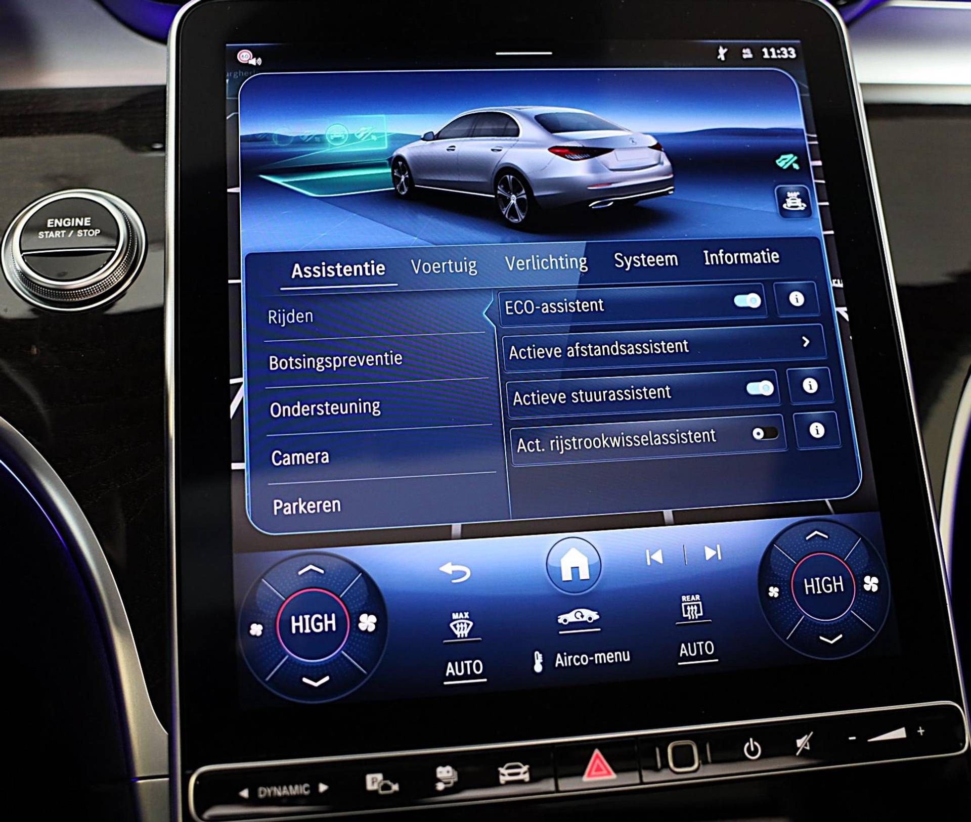 Geavanceerde systemen kunnen tijdens de rit bepaalde taken van u overnemen. Zo kijken er als het ware steeds extra ogen met u mee, zodat u tijdig kunt reageren op noodsituaties. Eyes on the road! Dat kan iedere seconde, dankzij de head-up display, die informatie projecteert op de voorruit. De camera van de verkeersborddetectie herkent verschillende soorten verkeersborden en toont deze op het dashboard. Het Lane-keeping systeem registreert permanent of u binnen de lijnen van de rijstrook blijft; dwaalt u onbedoeld af, dan waarschuwt het systeem en corrigeert de koers. Met voorzieningen als dodehoekdetector detectiesysteem, accident avoidance system, forward collision warning system, Abs - anti blokkeer systeem met brake assistant en bandenspanningcontrolesysteem, bent u altijd veilig onderweg.