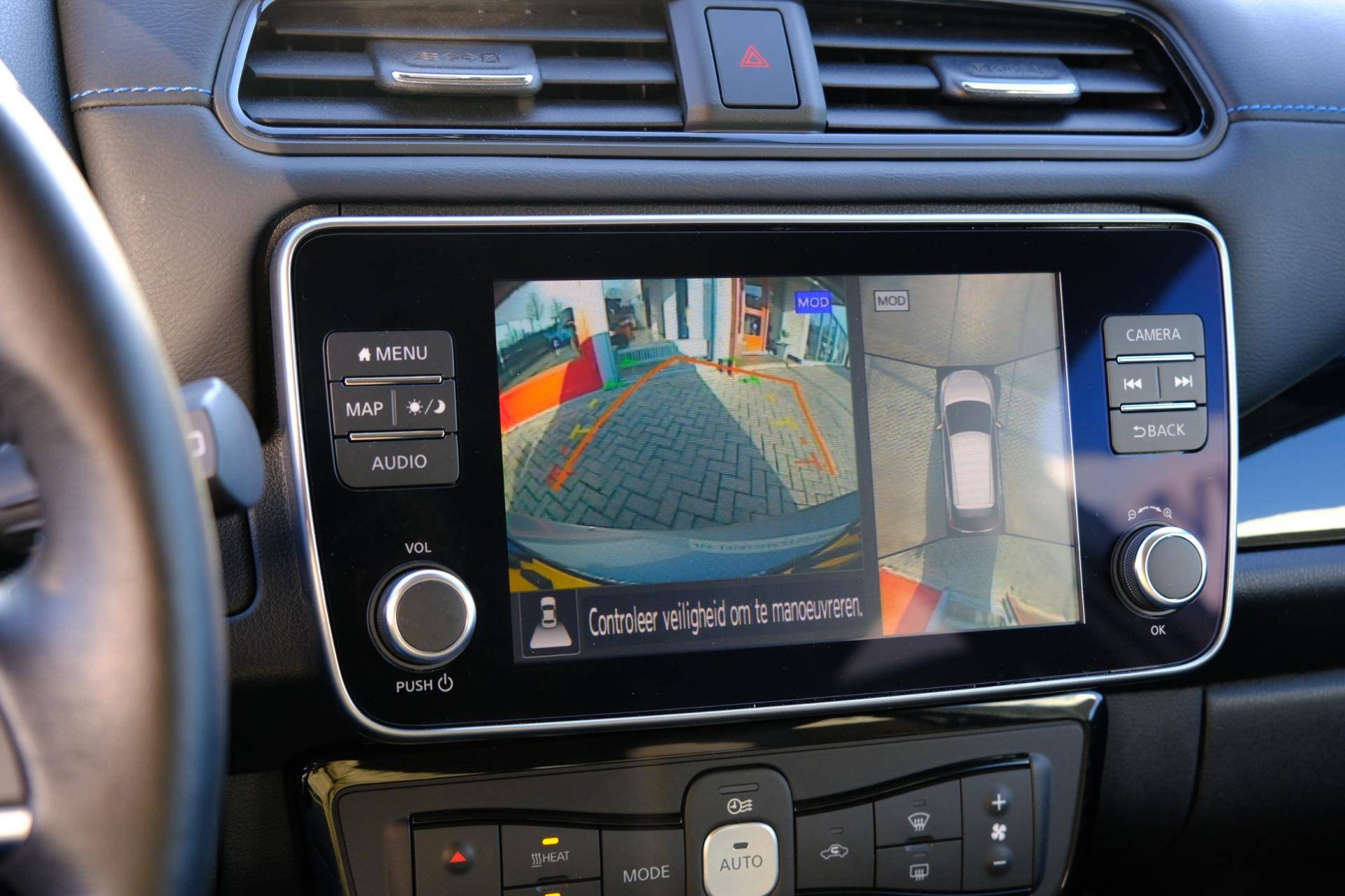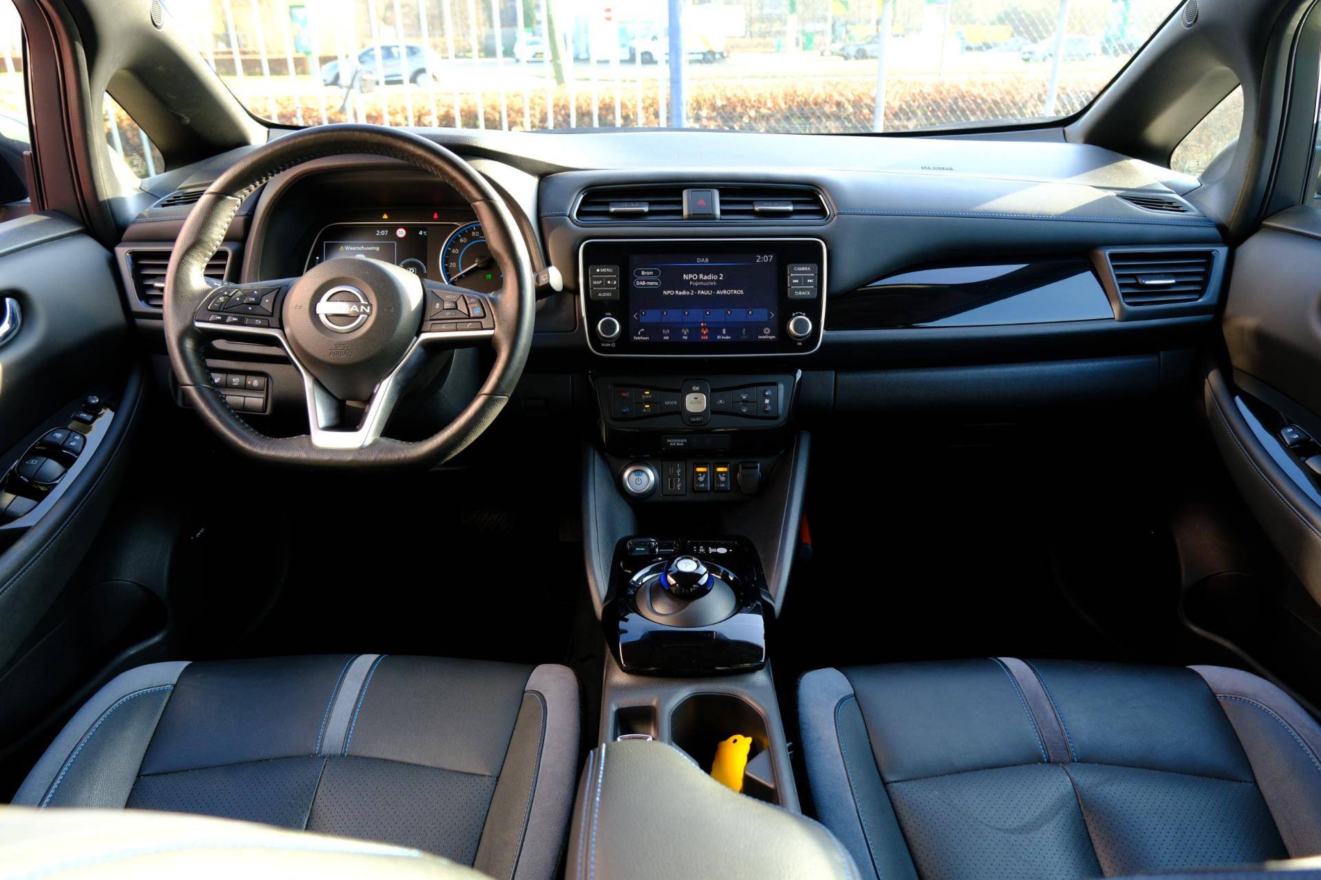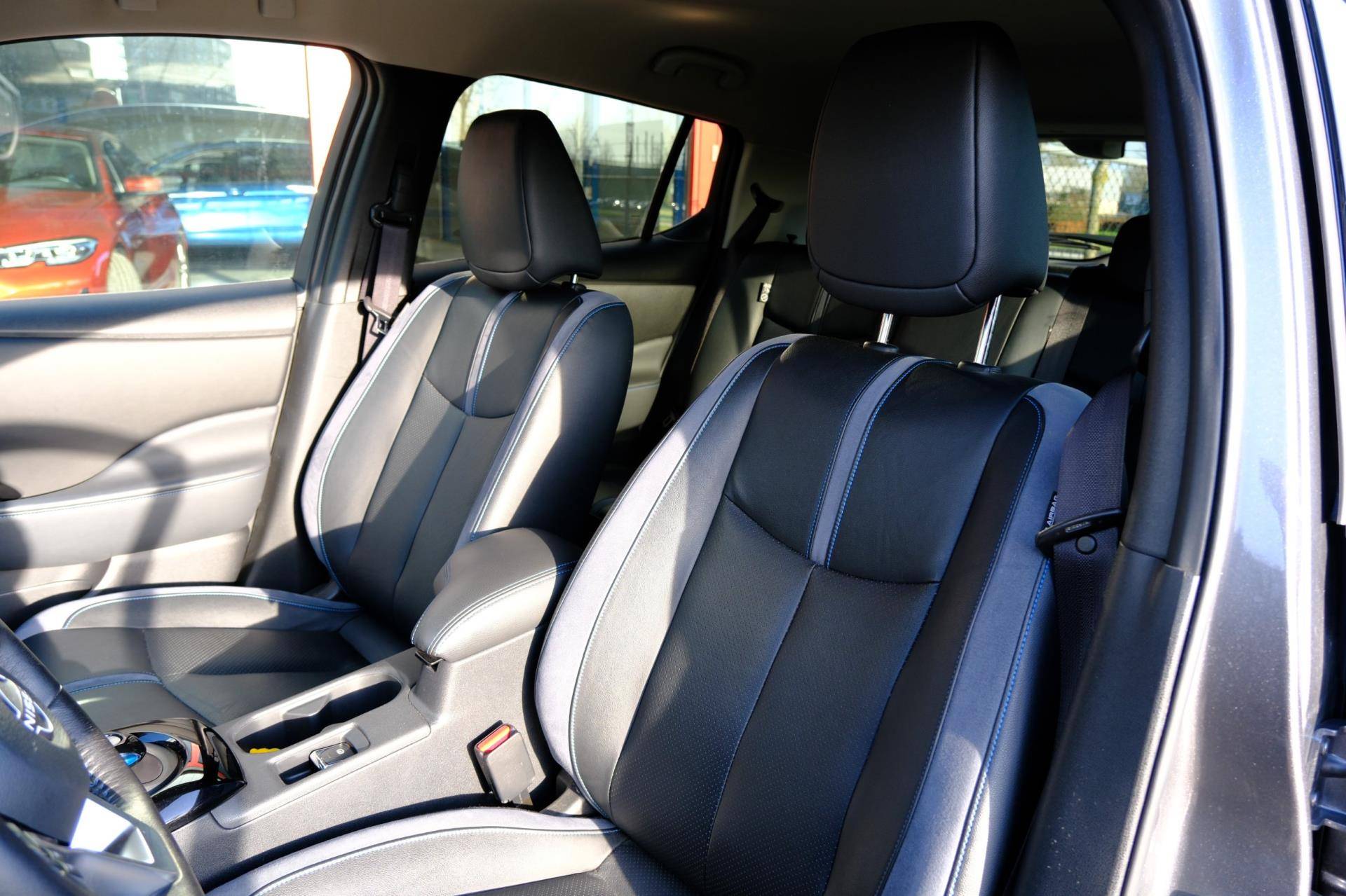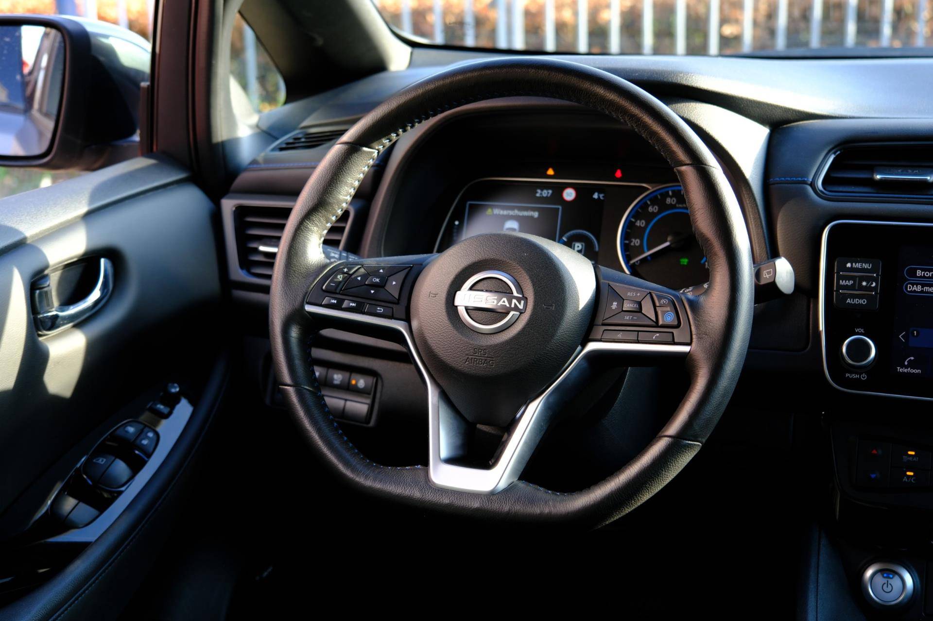 De Nissan LEAF is ook voorzien van ADAS. Deze Advanced Driver Assistence Systems fungeren als extra ogen en oren: ze houden voor u de weg in de gaten en grijpen in wanneer dat nodig is. U rijdt ook veiliger omdat deze auto voor u de verkeersborden langs de weg kan lezen. De belangrijkste borden worden op uw instrumentarium geprojecteerd, zodat u ze niet kunt missen. Deze Nissan LEAF is ook behulpzaam als het gaat om een rechte koers. Het Lane-keeping systeem signaleert en corrigeert als u onbedoeld de rijstrooklijnen dreigt te overschrijden. Actieve dodehoekdetectie geeft een waarschuwingssignaal wanneer een ander voertuig in uw dode hoek rijdt. Dit verkleint de kans op een aanrijding. U bent mede dankzij accident avoidance system, forward collision warning system, hill hold functie, brake assist, vermoeidheidsherkenning en bandenspanningcontrolesysteem steeds veilig onderweg.