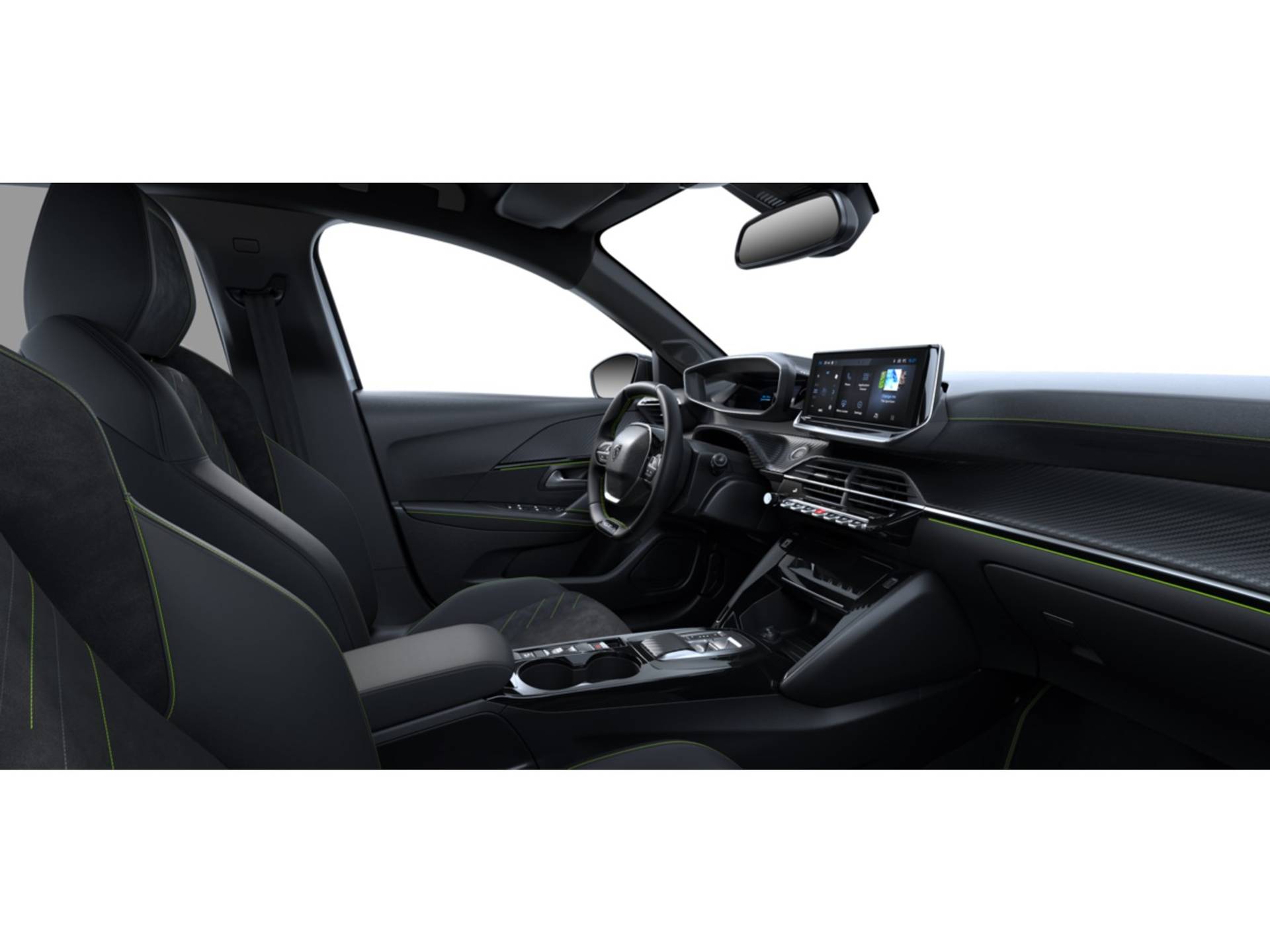 ✓ Portierpanelen vóór met Carbon TPE afwerking, glanzend zwarte strip en stiksel in groen Adamite op de portiergreep