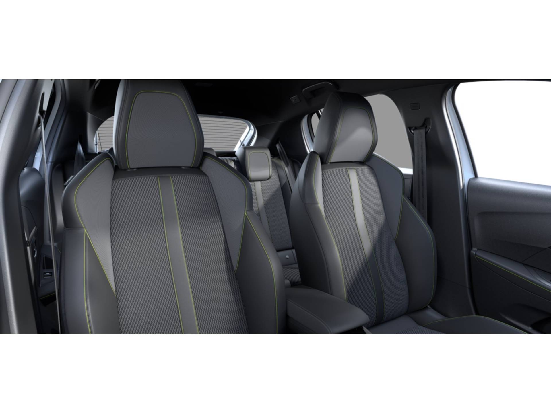 Interieur: Bekleding Stof/kunstleder BELOMKA, afgewerkt met stiksels in groen Adamite en grijs Tramontane