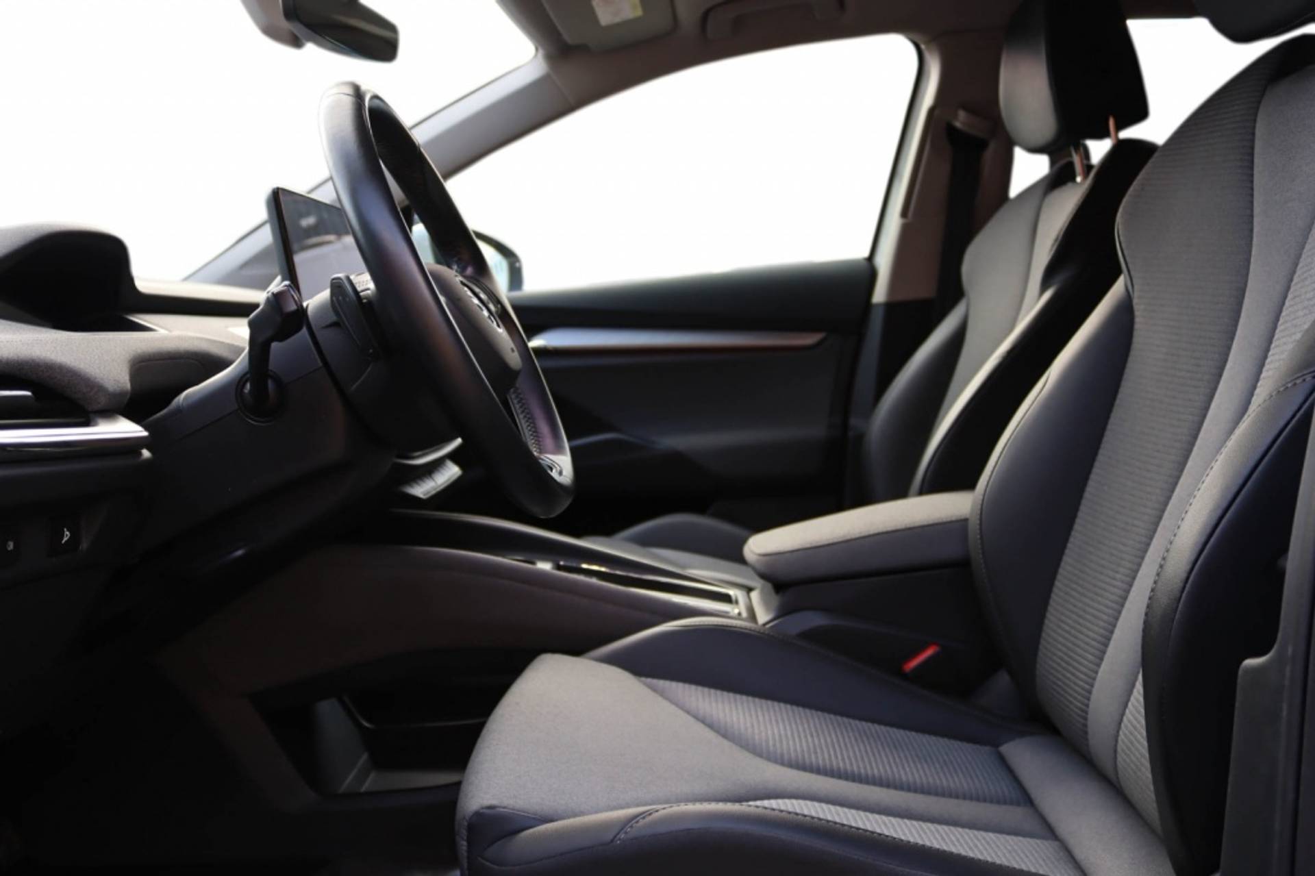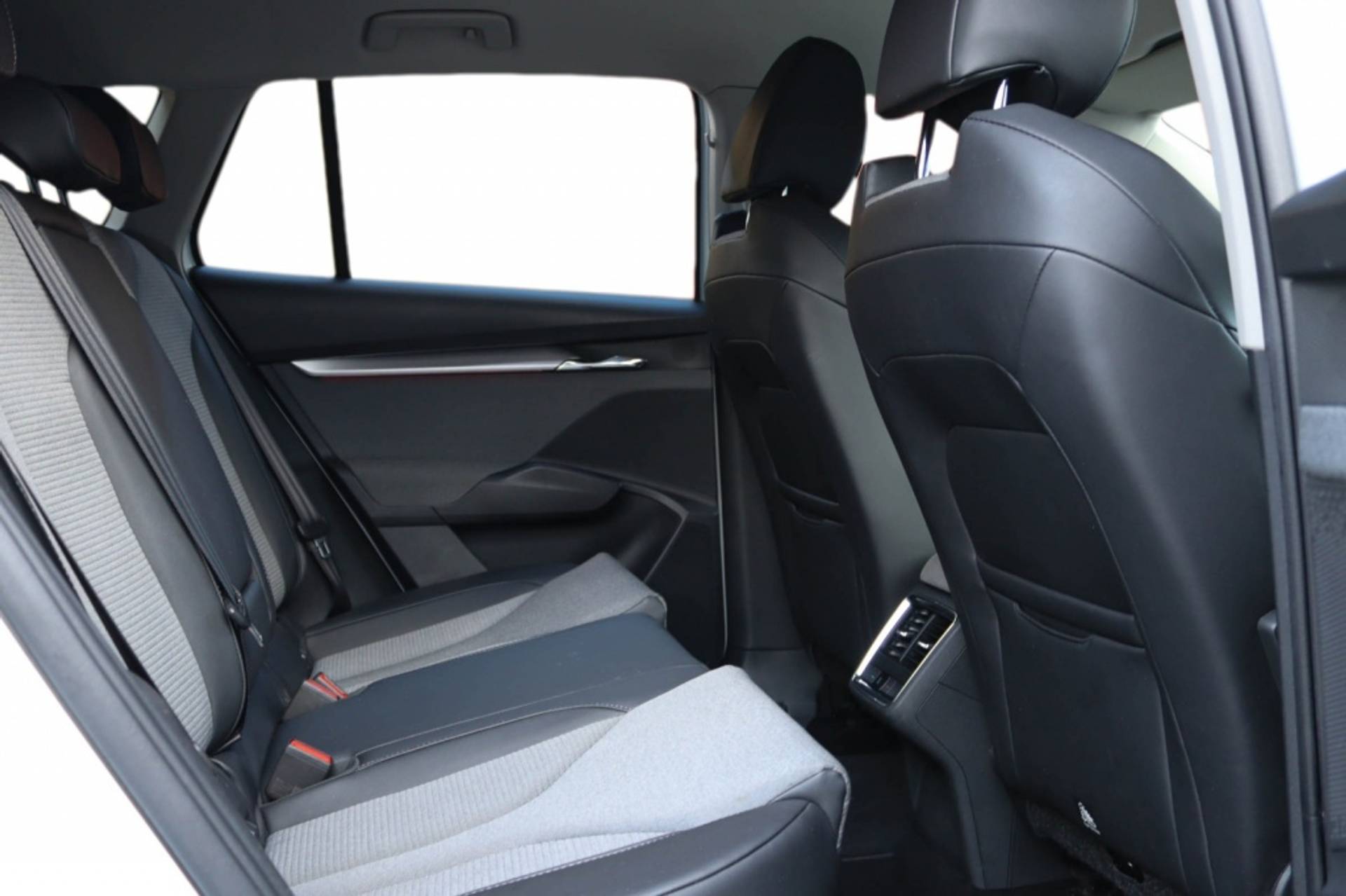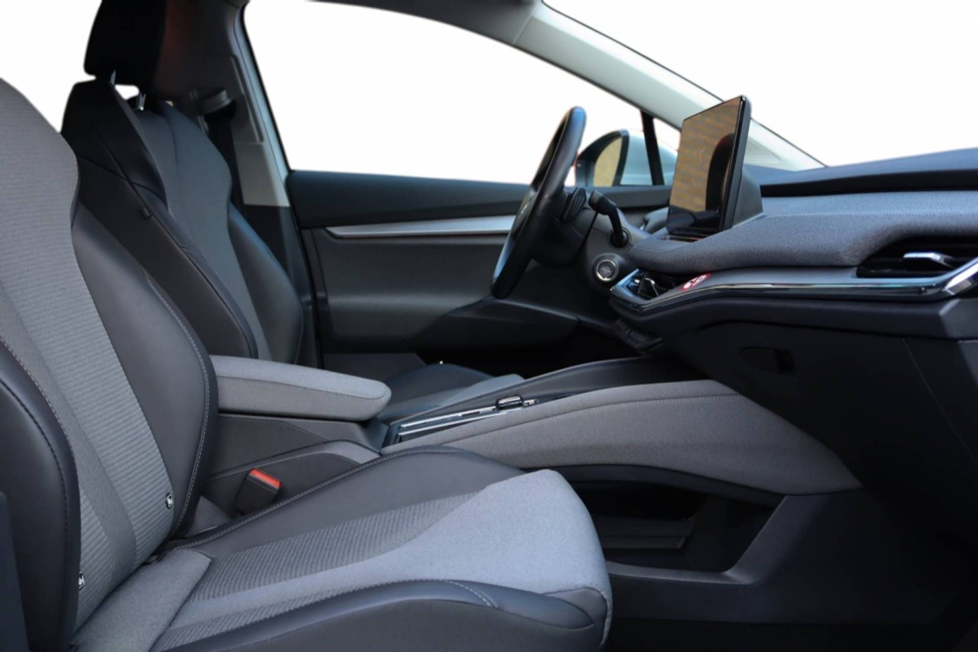 Het interieur van de Skoda Enyaq 80 Loft 82kWh is voorzien van een moderne USB-interface met 2-voudig, Type C aansluiting, waardoor je altijd eenvoudig je apparaten kunt opladen terwijl je onderweg bent. De dakbekleding in een stijlvolle grijze kleur geeft het interieur een luxe uitstraling en zorgt voor een aangename sfeer tijdens elke rit.