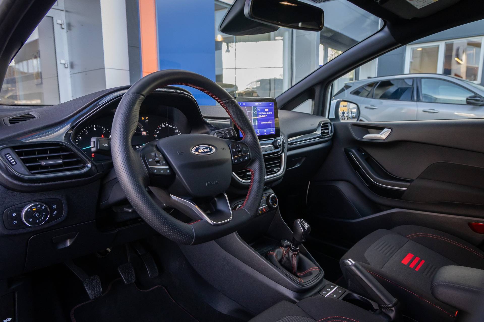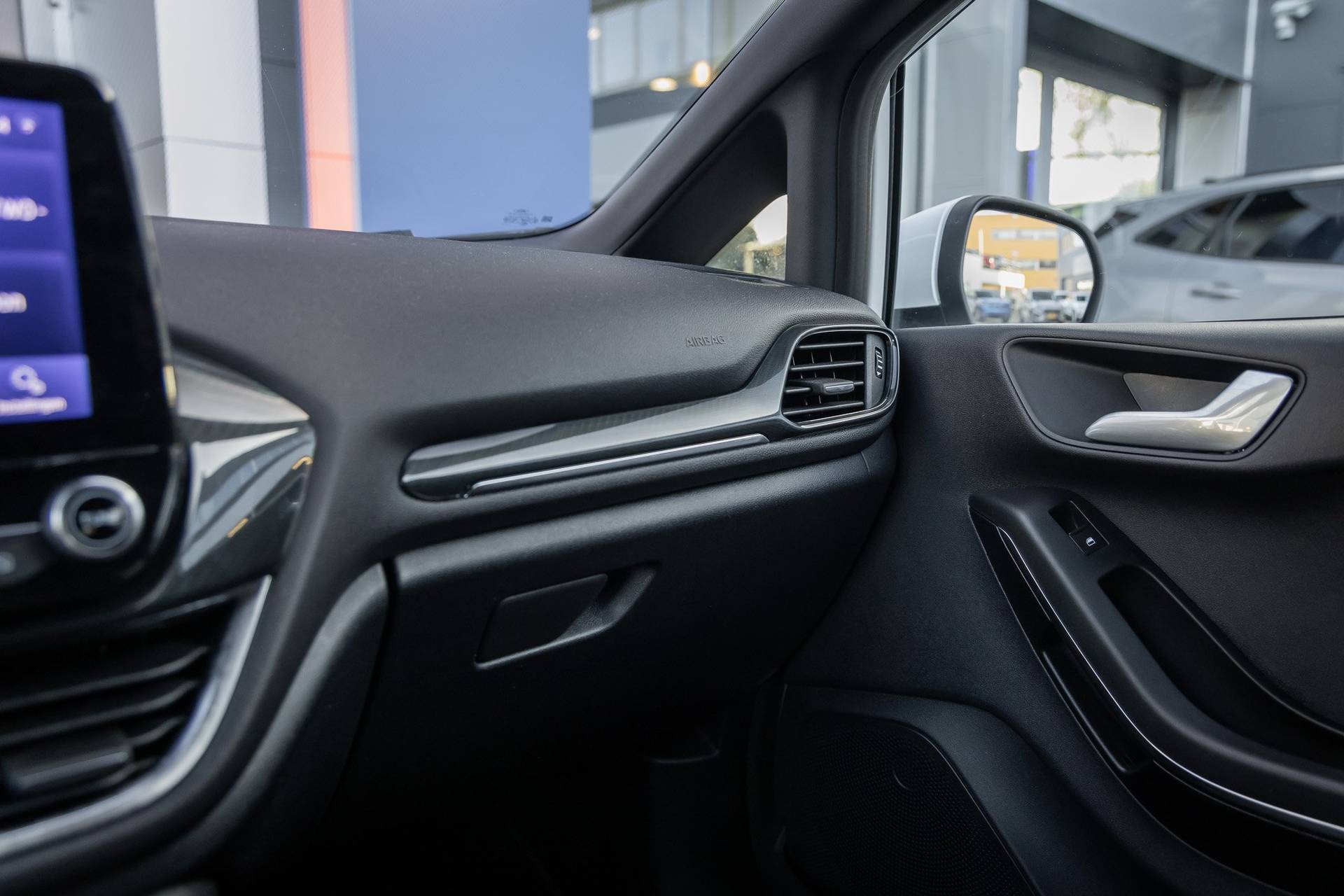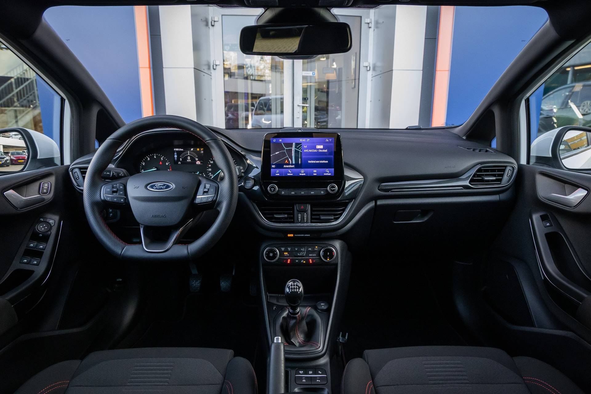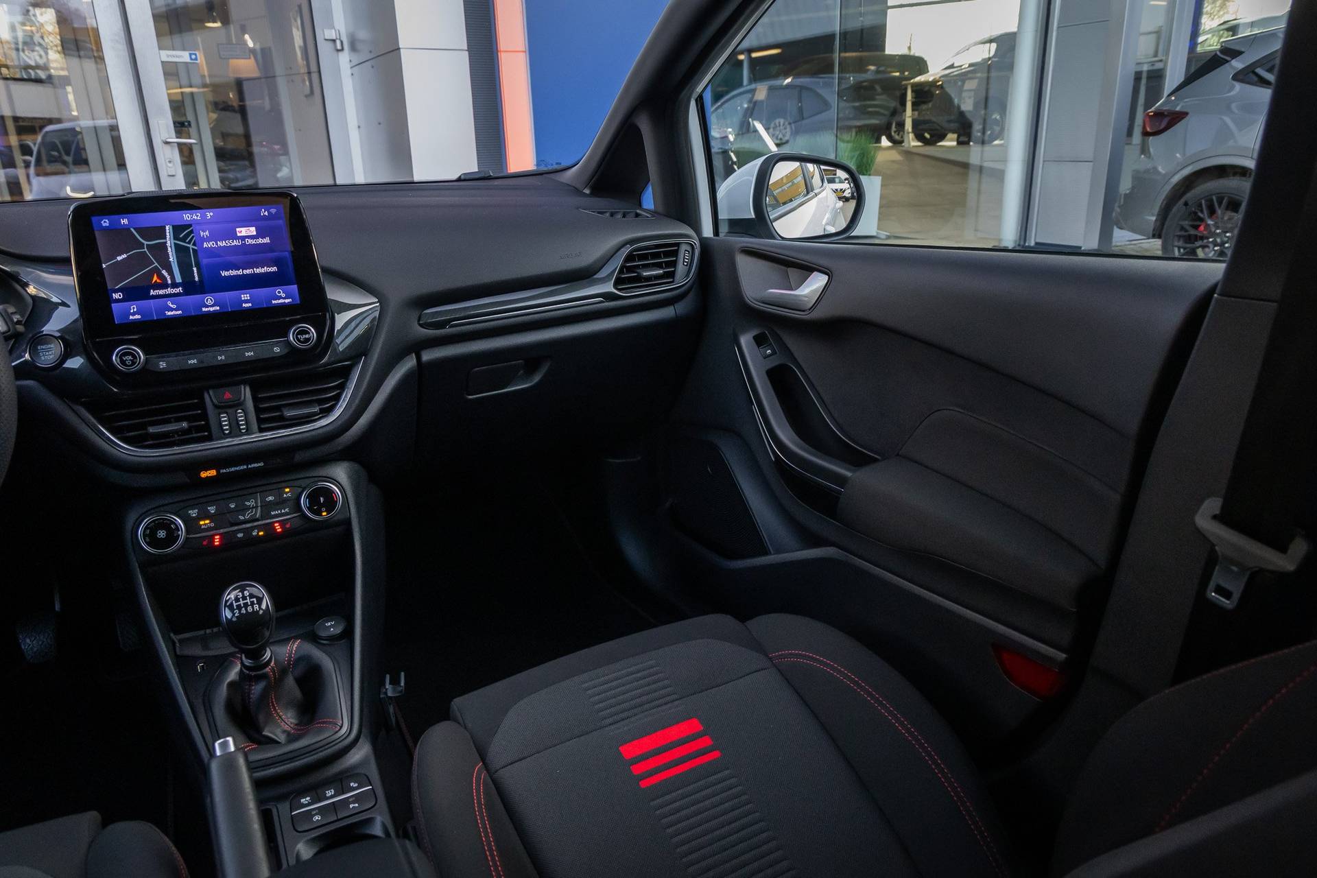 Go Ford, Go Further. En dat maakt deze auto helemaal waar. Hij heeft een benzinemotor en een handgeschakelde zesversnellingsbak. Voorin is het 's winters genieten met de verwarmbare voorstoelen voor zowel bestuurder als bijrijder. In het interieur domineren de sportstoelen, die er niet alleen stijlvol uitzien, maar die u ook optimaal ondersteunen tijdens de rit. Koude handen? Da's voorbij met het verwarmd stuurwiel. Pak aan! Tot de uitrusting van deze Ford behoren ook 17 inch lichtmetalen velgen, LED koplampen, sportonderstel, extra getint glas, in delen neerklapbare achterbank en LED-achterlichten. De achteruitrijcamera levert eersteklas parkeerservice. U weet precies hoeveel ruimte u nog heeft, in beeld en geluid. Als u regelmatig met een aanhanger of een fietsendrager op pad bent, is de afneembare trekhaak een praktische extra. Met Connected Services wordt iedere rit nóg veiliger. De bediening van het audiosysteem en het full map navigatiesysteem gebeurt met knoppen op het stuur en als u wilt zelfs met uw stem. De audio is overigens voorzien van DAB-radio voor een altijd heldere ontvangst. Bij het wisselen van rijbaan kan een dode hoek ontstaan waardoor achterliggers te dichtbij kunnen komen. De achteropkomend verkeer waarschuwing geeft in dat geval automatisch een signaal. Ook automatische airconditioning, regensensor, cruise control, keyless entry, automatisch dimmende binnenspiegel en boordcomputer zijn aan boord. In de Ford Fiesta heeft uw veiligheid en die van uw omgeving prioriteit. Tijdens de rit hebt u altijd een bijrijder, want de verkeersbord-detectie leest de borden langs de weg en projecteert ze voor u op het instrumentarium. Voorzien van het Lane-keeping systeem. Ofwel: blijf automatisch in je baan. Vermoeidsheidsherkenning neemt tekenen van vermoeidheid waar bij de bestuurder. Het systeem voorkomt dat er daardoor ongelukken gebeuren. In deze Ford vinden we verder een hill hold functie, brake assist en bandenspanningcontrolesysteem. Belangstelling? Bel ons en we leggen de sleutels klaar voor een proefrondje.