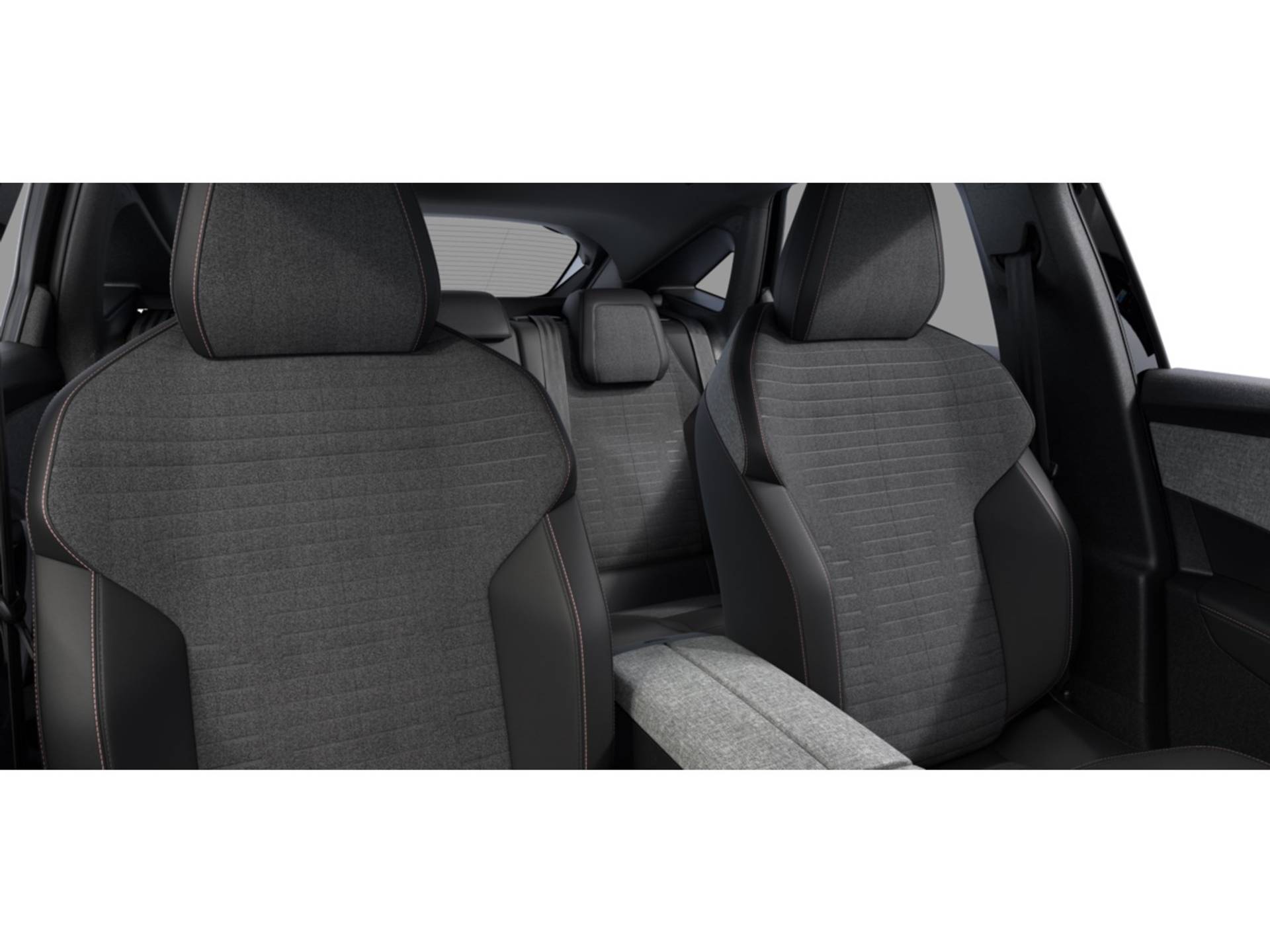 ✓ Middenconsole bekleed met gemêleerde stof RIMINI, glanzend zwart frontpaneel , strip in Stene Grey en armleuning bekleed met gemêleerde stof RIMINI