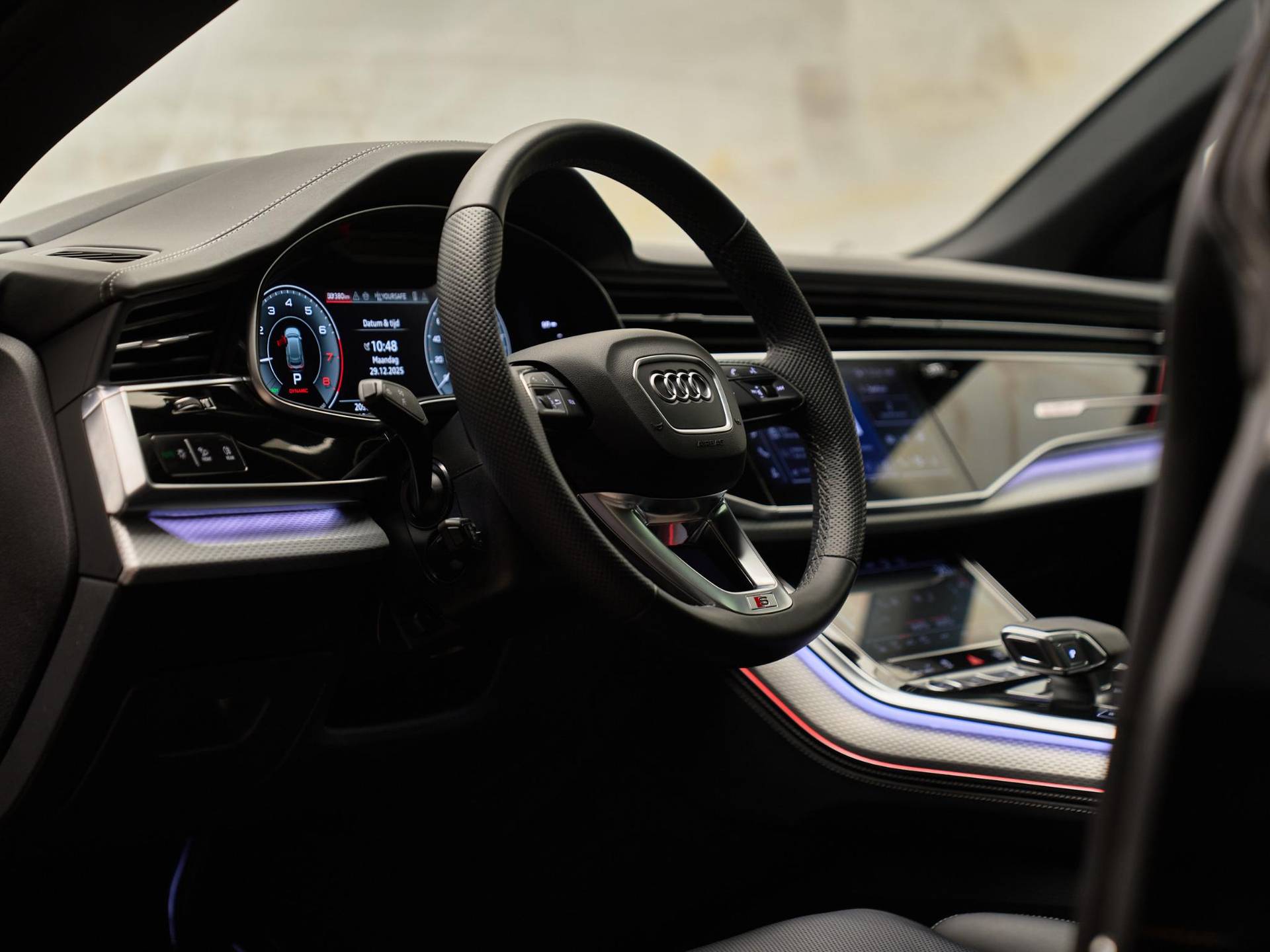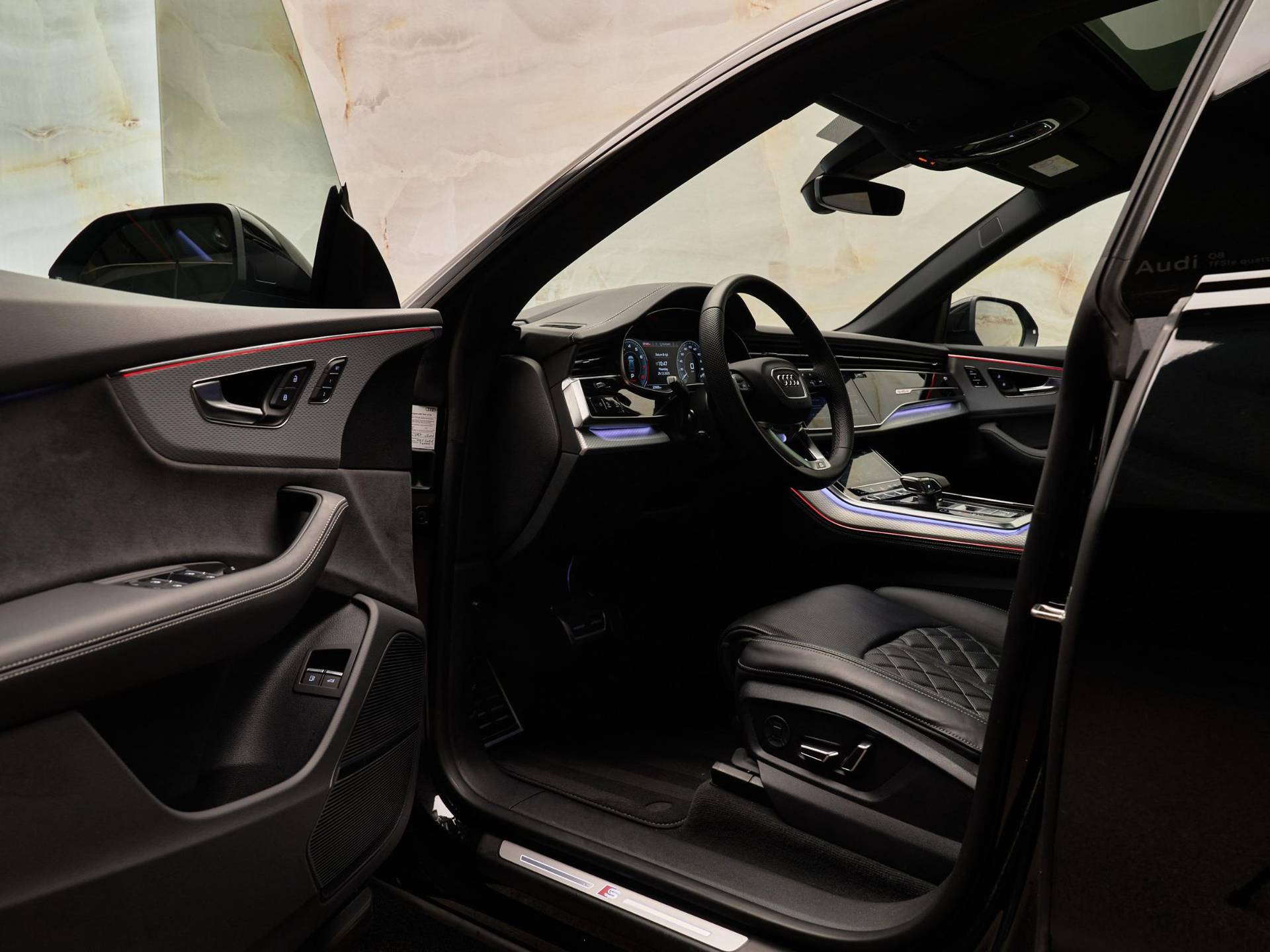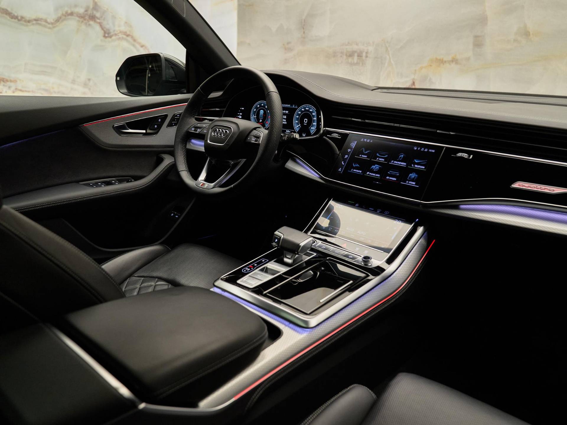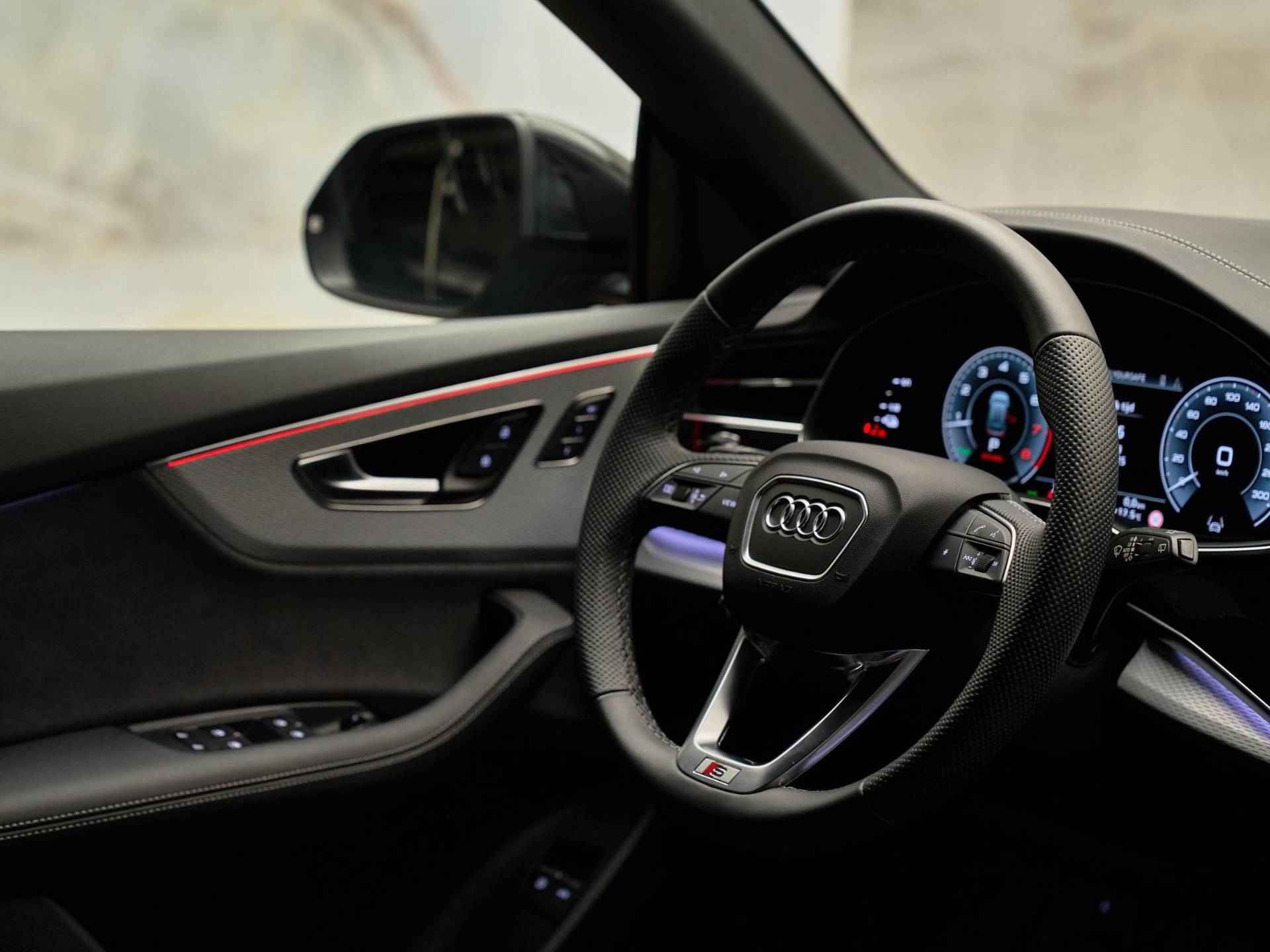 Het exterieur straalt kracht en verfijning uit met de Mythoszwart metallic lak (0E / Y9T), zwarte buitenspiegelhuizen (6FJ) en 23 inch Audi Sport lichtmetalen velgen (58U / FQ1). Binnenin vindt u een harmonie van design en kwaliteit, dankzij de leder Valcona bekleding met S-logo’s (N0Q), sfeervolle interieurverlichting plus (QQ2) en hoogwaardige decoratieve afwerkingen. De Q8 ademt pure premium klasse, tot in het kleinste detail.