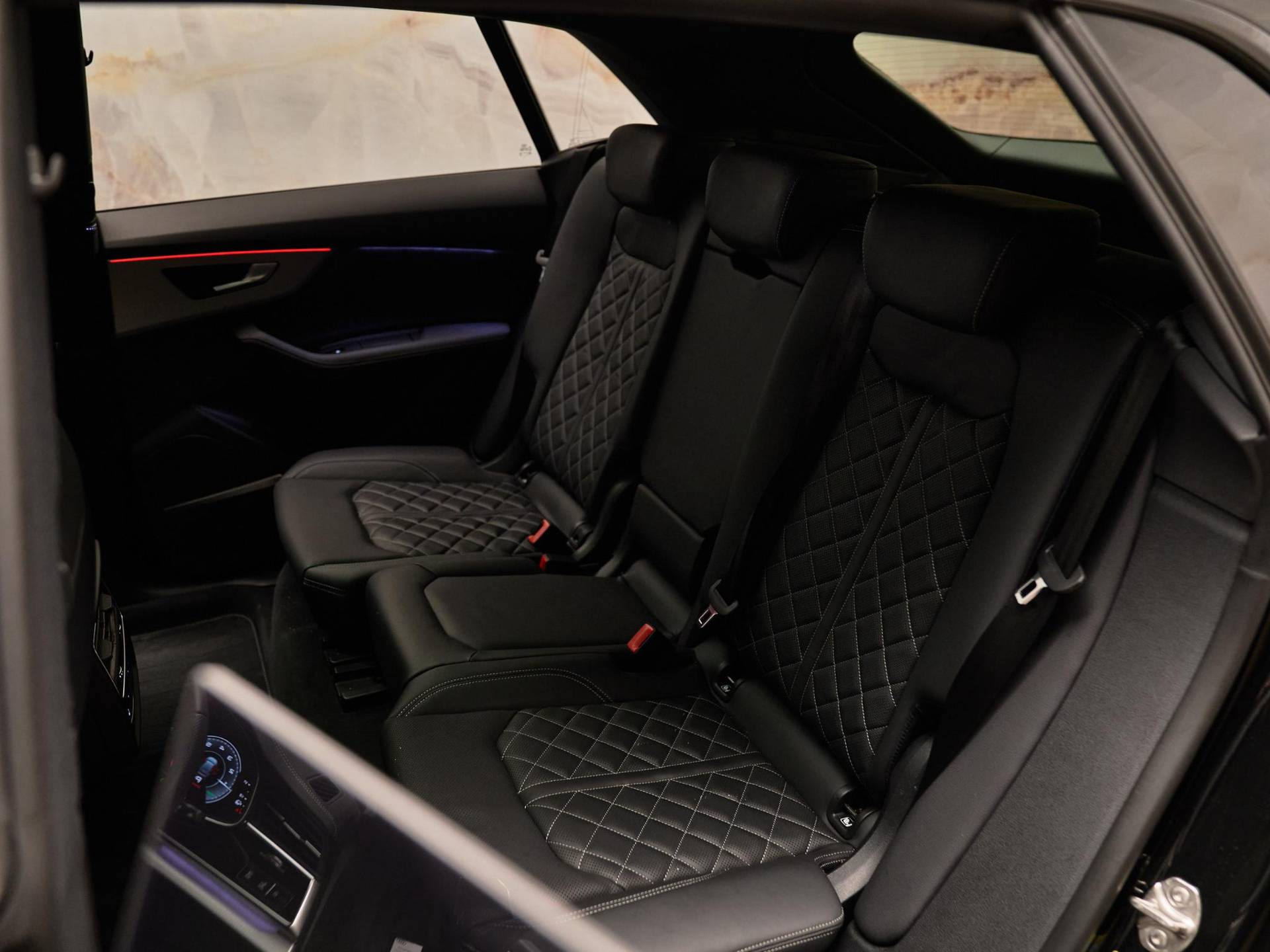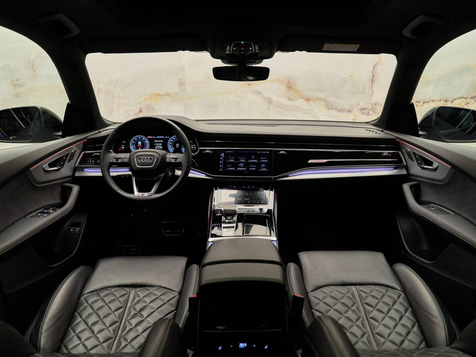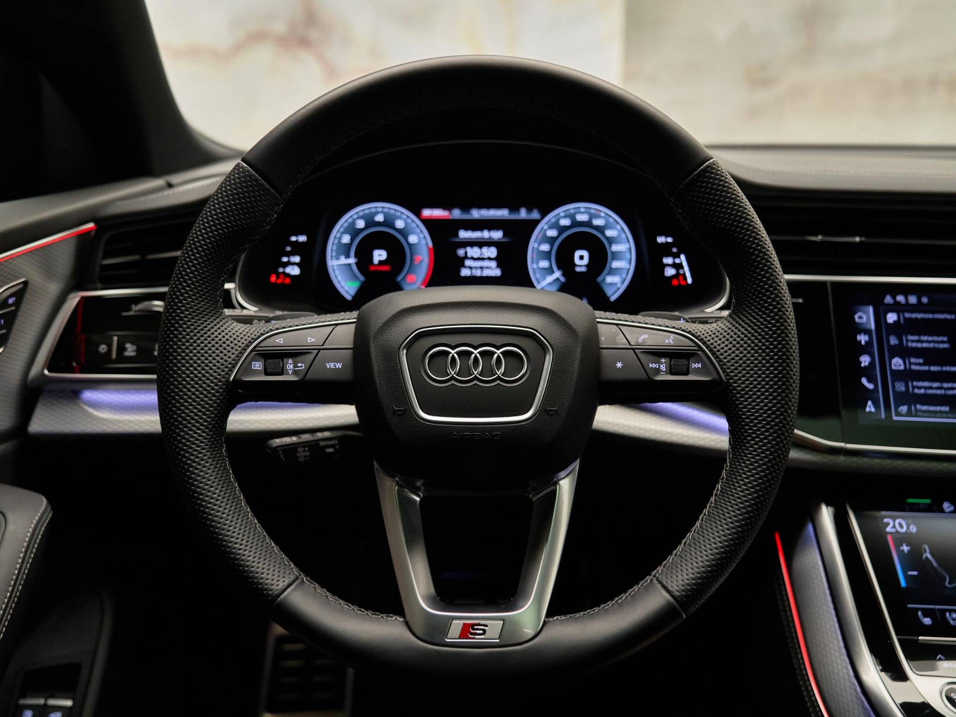 Het exterieur straalt kracht en verfijning uit met de Mythoszwart metallic lak (0E / Y9T), zwarte buitenspiegelhuizen (6FJ) en 23 inch Audi Sport lichtmetalen velgen (58U / FQ1). Binnenin vindt u een harmonie van design en kwaliteit, dankzij de leder Valcona bekleding met S-logo’s (N0Q), sfeervolle interieurverlichting plus (QQ2) en hoogwaardige decoratieve afwerkingen. De Q8 ademt pure premium klasse, tot in het kleinste detail.