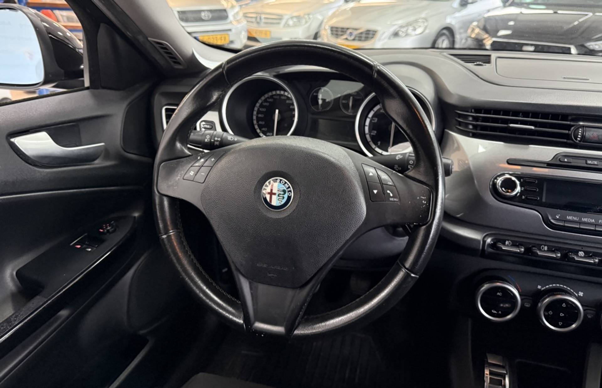 Dankzij automatische airconditioning is het interieur behaaglijk warm of verfrissend koel. Even switchen naar de verkeersinformatie? Ook dat kan met één druk op de knop van de audiobediening op het stuur. De parkeersensoren waarschuwen wanneer u te krap inparkeert of dat ene paaltje niet hebt gezien. De cruise control geeft elke flitser het nakijken. De uitrusting van deze Alfa romeo is met automatisch dimmende buitenspiegels en lederen stuur behoorlijk compleet.