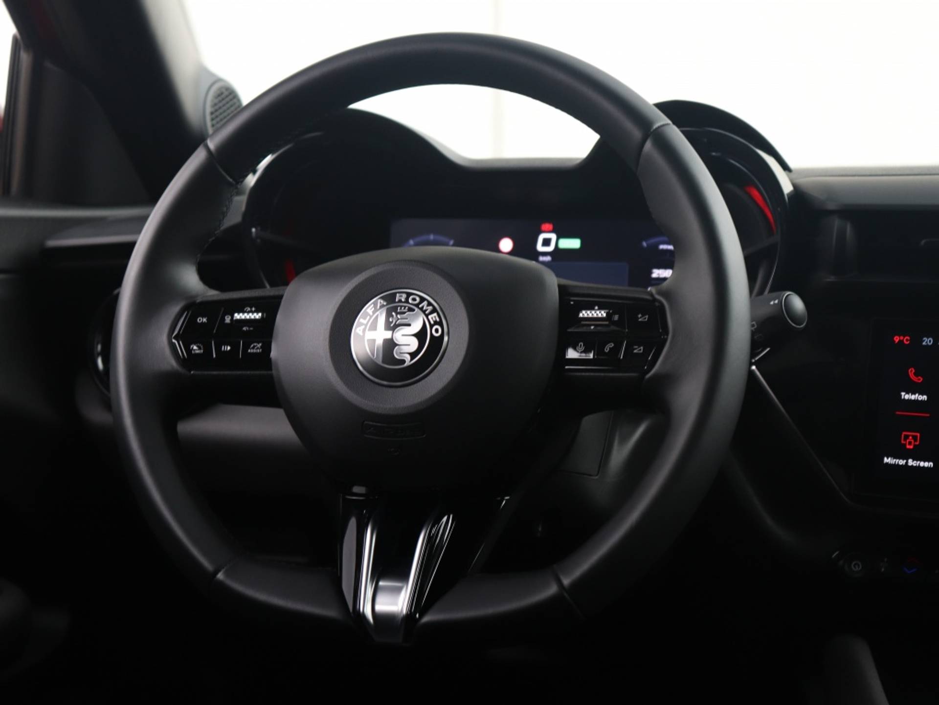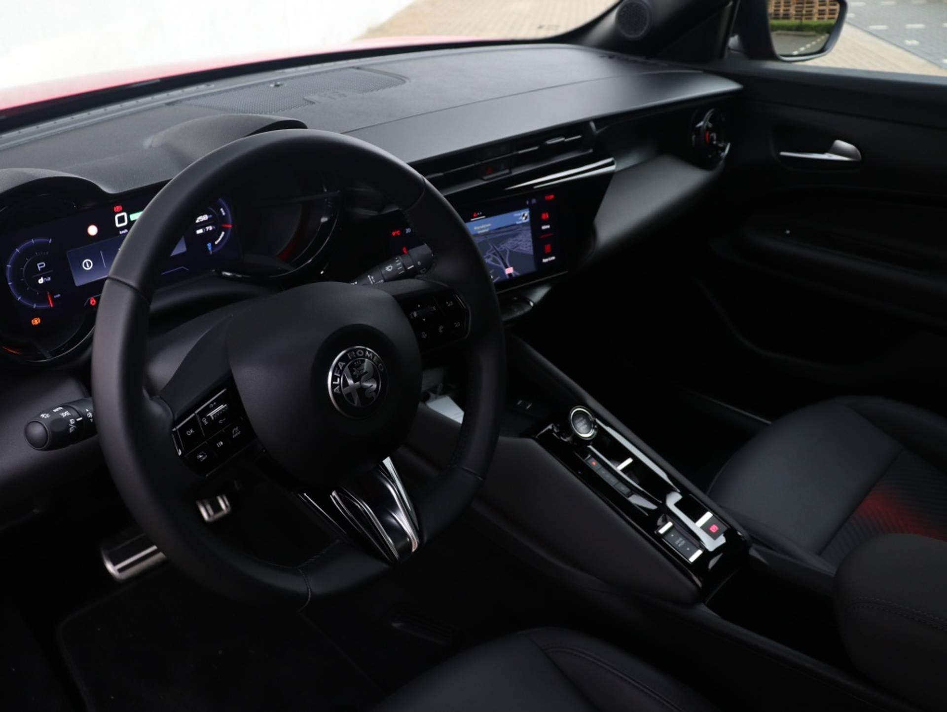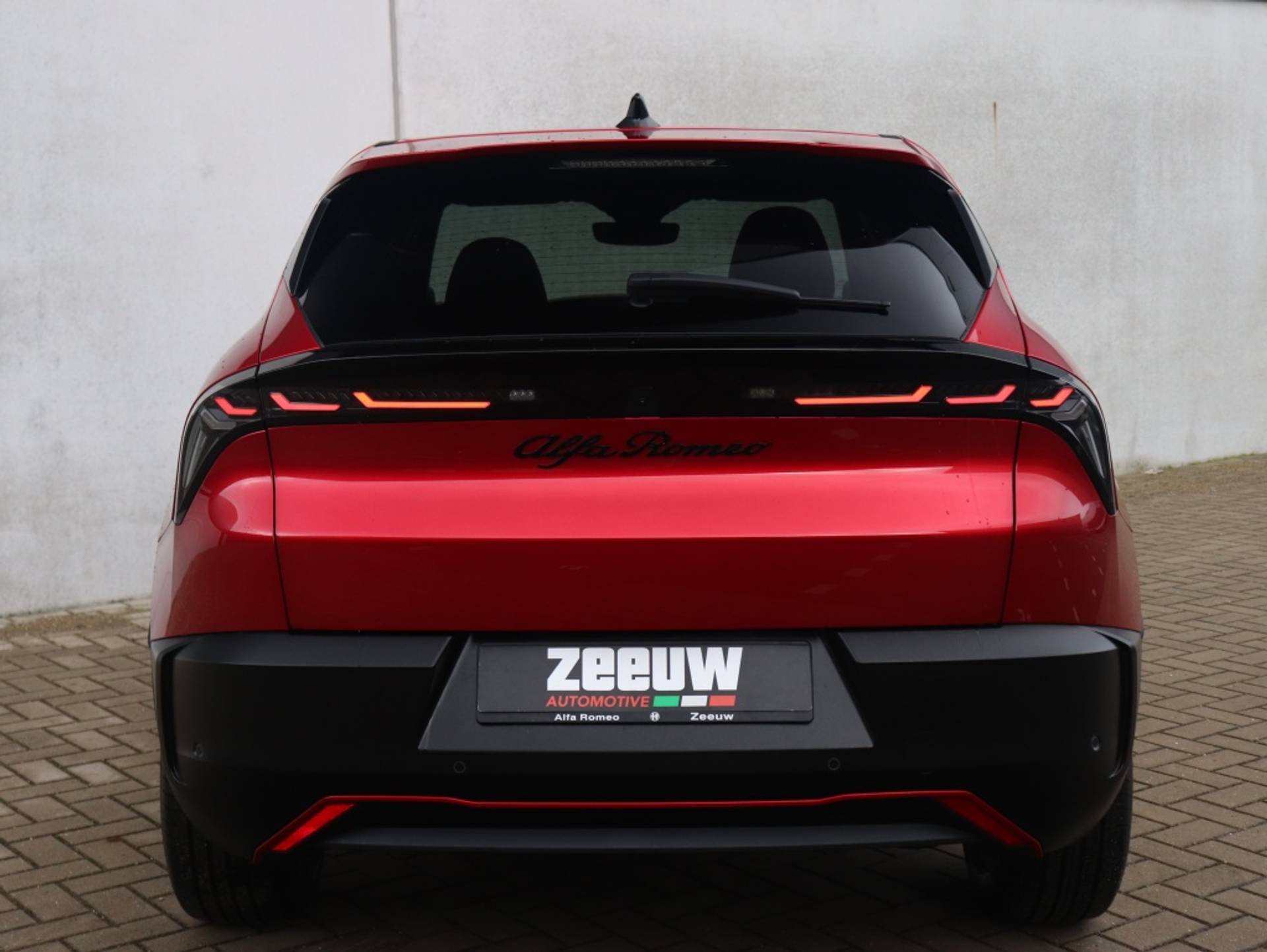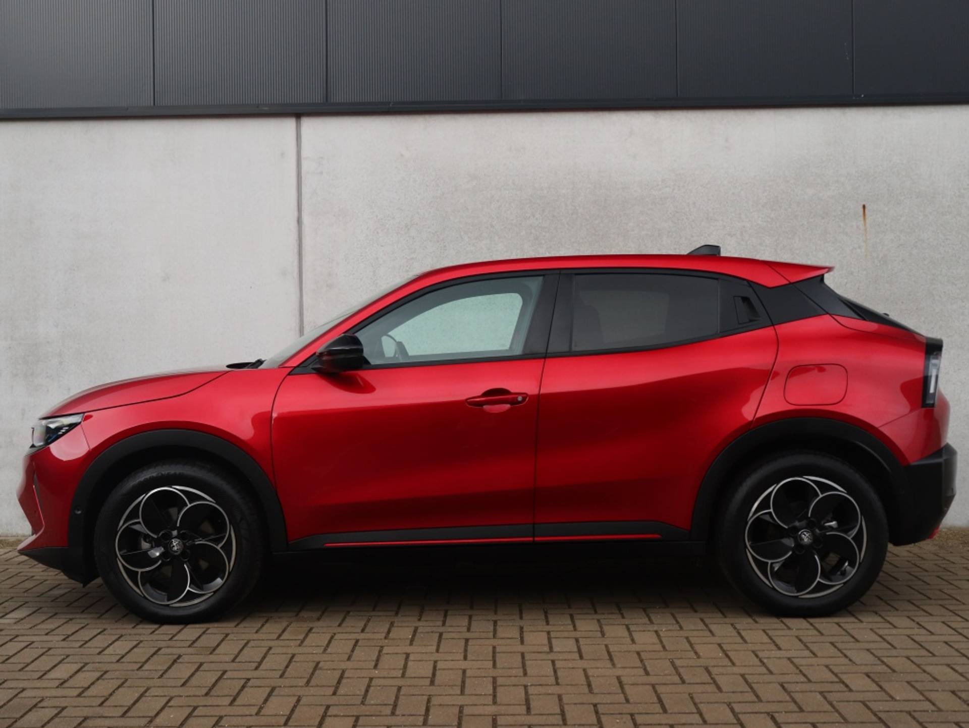Sportieve Alfa Romeo Junior Elettrica Speciale 54 kWh in de kleur Brera Red metallic. Tevens voorzien van Pack Techno en 18" Petalli velgen!