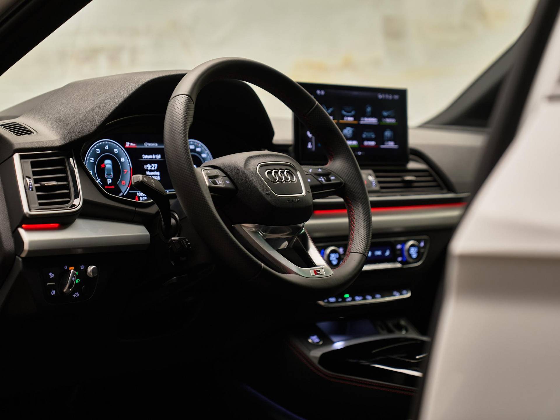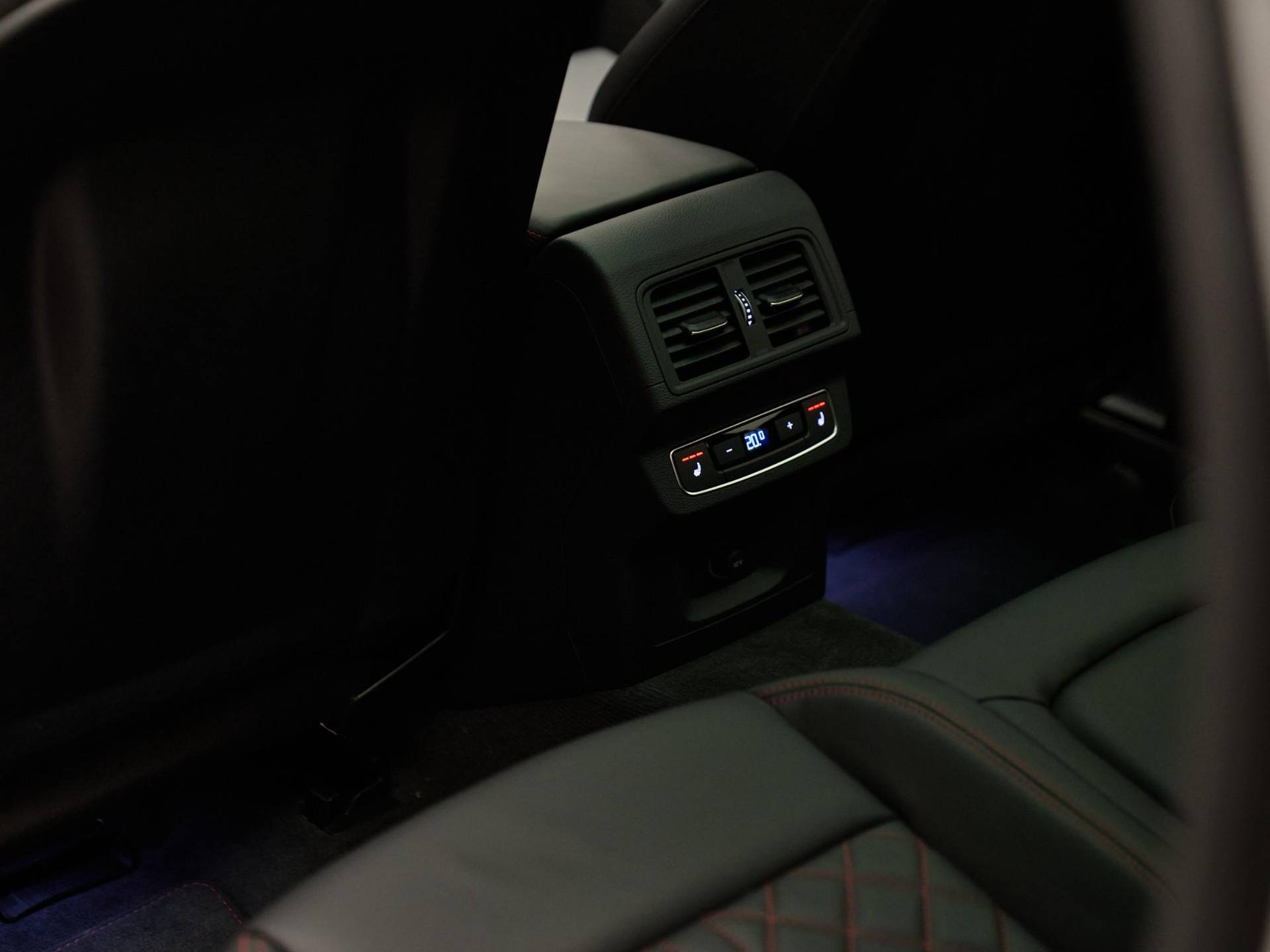 Het interieur onderscheidt zich door het S line interieur (WQS) met sportstoelen voorin (Q1D), uitgevoerd in leder fijnnappa (N2R) en afgewerkt met rode Audi Sport-stiksels (YYB). De voorstoelen zijn elektrisch verstelbaar met geheugenfunctie (PV3) en beschikken over 4-voudig instelbare lendensteunen (7P1). Daarnaast is de auto voorzien van stoelverwarming voor- en achterin (4A4), automatische airconditioning met drie zones (9AQ) en het lichtpakket plus met ambient lighting (QQ2). Het glazen panoramadak (3FU) zorgt voor een lichte en ruimtelijke sfeer in het interieur.
