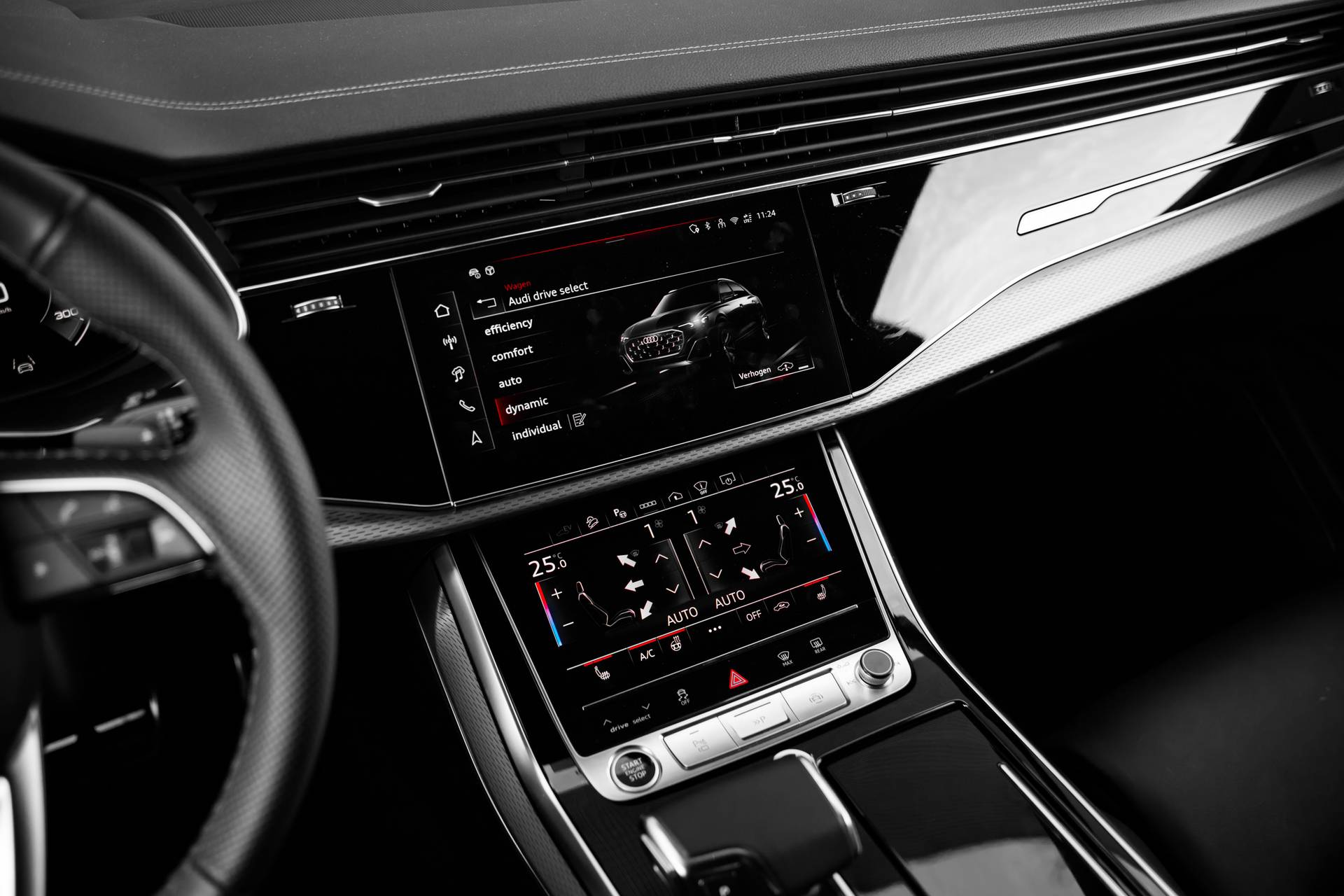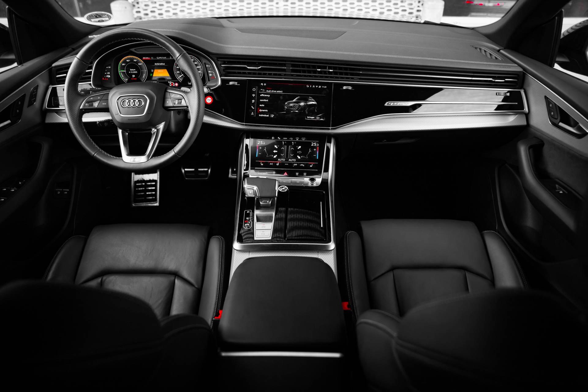 Model nu, design nu, kwaliteit nu, technologie nu. Een fijne jonge Audi Q8 voor een occasionprijs. Zuinig, slim en milieuverantwoord! Deze hybride auto combineert een verbrandingsmotor en een elektromotor: voordelig rijden en gunstig in onderhoud. We nemen u in gedachten even mee. Stop uw bagage moeiteloos achterin dankzij de elektrisch bediende achterklep, neem plaats achter het stuur en zie meteen het luxe lederen interieur. Even het elektrisch bediende glazen panorama dak open en rijden maar! Last van de vorst? Door de stoelverwarming zit u in ieder geval vorstelijk! Natuurlijk kunt u zonder. Maar waarom? Lekker toch, zo'n verwarmd stuurwiel? Bij de rijke uitrusting horen ook 20 inch lichtmetalen velgen, LED koplampen, warmtewerend glas, trailer assistent, dakspoiler en LED-achterlichten. Het slim uitgedachte digitale dashboard toont alle essentiële ritinformatie in één oogopslag. Met de 360 graden camera kunt u elk obstakel of gevaar rondom de auto detecteren, wat uw veiligheid verhoogt. Waar u zelf ook bent, u staat altijd in contact met de auto via de app op uw smartphone. Zo controleert u uiteenlopende functies, ook op afstand. Nooit meer de weg kwijt: daarvoor zorgt het onboard full map navigatiesysteem. De achteropkomend verkeer waarschuwing is een mooie veiligheidsoptie, die middels sensoren in de gaten houdt wat er onderweg achter u gebeurt. Ook is de Audi uitgerust met: kruisend verkeer detectie, electronic climate control, draadloos opladen, DAB ontvangst, regensensor en cruise control. Zoals u mag verwachten van deze Audi Q8 is hij uitgerust met een reeks aan actieve veiligheidssystemen. Dashboardinfo checken zonder uw ogen van de weg te halen? Dat kan met de head-up display. In het instrumentarium kunt u bovendien de verkeersborden zien die u onderweg tegenkomt. Zo helpt deze Audi u om veiliger te rijden. Ongemerkt buiten de rijstrook raken? Nee hoor, het Lane-keeping systeem waarschuwt en corrigeert. Verder is deze auto uitgerust met dodehoekdetectie, forward collision warning system, hill hold functie en frontale botsbescherming. Is uw nieuwsgierigheid gewekt? Bel ons dan snel om deze auto te komen bekijken.