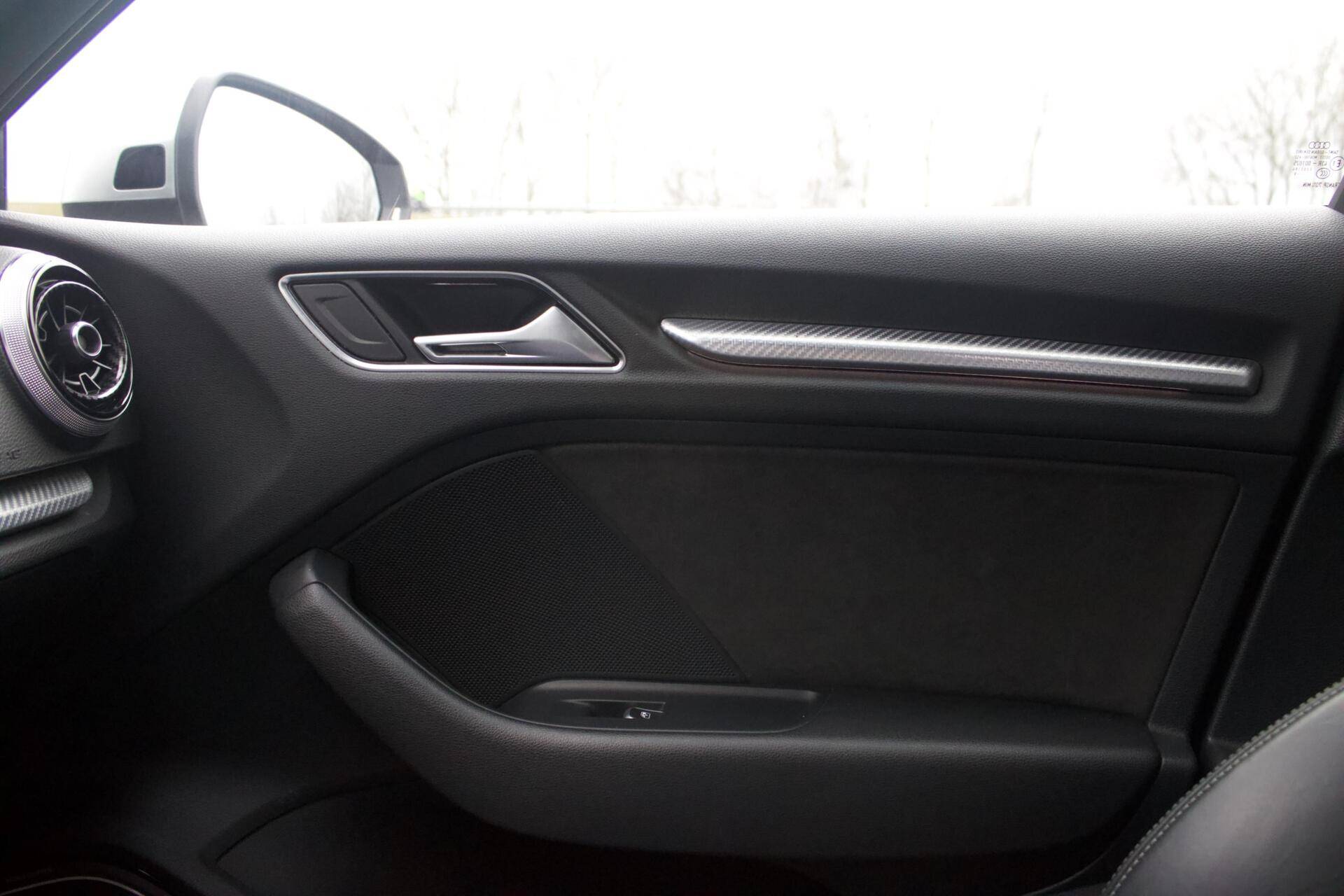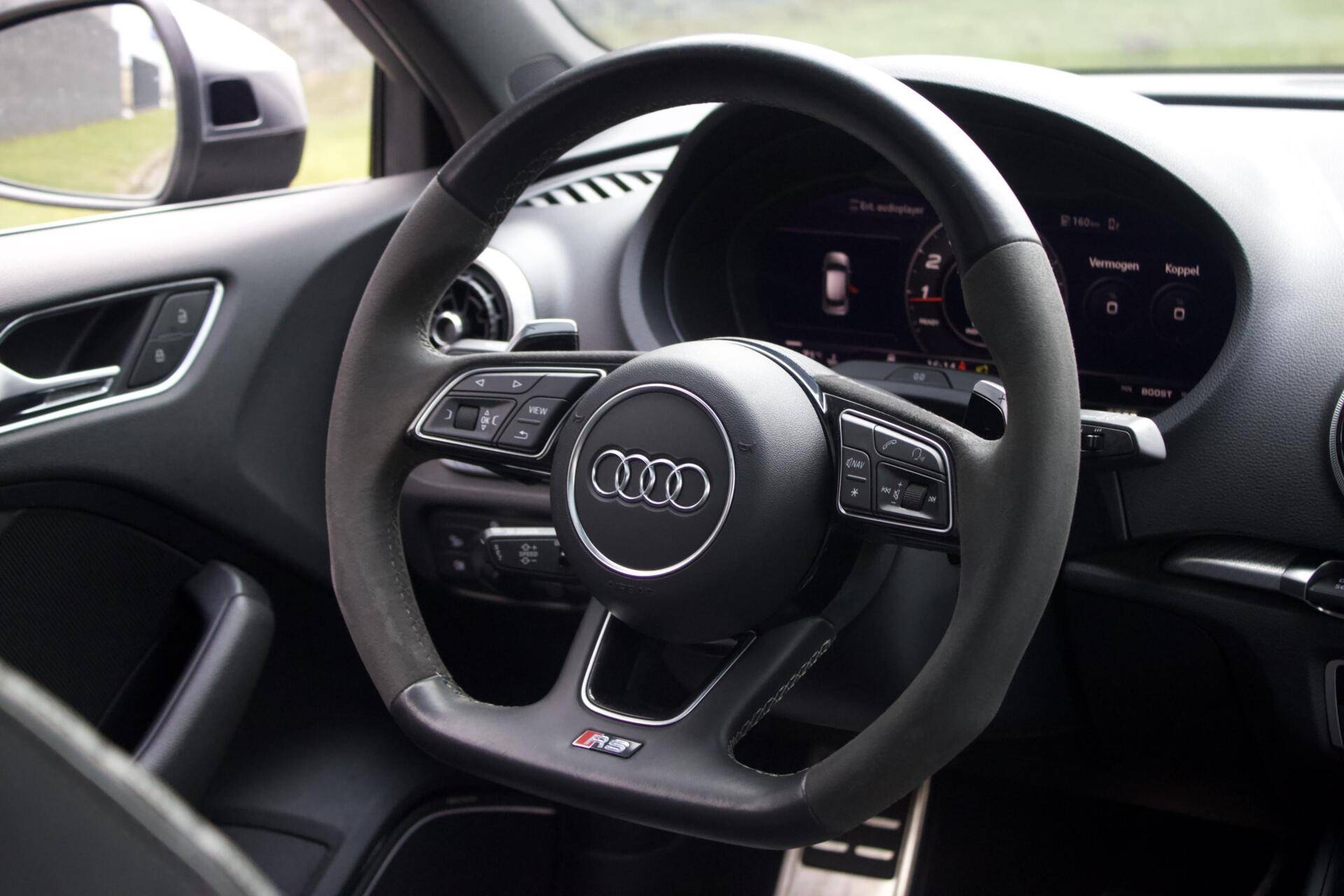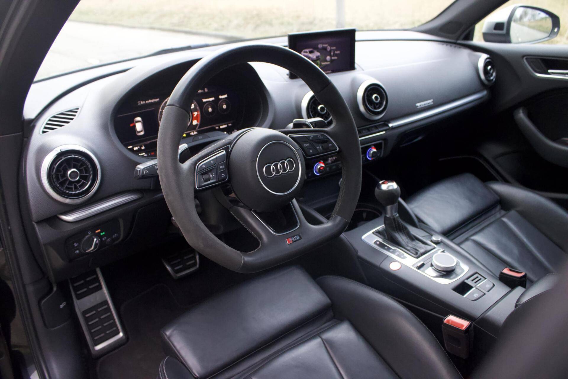 Deze Audi RS3 is verre van standaard uitgevoerd. Denk aan 19” lichtmetalen velgen, Bang & Olufsen geluidssysteem, nappa lederen bekleding en achteruitrijcamera, maar het meest opvallende is de Audi Magnetic Ride. Dit is Audi’s benaming voor het adaptieve onderstel. Je kunt dus de hardheid van de schokdempers instellen, dit betekent dat je in ‘Comfort’ comfortabeler rijdt en in ‘Dynamic’ nog sportiever kan rijden dan bij het standaard onderstel.