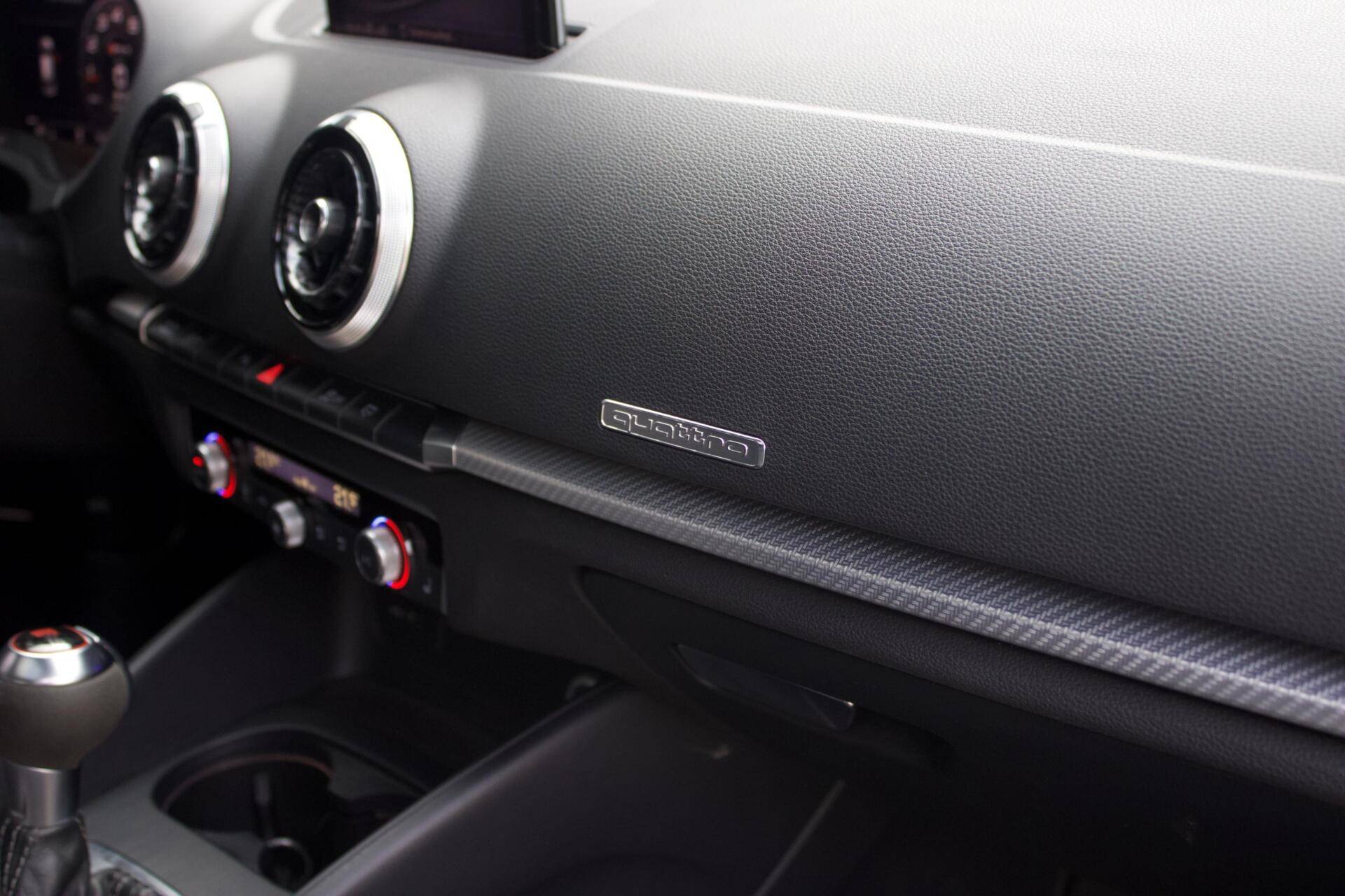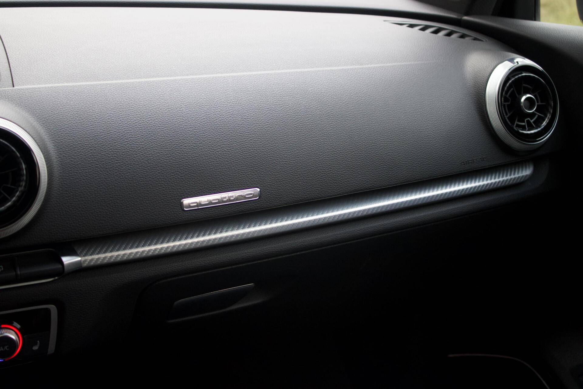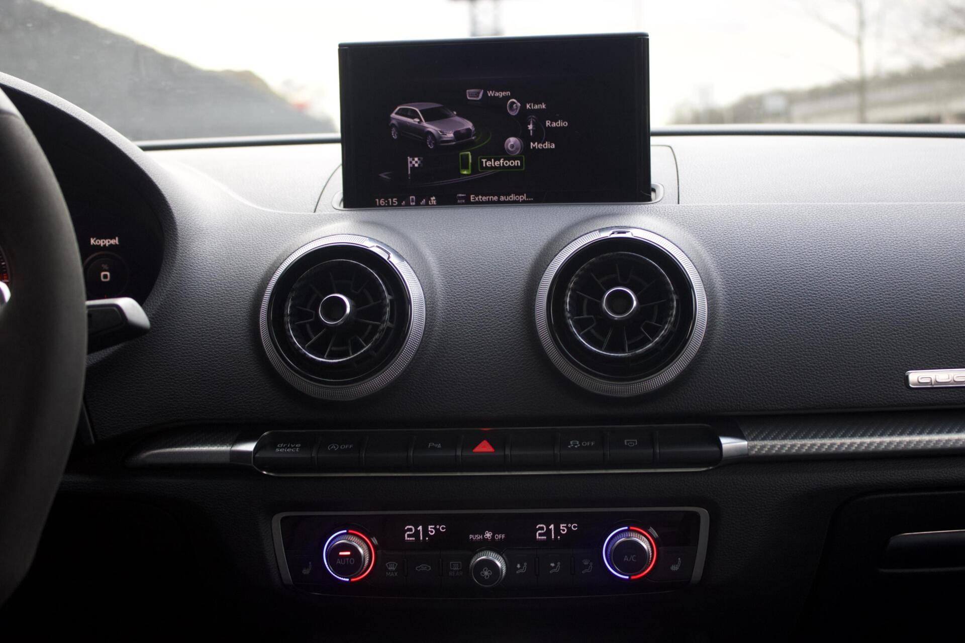 Deze Audi RS3 is verre van standaard uitgevoerd. Denk aan 19” lichtmetalen velgen, Bang & Olufsen geluidssysteem, nappa lederen bekleding en achteruitrijcamera, maar het meest opvallende is de Audi Magnetic Ride. Dit is Audi’s benaming voor het adaptieve onderstel. Je kunt dus de hardheid van de schokdempers instellen, dit betekent dat je in ‘Comfort’ comfortabeler rijdt en in ‘Dynamic’ nog sportiever kan rijden dan bij het standaard onderstel.