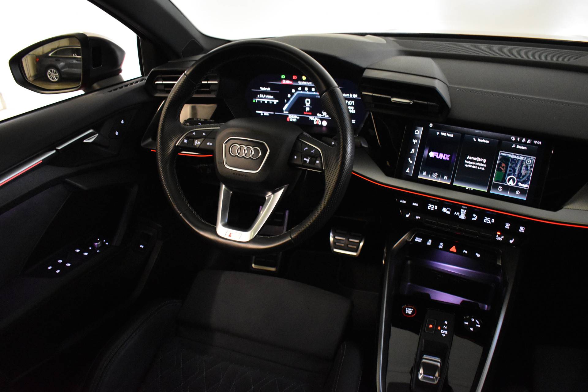 Deze Audi S3 Limousine is voorzien van vele opties en sportieve extra's o.a.: Origineel navigatiesysteem/multimedia/bluetooth, Apple Carplay, draadloze telefoon oplader, boordcomputer, alcantara / lederen S - line sportstoelen met stoel verwarming, automatische airco, parkeersensoren voor en achter met camera, led verlichting, buitenspiegels elektrisch inklapbaar verstelbaar en verwarm baar, Audi drive select, chromen sierlijst, sfeerverlichting, 18 inch lichtmetalen S -line velgen, panoramadak, Head-up display, adaptive cruise-control, matrix led koplampen, en nog veel meer!