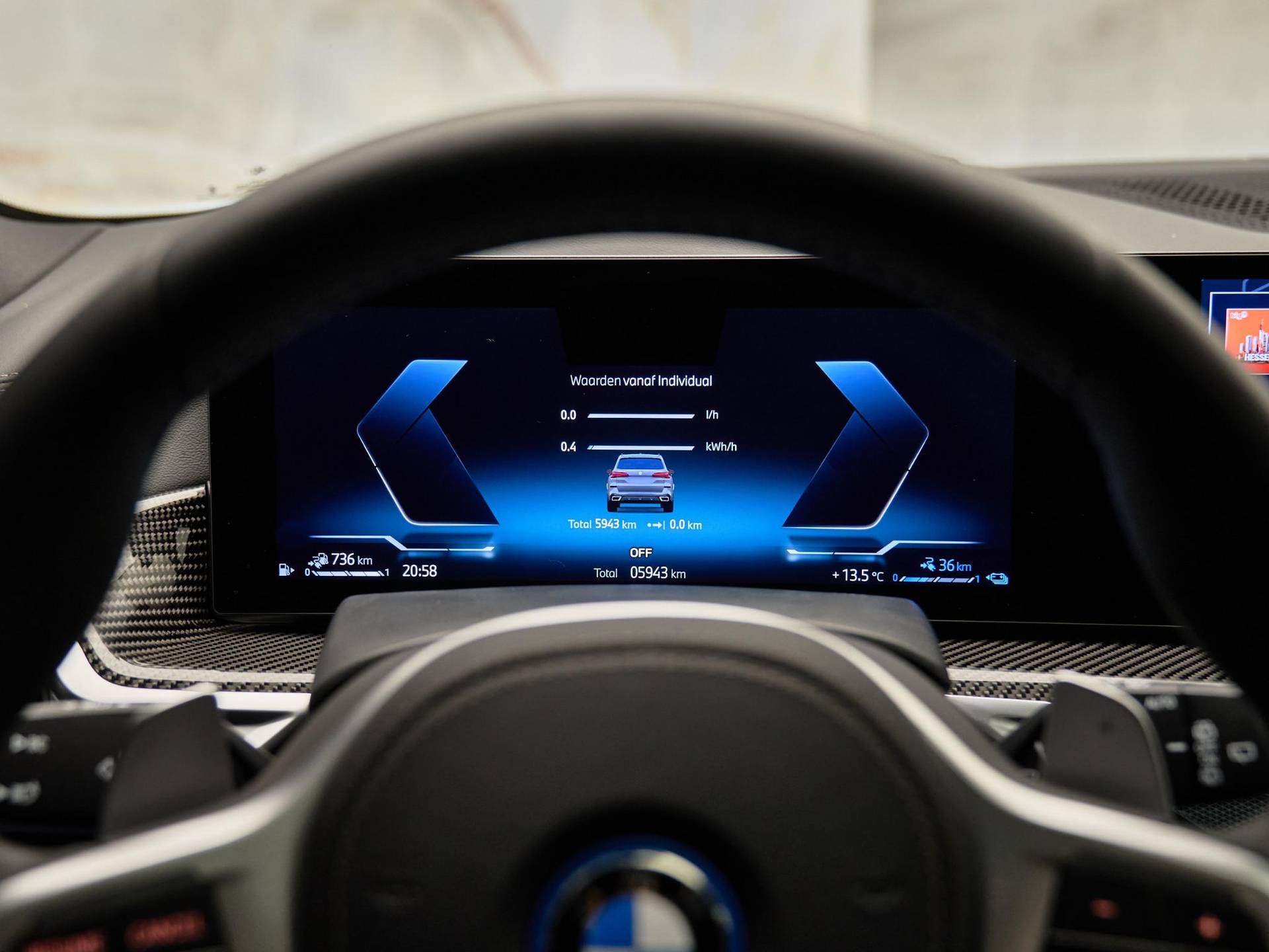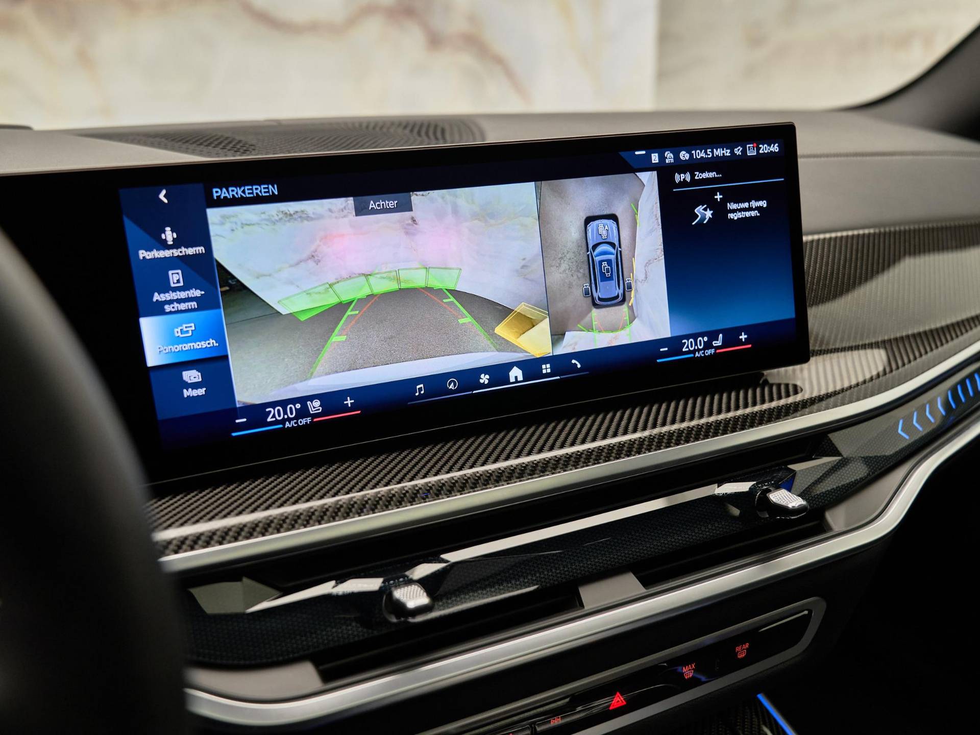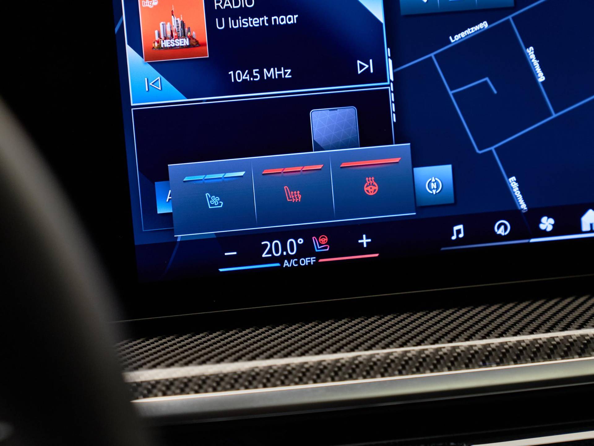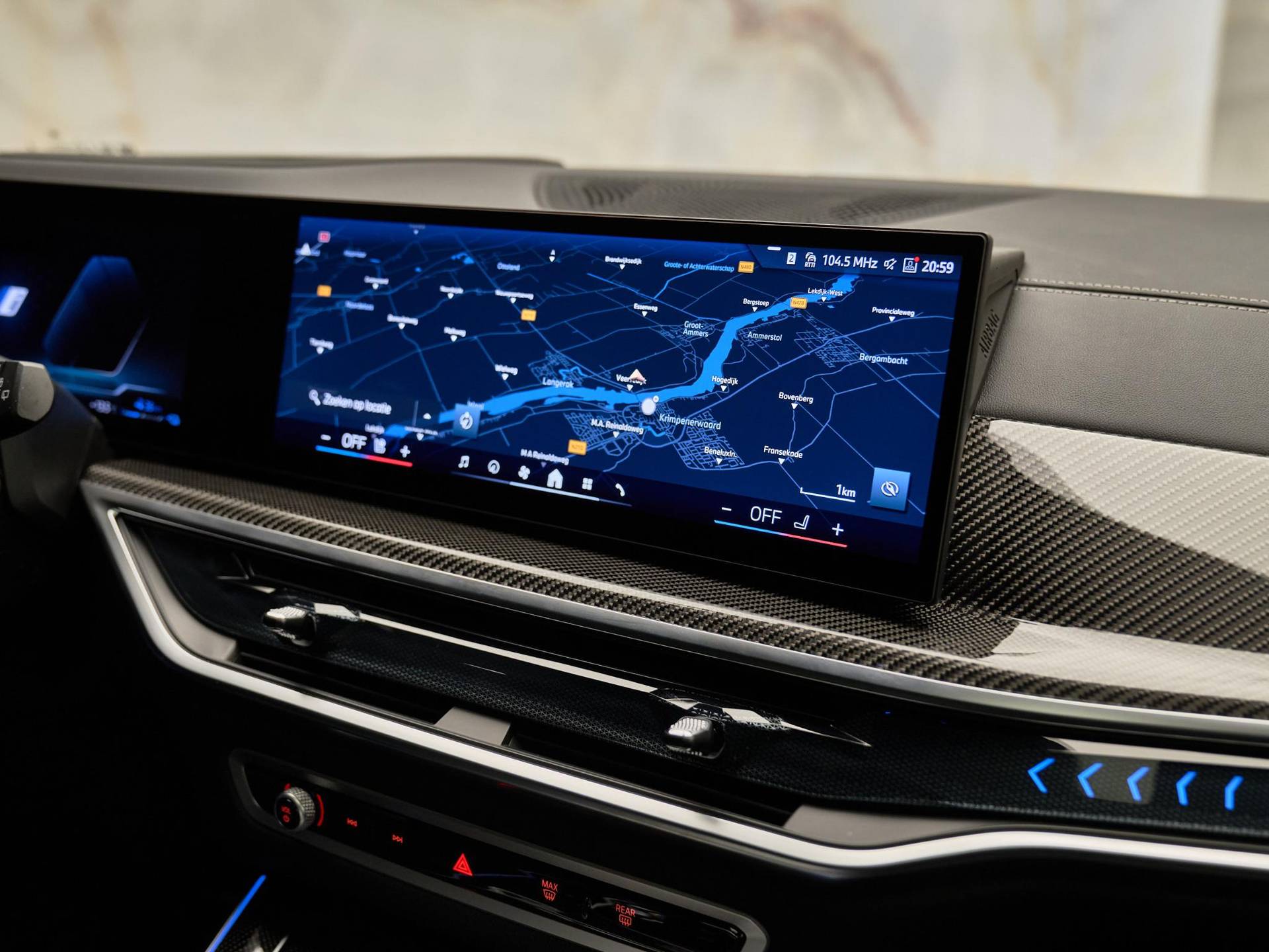 Binnenin valt direct de hoogwaardige afwerking op: BMW Individual dashboard met leder bekleed (S4M5A), M Carbon Fibre interieurlijsten (S4MCA) en Ambiance verlichting (S4URA) creëren een premium sfeer. Het Ambient Air pakket (S4NMA) parfumeert en filtert de lucht in het interieur, terwijl de M Hemelbekleding in Anthrazit (S775A) de sportieve look compleet maakt.