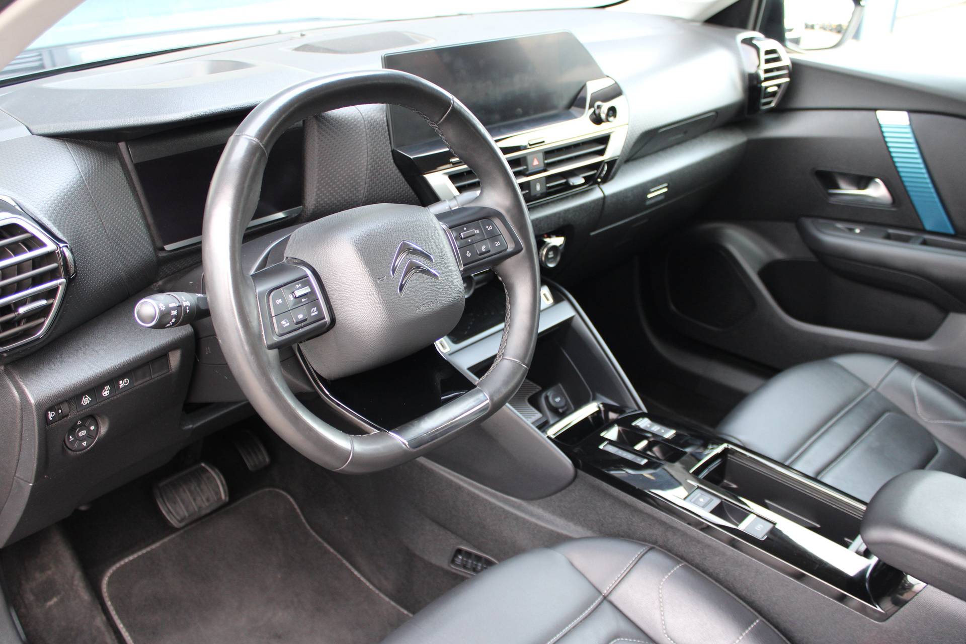 Hij is doordacht innovatief en duurzaam als geen ander: de elektrische Citroën ë-C4 biedt met zijn elektrische aandrijving een ongekende rijervaring. Gas geven is er met de elektromotor niet meer bij. Stil snelheid maken wel! Dit is een splinternieuwe auto, die nu uit voorraad leverbaar is. Het lederen interieur ademt luxe, en het zit uiteraard fantastisch. Bestuurder en bijrijder krijgen een warm welkom: de verwarmbare voorstoelen zijn bovendien voorzien van massagefunctie. De comfortstoelen zorgen voor een optimale zithouding onderweg. Koude handen? Da's voorbij met het verwarmd stuurwiel. Pak aan! Tot de uitrusting behoren ook 18 inch lichtmetalen velgen, Full LED koplampen, adaptief dempingsysteem, geluidsisolerende ramen, in delen neerklapbare achterbank en verstelbare lendensteunen. Met het digitale dashboard van deze auto is de aanpassing van uw cockpitinterface een fluitje van een cent. Kom maar, kom maar, kom maar... ho! Prettig hoor, zo'n achteruitrijcamera. Als u de adaptive cruise control inschakelt, regelt de auto zelf de snelheid en de afstand tot de auto voor u. Net als een smartphone of een slimme speaker kunt u deze auto bedienen met stemcommando's. Deze auto gaat met u in gesprek. Hij vertelt u dankzij remote services alles over de status van diverse onderdelen en laat zich desgevraagd ook activeren. Gewoon via uw smartphone. Natuurlijk behoren premium audiosysteem, navigatiesysteem, achteropkomend verkeer waarschuwing, automatische airconditioning, draadloos opladen en DAB ontvangst ook tot de uitrusting van deze complete auto. Aan boord van deze Citroën houden verschillende geavanceerde systemen voor u de weg in de gaten. Ze waarschuwen u voor noodsituaties en kunnen in een aantal gevallen ook zelf ingrijpen. Route- en rij-info aflezen van de voorruit? Met de head-up display hoeft u uw ogen geen seconde van de weg te halen! In het instrumentarium laat de verkeersborddetectie de actuele verkeersborden zien. Het Lane-keeping systeem let constant op en waarschuwt of corrigeert als u onoplettend over de lijnen van de rijstrook gaat. In deze Citroën vinden we verder een dodehoekdetectie, forward collision warning system, hill hold functie, brake assist, vermoeidheidsherkenning en bandenspanningcontrolesysteem. Natuurlijk is dit een splinternieuwe auto en hij wordt dus geleverd met volledige fabrieksgarantie. Daarbij kunnen we u verschillende gunstige financieringsvormen aanbieden. We maken graag een afspraak met u.