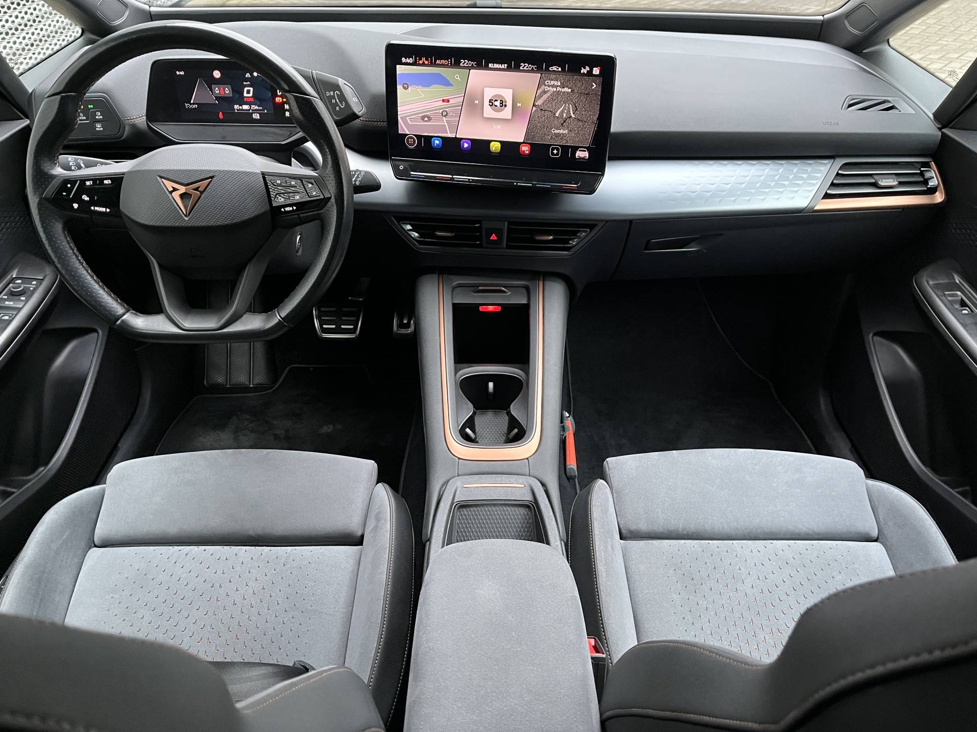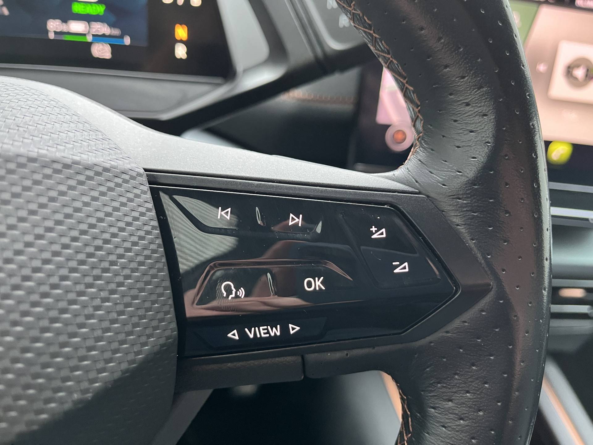 Het digitale dashboard is een perfecte bijrijder. Alles benodigde informatie is permanent zichtbaar of opvraagbaar. Bij het inparkeren hoef je het laatste stukje niet te gokken: de achteruitrijcamera kijkt voor je uit. Met adaptive cruise control houdt deze auto automatisch afstand tot jouw voorligger. Kilometerstand? Oliepeil? Accuspanning? Allemaal te zien via de app. Overal. Altijd. Dankzij Connected Services. Het full map navigatiesysteem en het audiosysteem (met DAB-ontvangst!) bedien je met knoppen op het stuur of met gesproken commando's. Deze CUPRA is voorzien van automatische airconditioning, draadloos opladen, regensensor, sportstuurwiel, keyless entry en automatisch dimmende binnenspiegel.