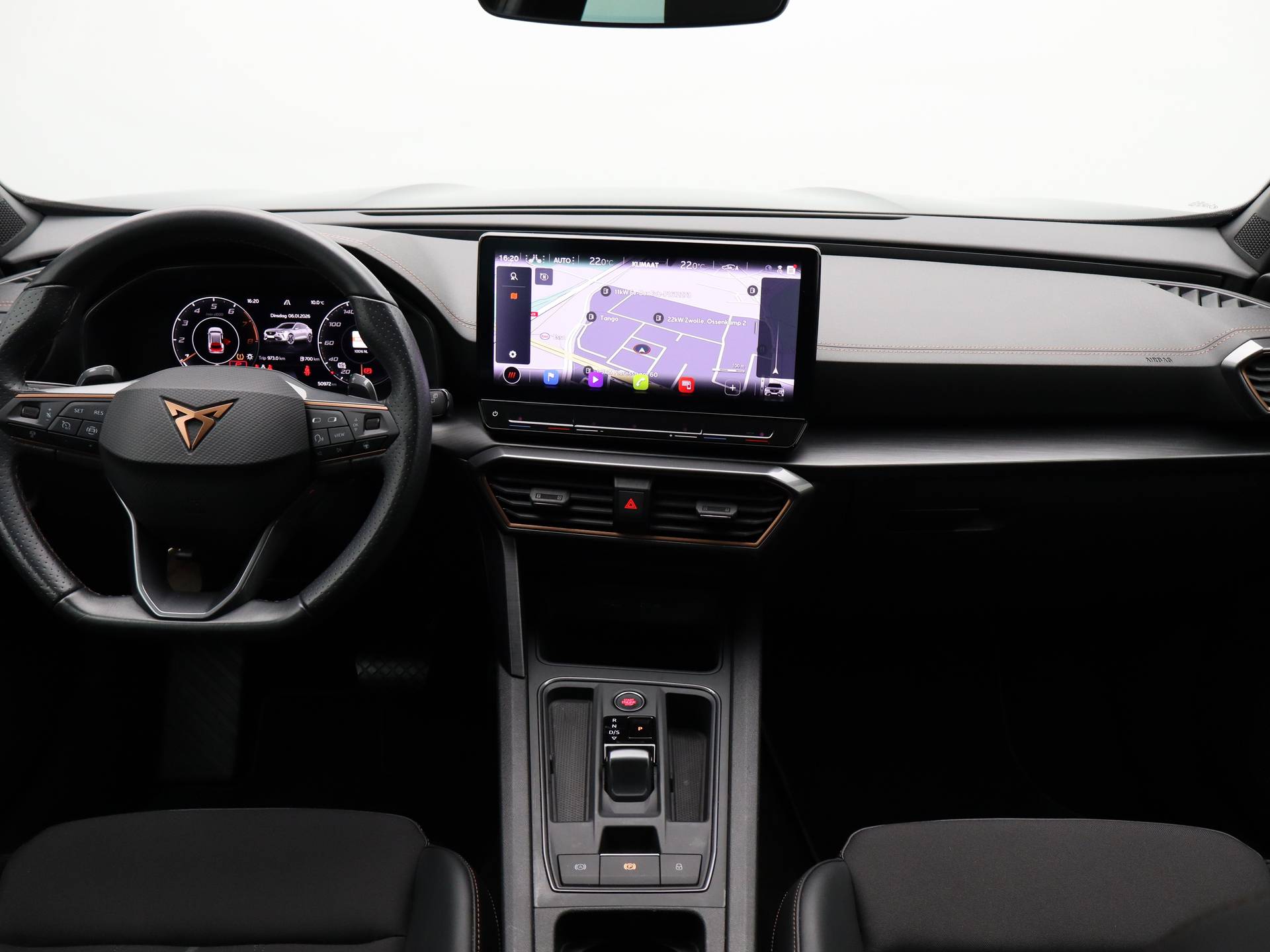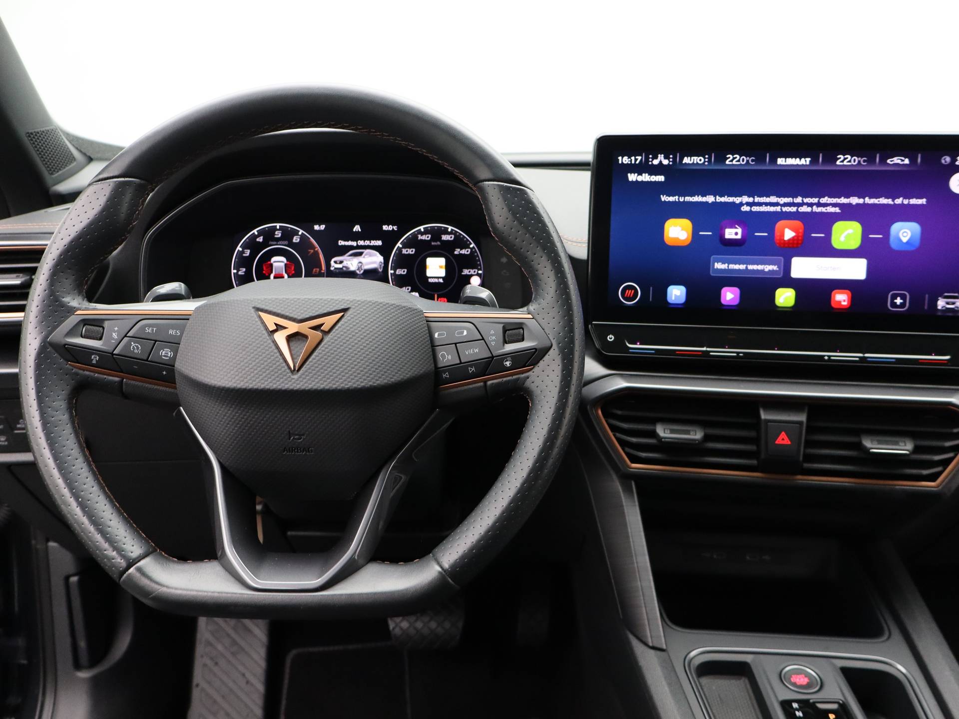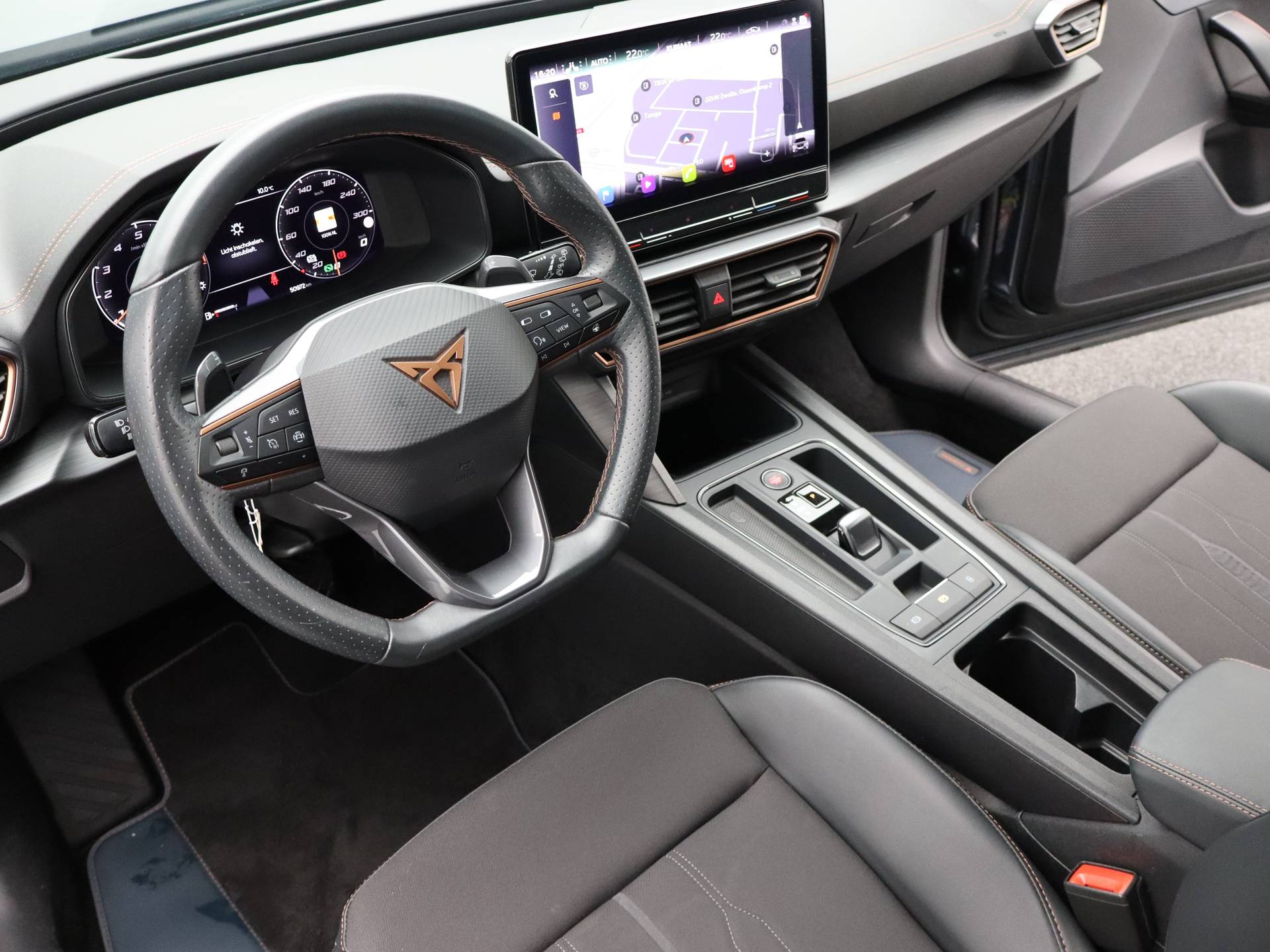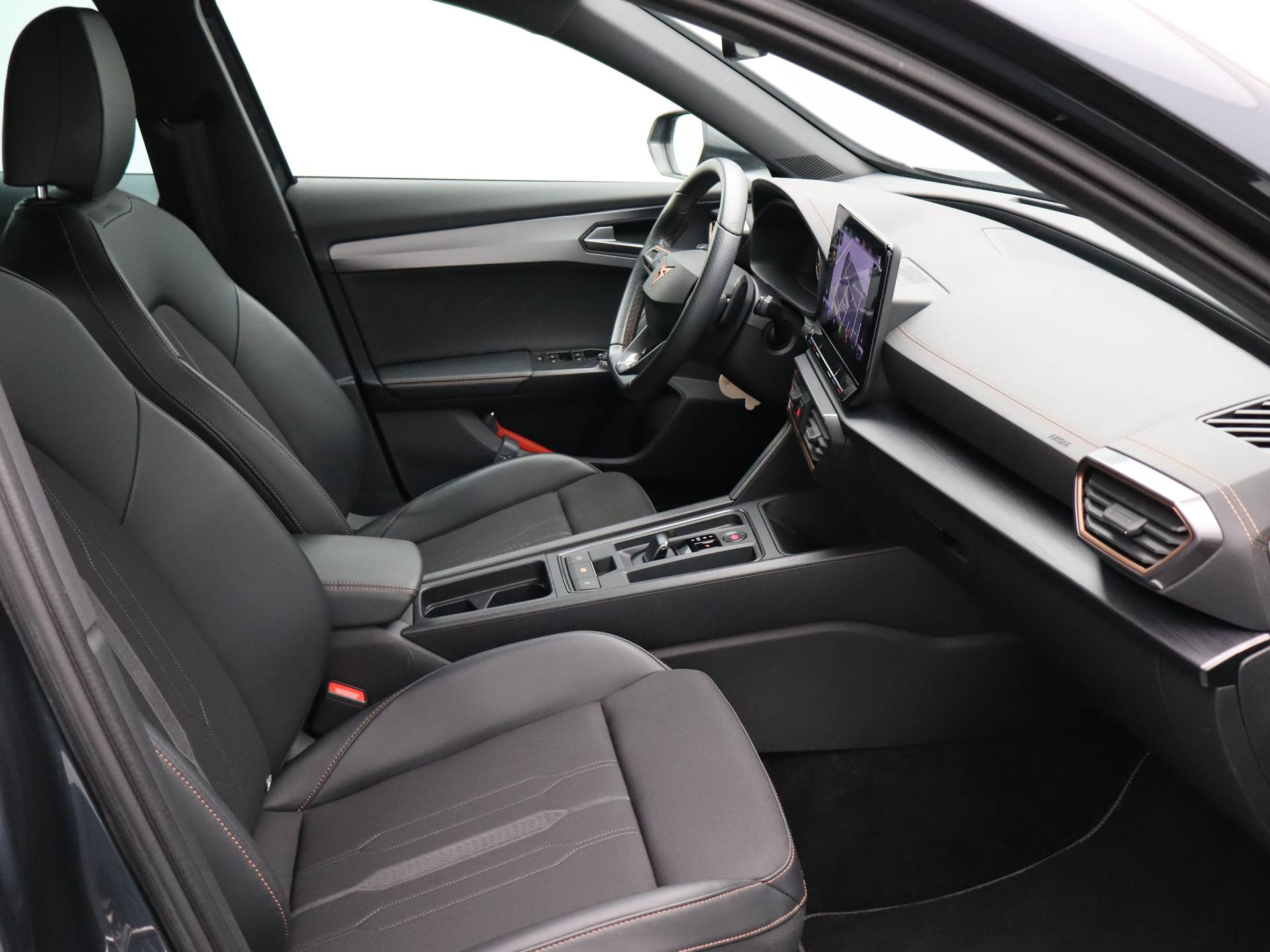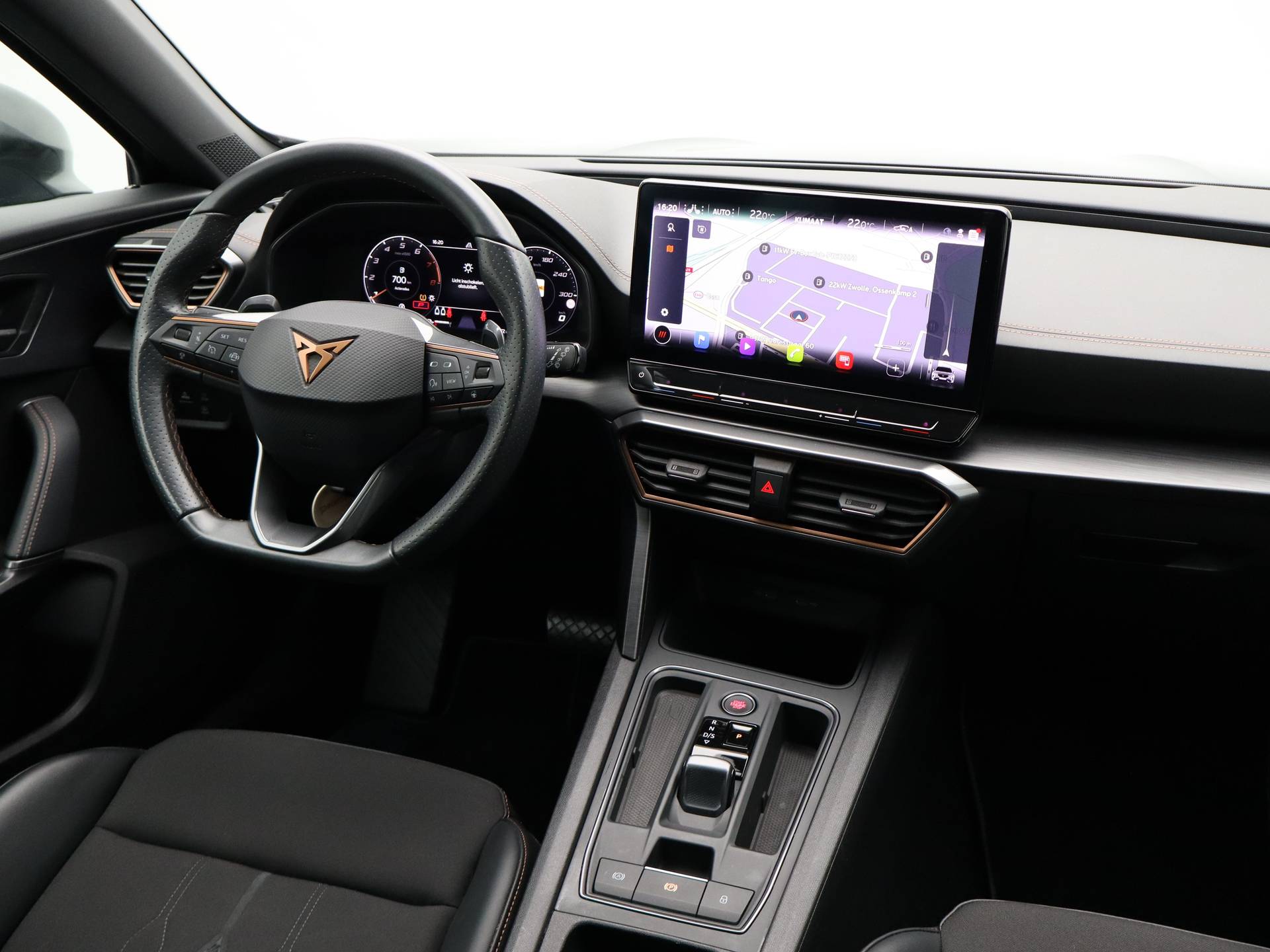 Met een auto als deze CUPRA Formentor komt u absoluut goed voor de dag. Deze auto komt uit 2022. De aandrijving komt voor rekening van een benzinemotor en een automatische transmissie. Er is een rijke uitrusting aanwezig in deze auto, waar onder meer ook stoelverwarming bij hoort. Pak aan, 't is winter! Zo'n verwarmd stuurwiel is dan bijzonder prettig! De uitmonstering van deze auto wordt gecompleteerd door onder meer 18 inch lichtmetalen velgen, Full LED koplampen, extra getint glas, in delen neerklapbare achterbank, LED-achterlichten en verstelbare lendensteunen. Het digitale dashboard is qua lay-out en zichtbaarheid superslim ingedeeld. Alle functies in één keer in beeld! De achteruitrijcamera laat duidelijk zien hoeveel ruimte u nog heeft bij het inparkeren. Adaptive cruise control houdt de ingestelde snelheid vast en houdt afstand tot het voertuig voor u. De speciale app verbindt met Connected Services, die de status van vitale functies bijhoudt en waarschuwt als u bijvoorbeeld moet tanken, de bandenspanning moet controleren of olie moet bijvullen. Voor de veiligheid op de weg is het goed dat u uw ogen op de weg kunt houden en uw handen aan het stuur. Want het audio-installatiesysteem, met DAB-ontvangst, en het navigatiesysteem bedient u vanaf het stuurwiel en met spraakbediening. Ook achteropkomend verkeer waarschuwing, automatische airconditioning, regensensor, keyless entry en automatisch dimmende binnenspiegel horen tot de voorzieningen op deze auto. Als bestuurder van deze CUPRA bent u nooit alleen. U wordt onderweg bijgestaan door technologische hulpmiddelen die samen met u de weg in de gaten houden. Als het nodig is, grijpen ze zelfs in, door te remmen of bij te sturen. In het instrumentarium laat de verkeersborddetectie de actuele verkeersborden zien. Met het Lane-keeping systeem komt u nooit per ongeluk buiten de rijstrook. Forward collision warning waarschuwt voor een kop-staart botsing. De auto is ook uitgerust met dodehoekdetectie, hill hold functie, vermoeidheidsherkenning, autonoom remsysteem en bandenspanningcontrolesysteem. Heeft u interesse? Laat het ons dan zo snel mogelijk weten, dan kunnen we deze CUPRA voor een proefrit reserveren.