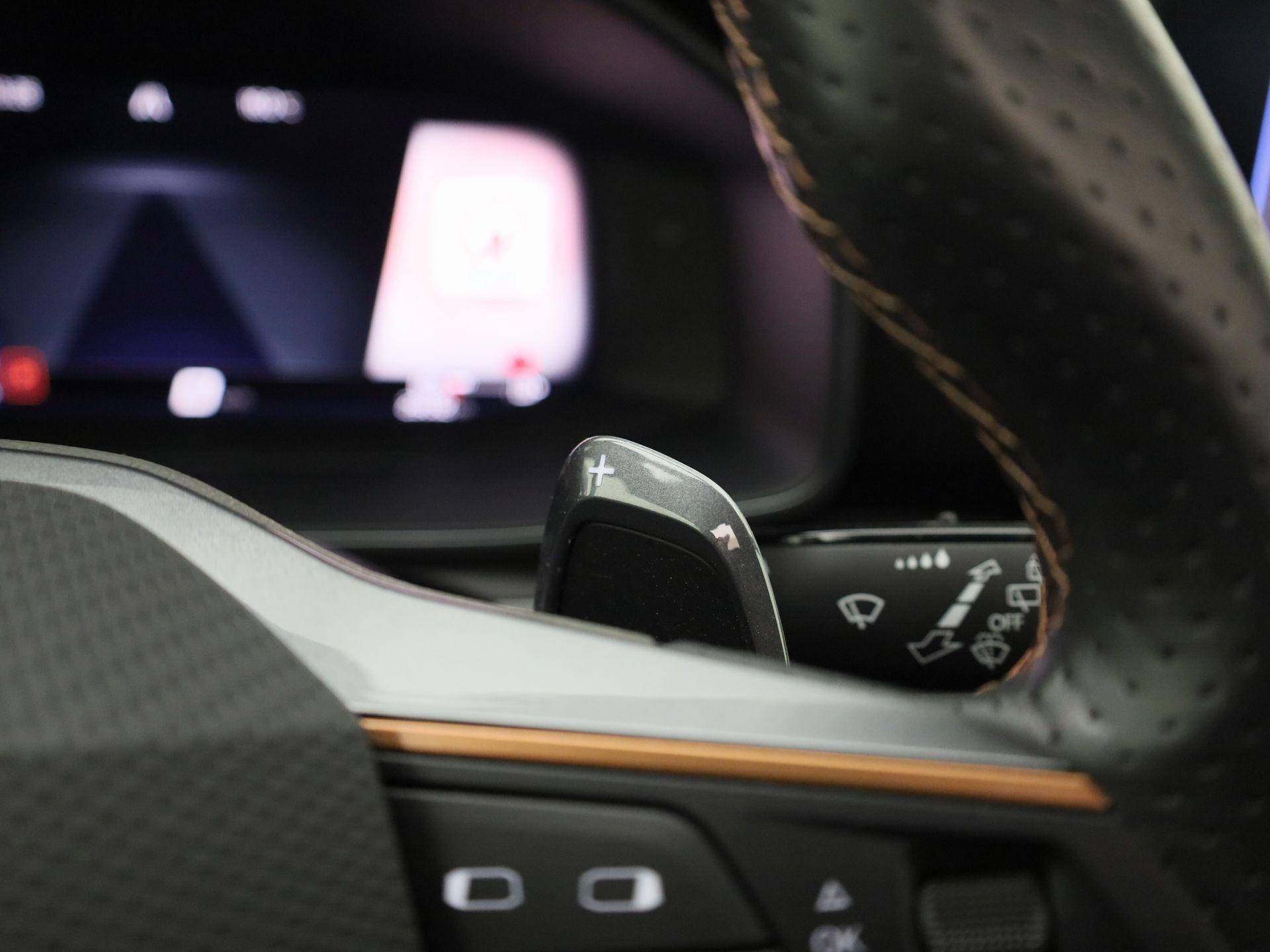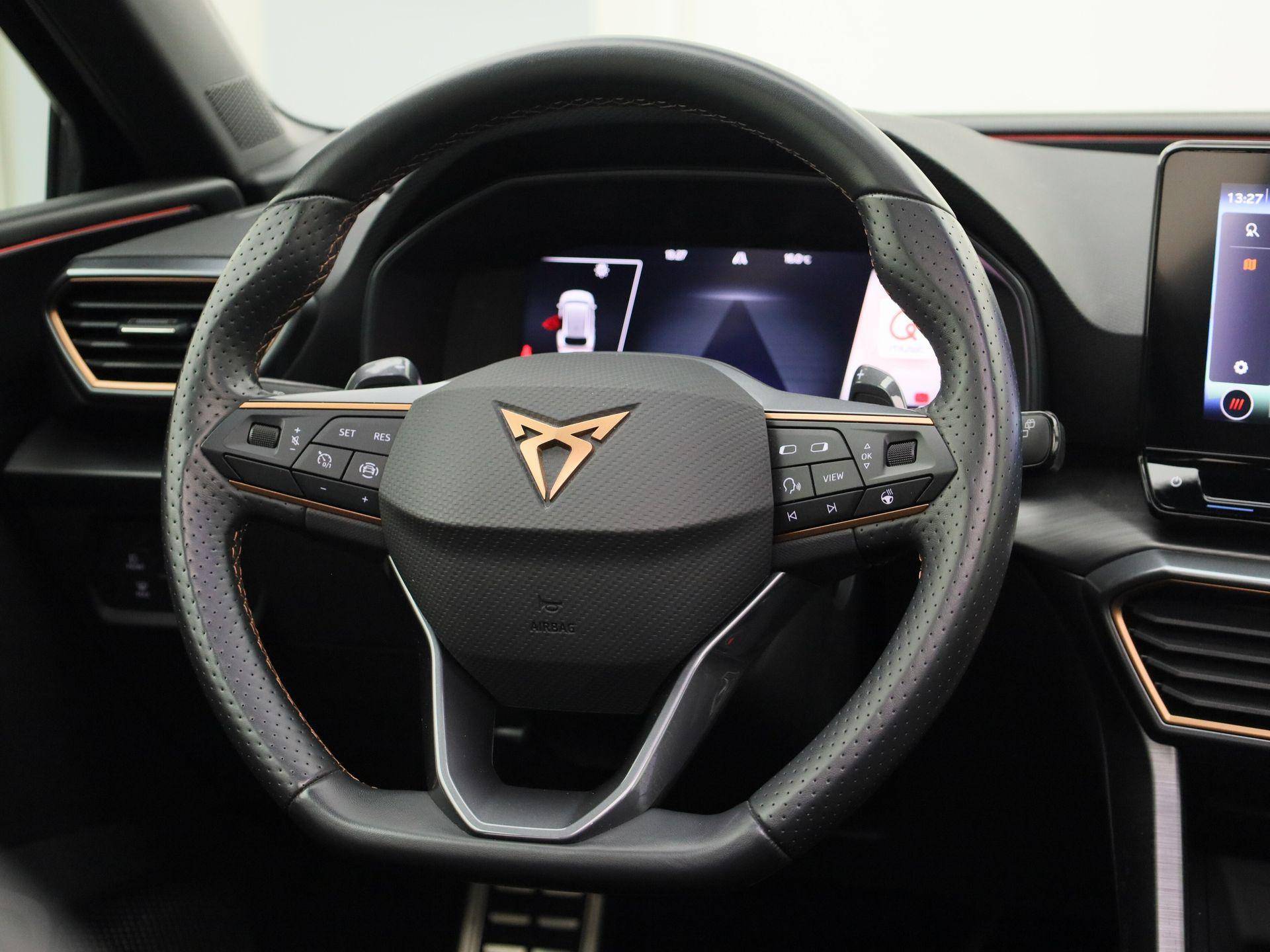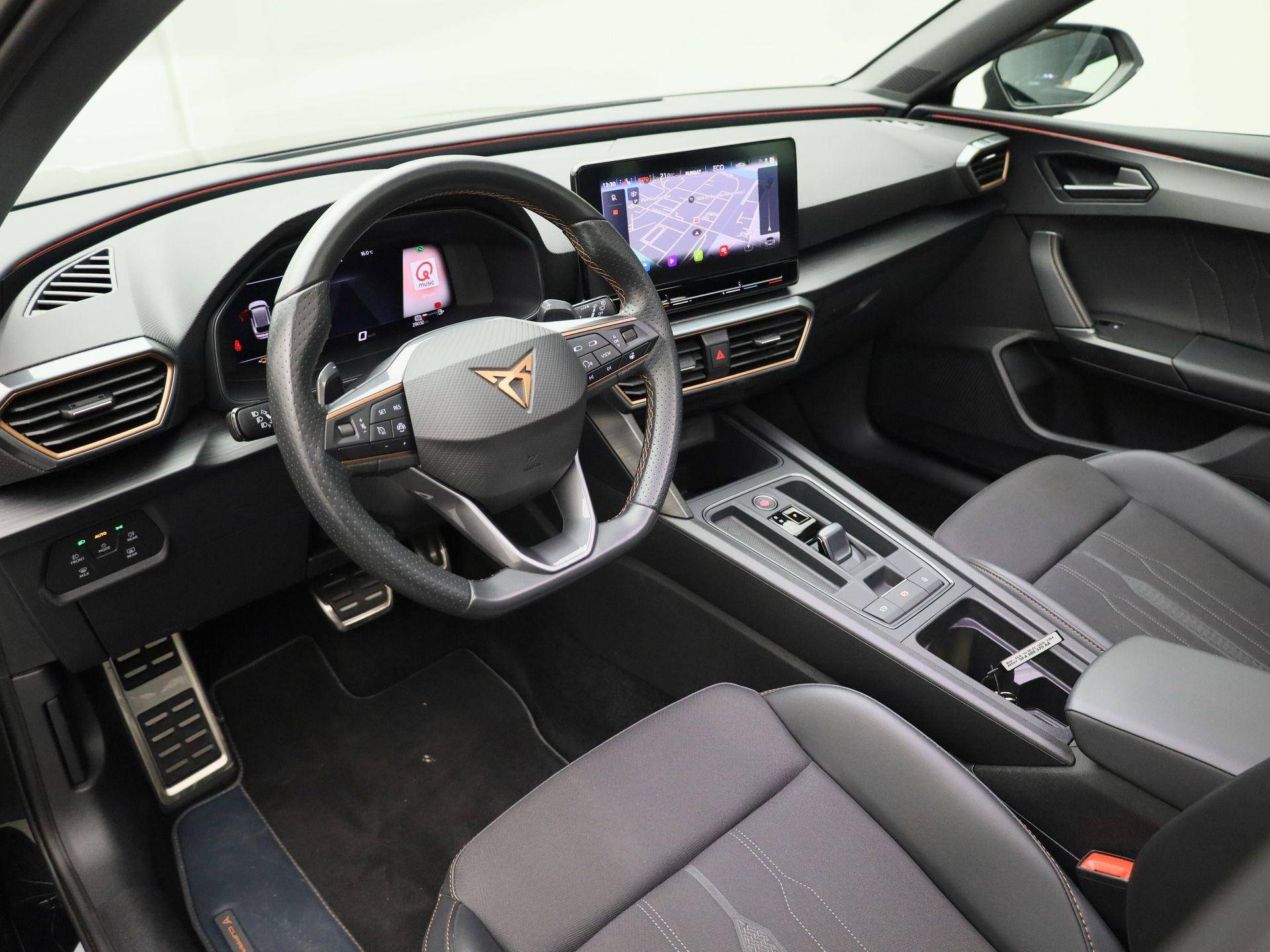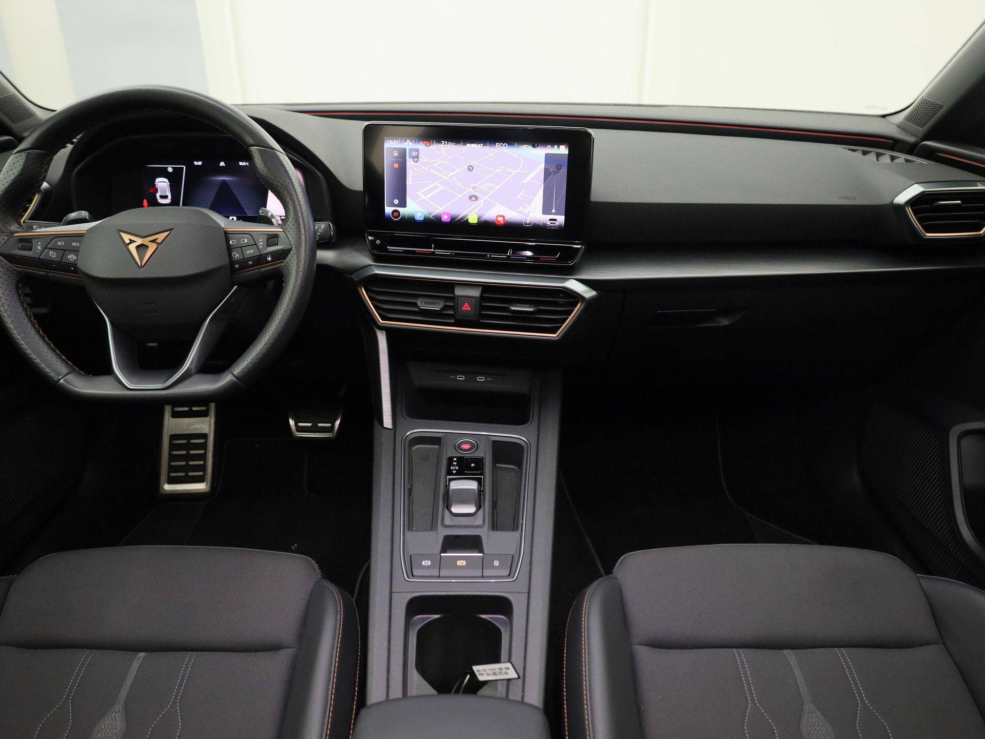 Alle functies voor een veilige en zuinige rit worden overzichtelijk weergegeven op het digitale dashboard. Met adaptive cruise control houdt de auto zelfstandig afstand tot uw voorligger. Een veiligheidsverhogende optie waarmee u comfortabel onderweg bent. Functies activeren en storingen opsporen? Bij deze auto gaat het eenvoudig via uw smartphone. Overal en altijd. Het full map navigatiesysteem en het audiosysteem (met DAB-ontvangst!) bedient u met knoppen op het stuur of met gesproken commando's. Telefoon onderweg aan de lader? Daar komt geen kabeltje aan te pas, want deze CUPRA Leon Sportstourer is voorzien van een draadloze oplaadmogelijkheid voor telefoons. Extra opties op deze auto zijn: electronic climate control, parkeersensoren achter, regensensor, keyless entry en automatisch dimmende binnenspiegel.