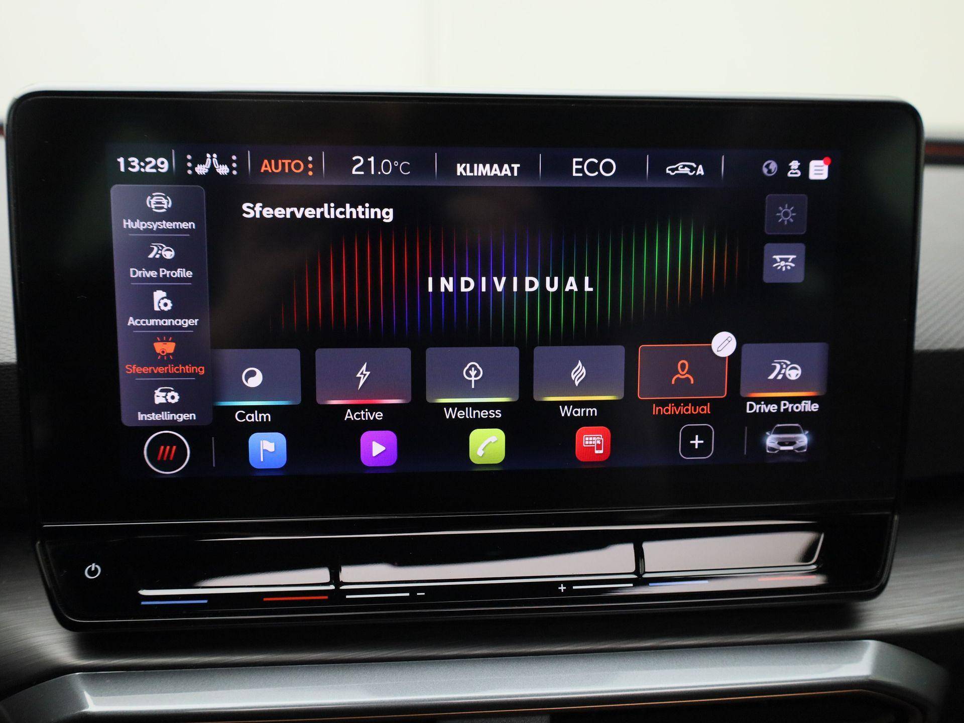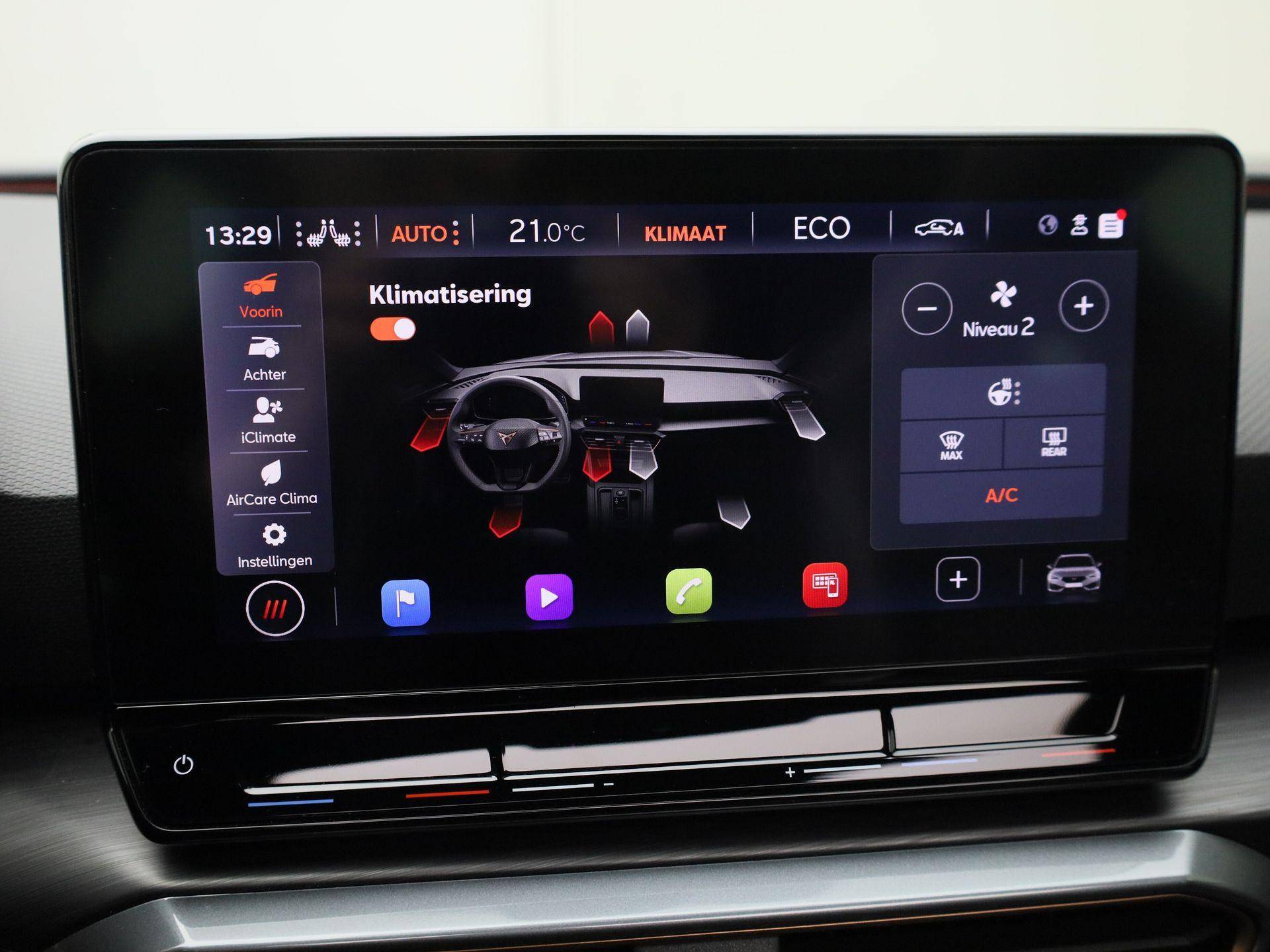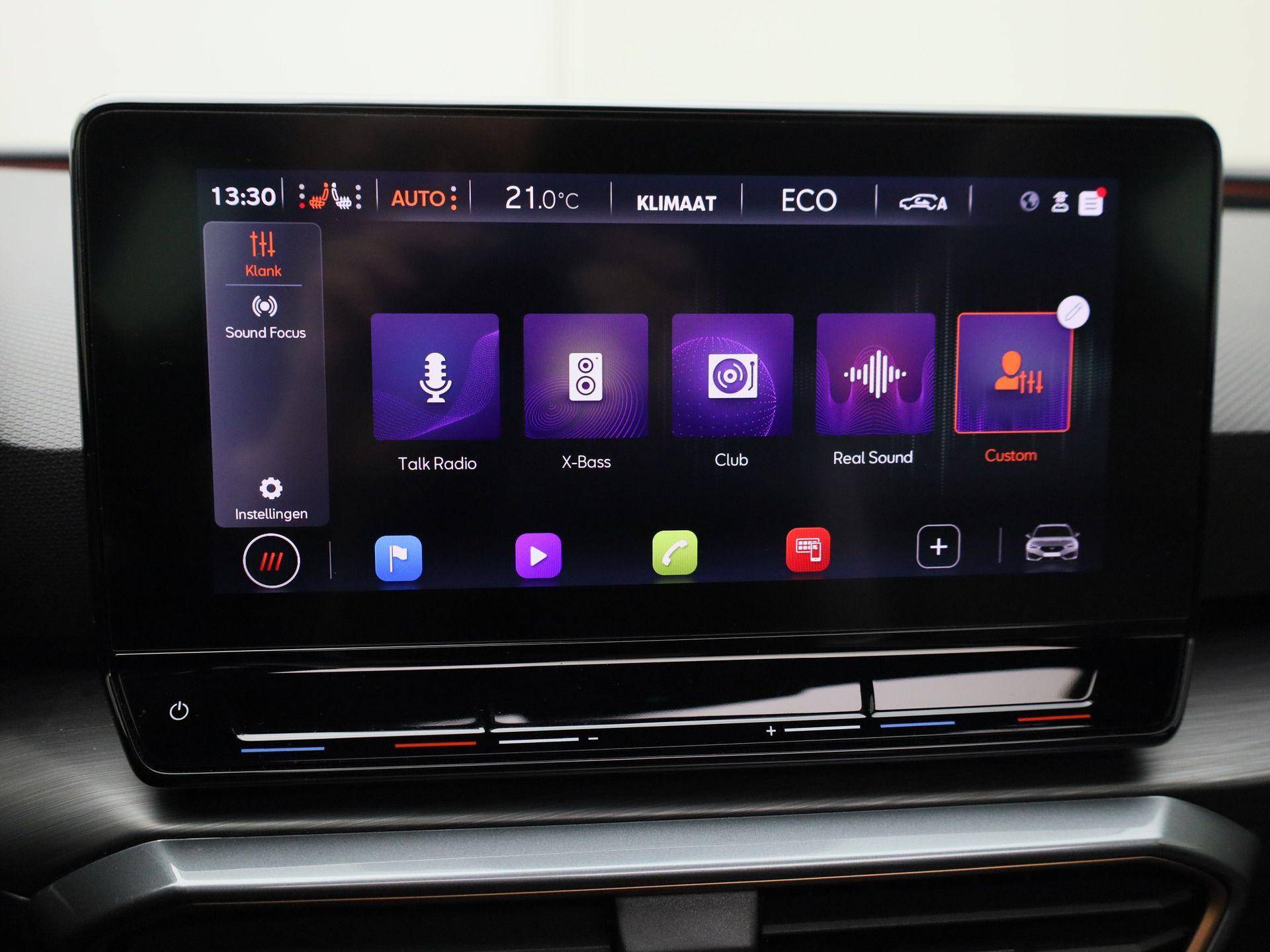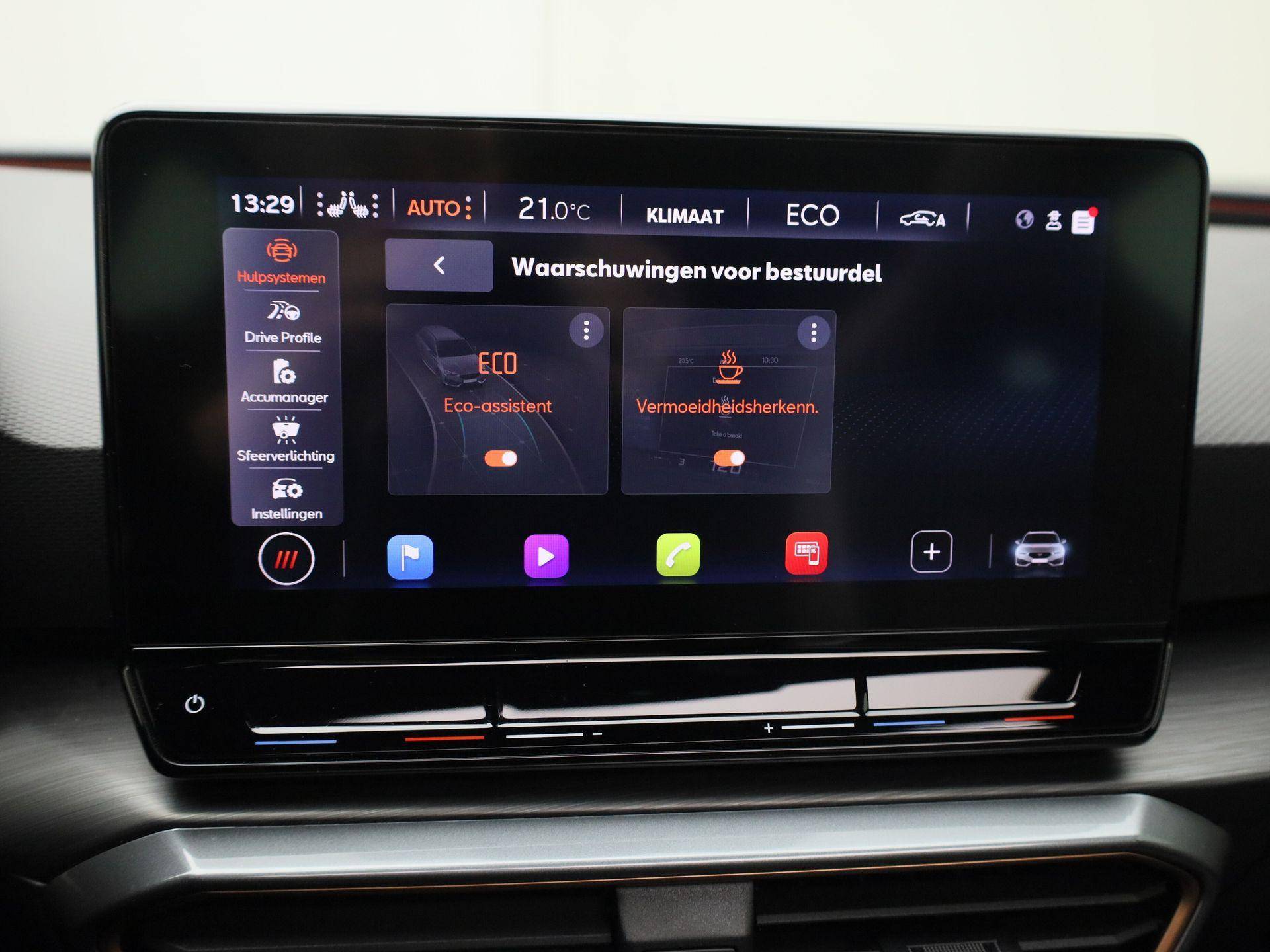 Alle functies voor een veilige en zuinige rit worden overzichtelijk weergegeven op het digitale dashboard. Met adaptive cruise control houdt de auto zelfstandig afstand tot uw voorligger. Een veiligheidsverhogende optie waarmee u comfortabel onderweg bent. Functies activeren en storingen opsporen? Bij deze auto gaat het eenvoudig via uw smartphone. Overal en altijd. Het full map navigatiesysteem en het audiosysteem (met DAB-ontvangst!) bedient u met knoppen op het stuur of met gesproken commando's. Telefoon onderweg aan de lader? Daar komt geen kabeltje aan te pas, want deze CUPRA Leon Sportstourer is voorzien van een draadloze oplaadmogelijkheid voor telefoons. Extra opties op deze auto zijn: electronic climate control, parkeersensoren achter, regensensor, keyless entry en automatisch dimmende binnenspiegel.