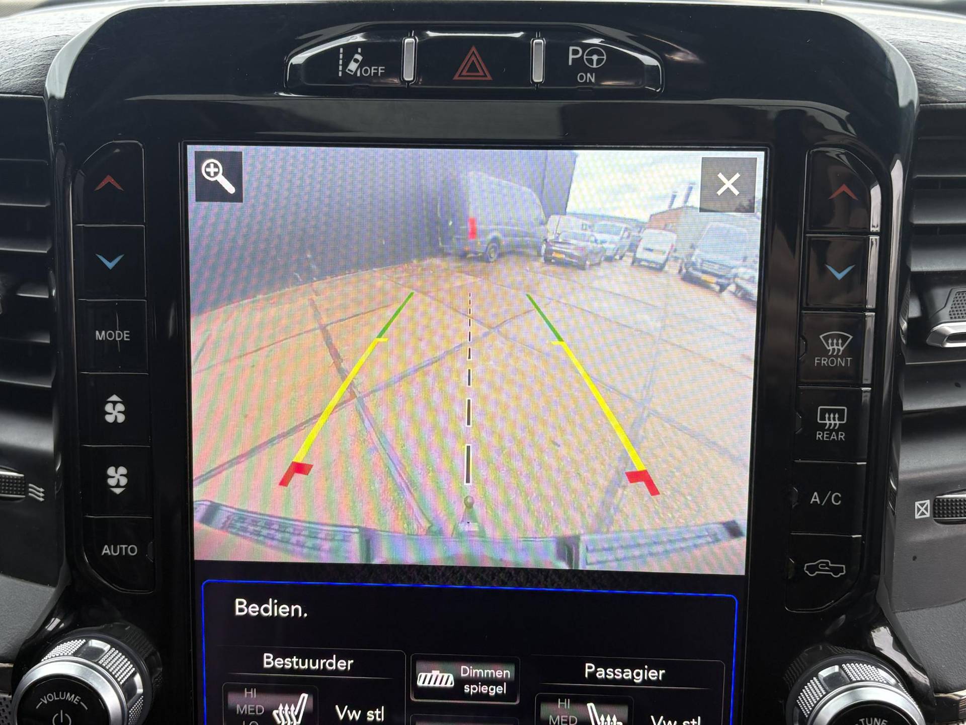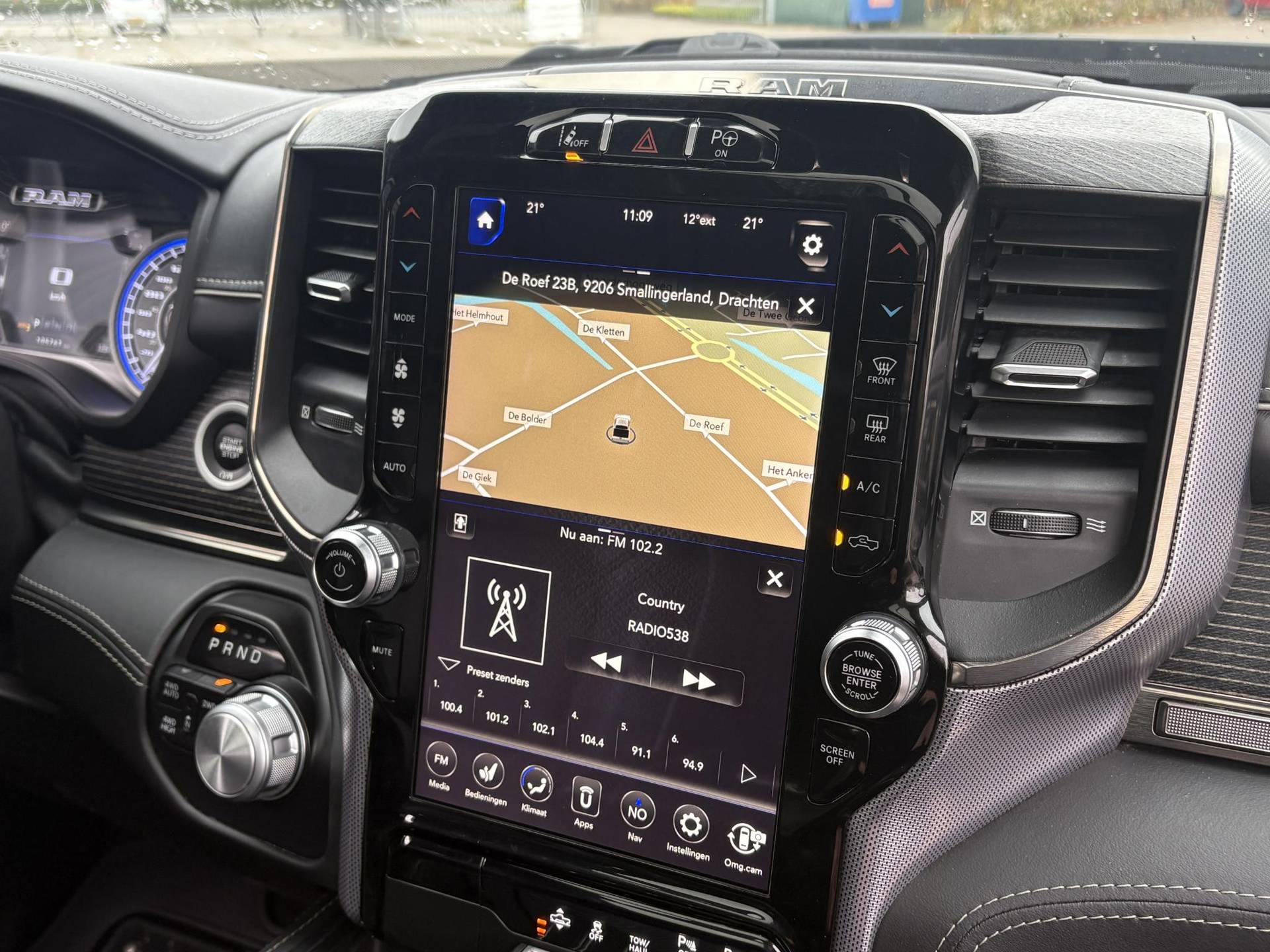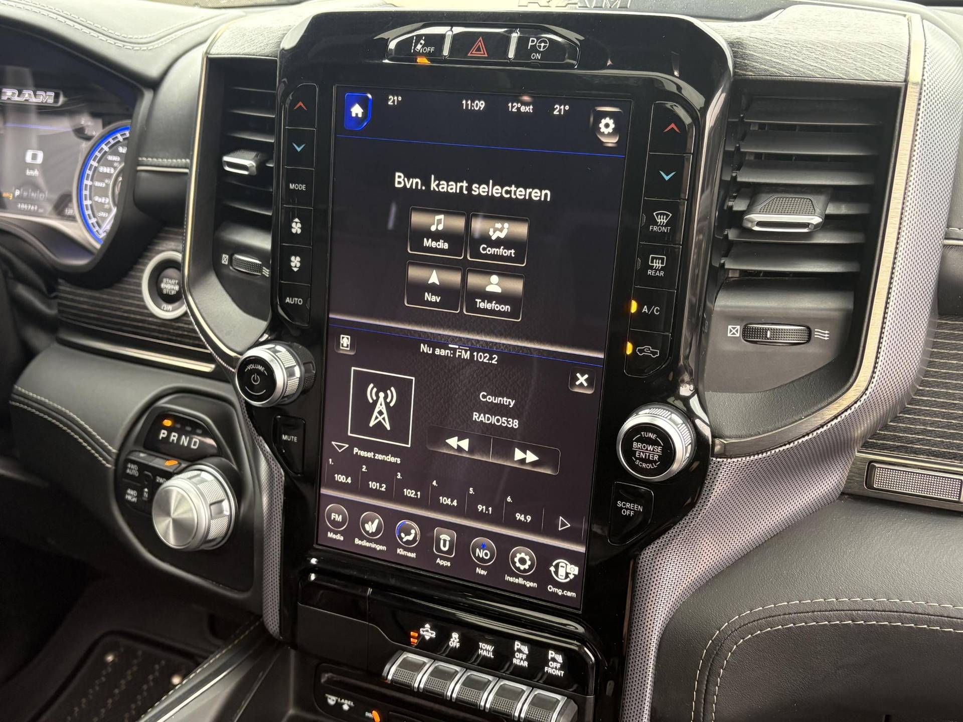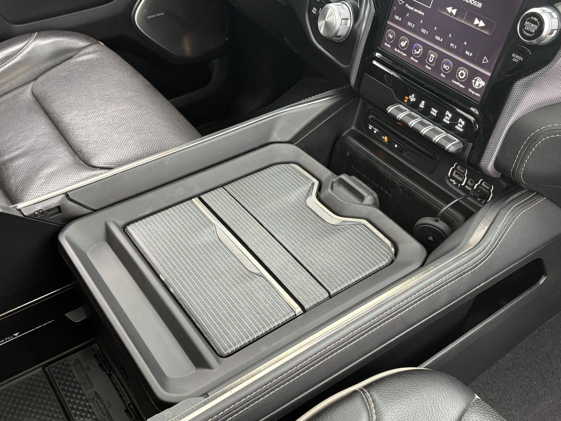 Qua technologie laat de Ram niets te wensen over. Het infotainmentsysteem bestaat uit het enorme 12-inch Uconnect touchscreen met navigatie, ondersteuning voor Apple CarPlay en Android Auto, en een Harman Kardon premium audiosysteem met maar liefst 19 speakers. Daarnaast vind je meerdere USB-aansluitingen, een draadloze oplader, en een 115V stroomaansluiting – ideaal voor onderweg of tijdens het werk. Dankzij de achteruitrijcamera, het 360° Surround View camerasysteem, ParkSense parkeerassistentie voor en achter, en Parallel & Perpendicular Park Assist wordt parkeren of manoeuvreren een fluitje van een cent.