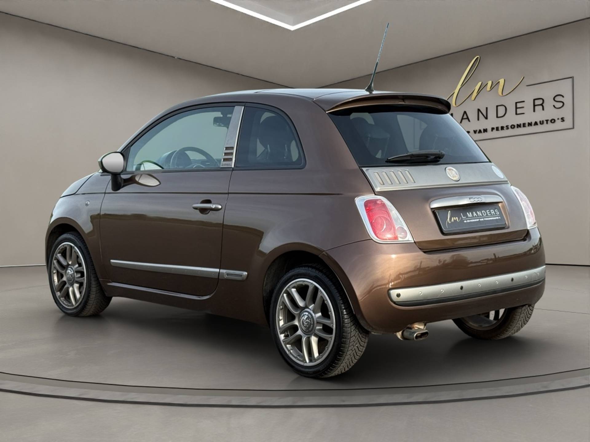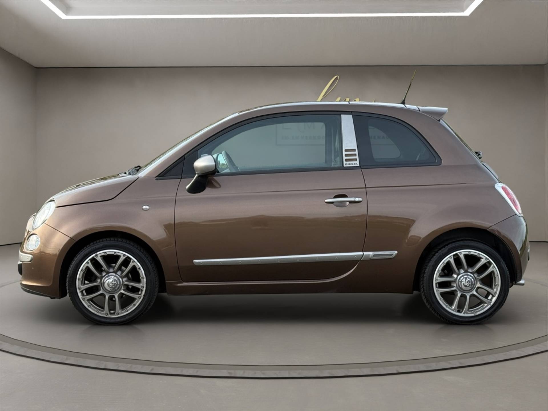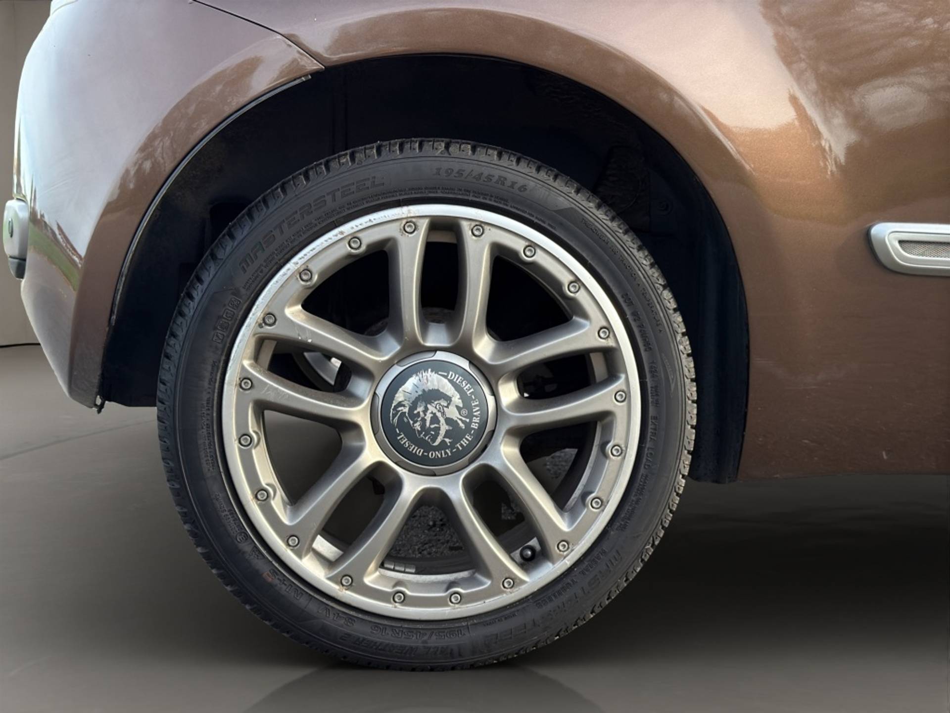 De Fiat '500 by Diesel', gebaseerd op de Sport-uitvoering, valt om te beginnen op door zijn bijzondere lakkleur 'Marrone Diesel'. De 16 inch lichtmetalen velgen met Diesel logo springen eruit, net als de Diesel-sierstrips èn de buitenspiegelkappen. Deze laatste zijn uitgevoerd in de kleur van mat gepolijst staal, net zoals de grille, bumpers en de karakteristieke 'snorharen' aan de voorzijde. Ook binnenin een hoog gehalte aan Diesel elementen: in jeansstof uitgevoerde stoelen met gele stiksels, het Diesel logo op instrumentenpaneel en pookknop èn een speciaal zakje aan de zijkanten van de voorstoelen dat refereert aan de vijfde 'pocket' van de Diesel jeans.
