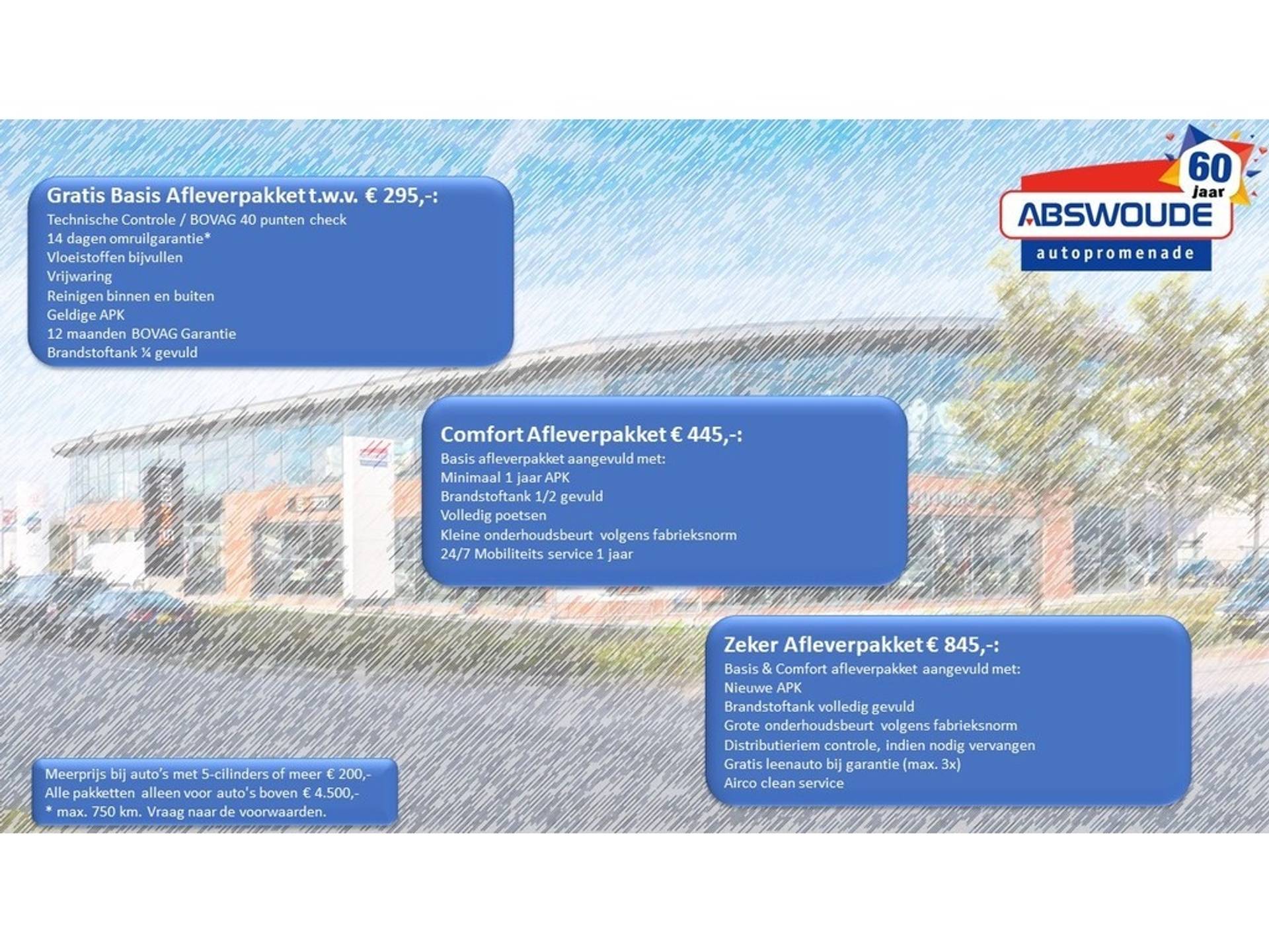 Hoe wilt u dat wij uw auto afleveren? U heeft keuze uit 3 afleverpakketten. Getoonde prijs is inclusief het Basis pakket. ***Kijk voor onze aanbiedingen op www.abswoude.nl ***
