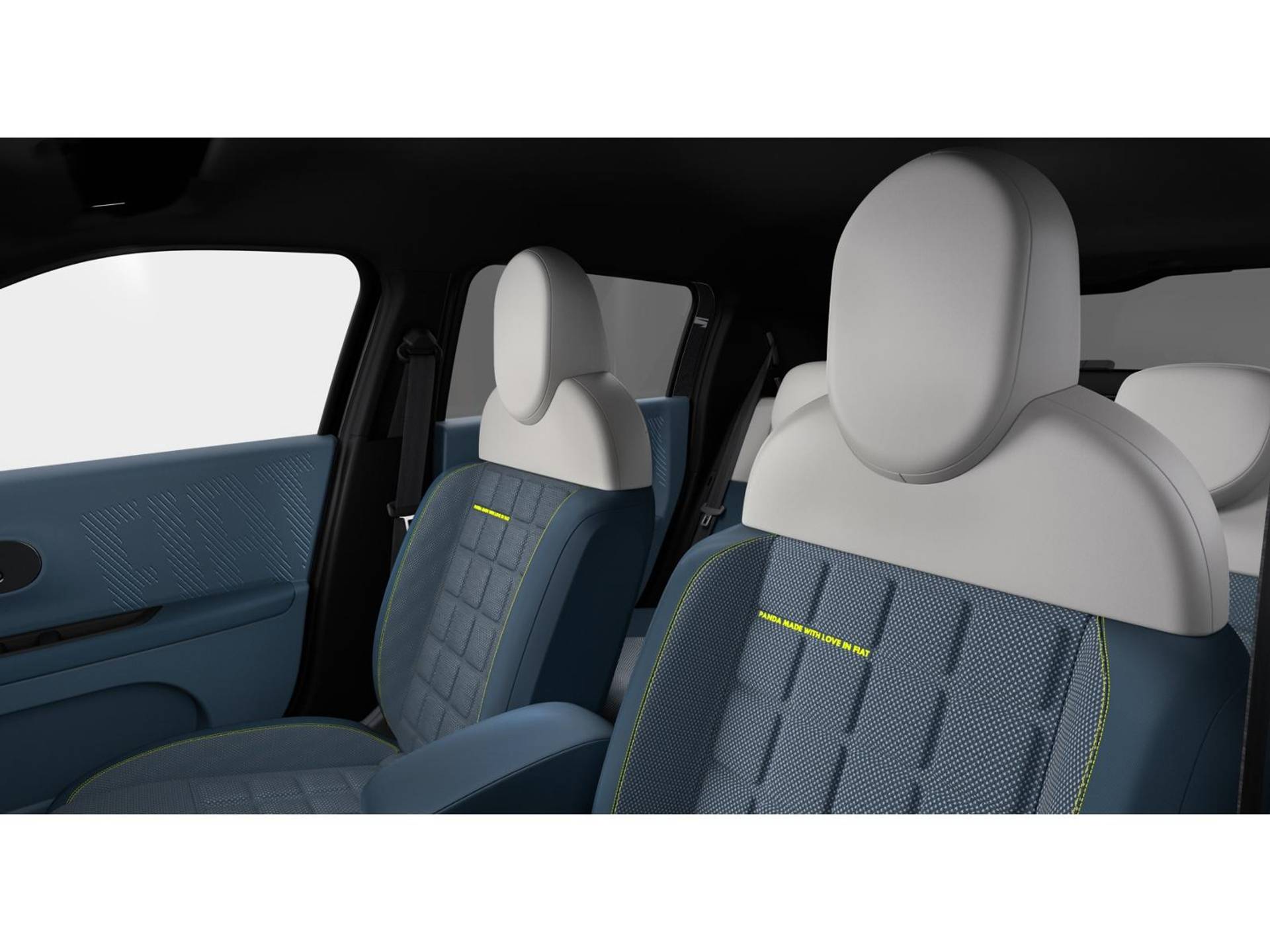 Interieur: Blauwe en ivoorkleurige stof met gele stiksels