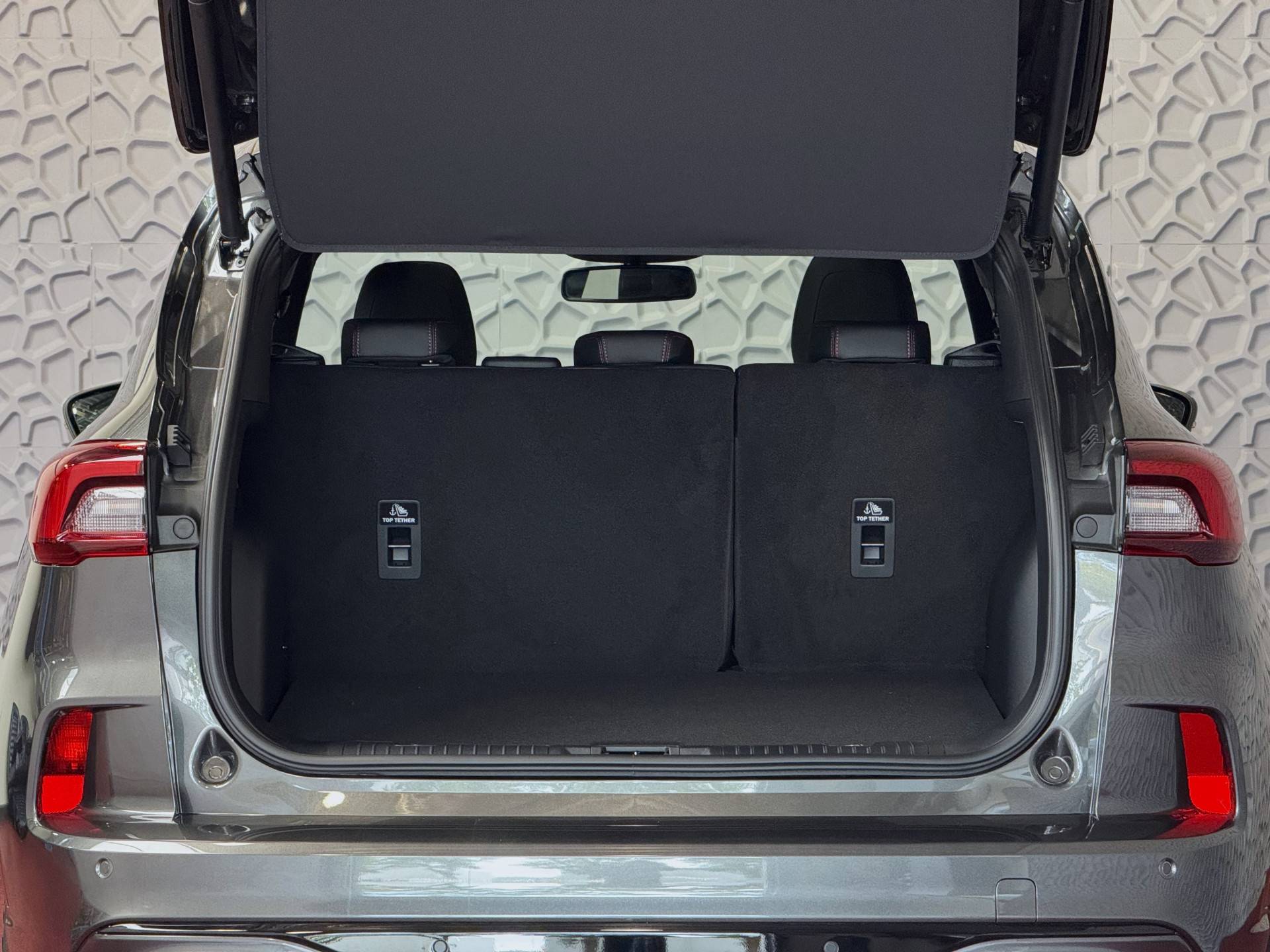 Donkere hemelbekleding en ST-design vloermatten: sportieve afwerking van het interieur.