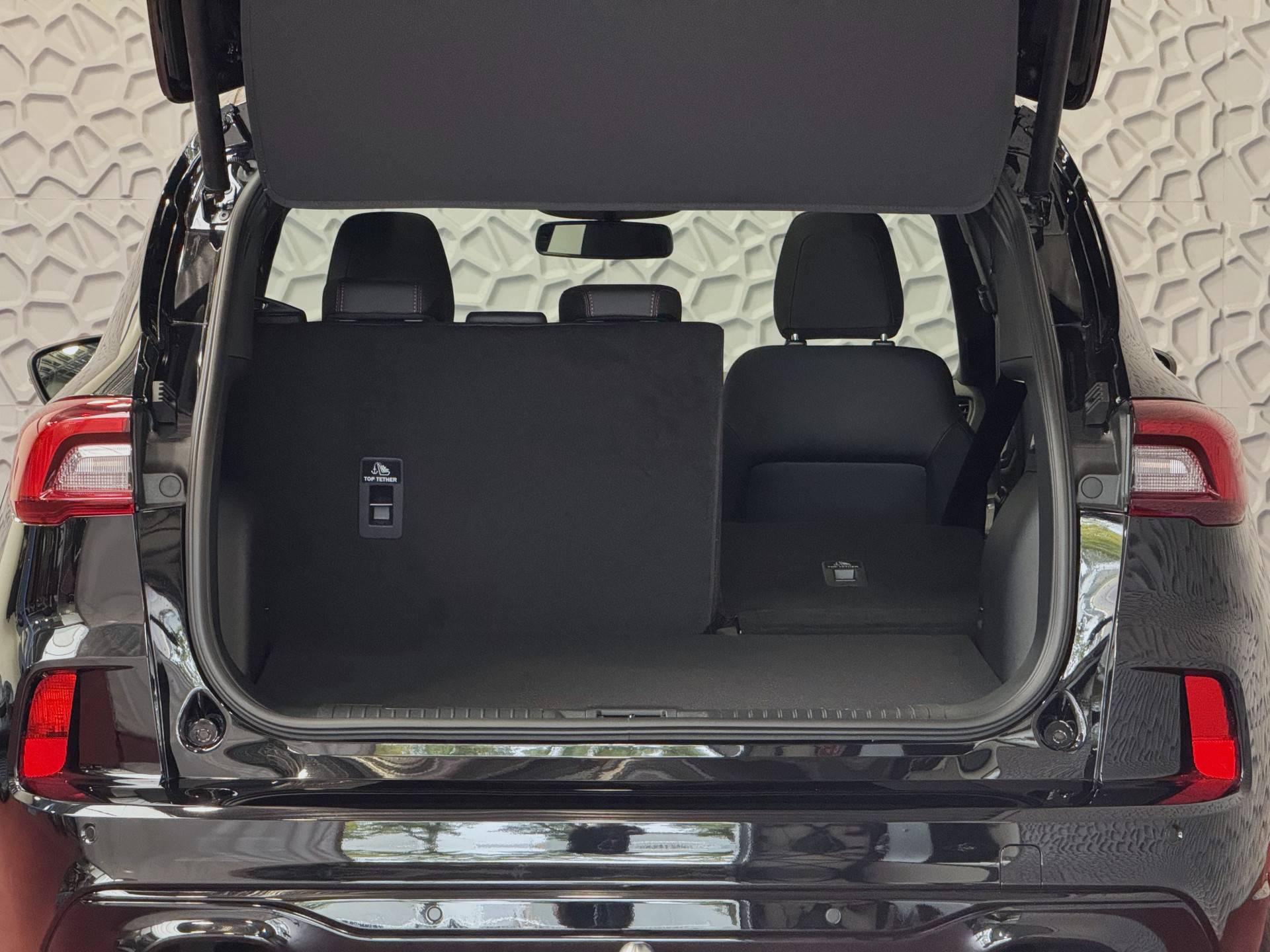 Donkere hemelbekleding en ST-design vloermatten: sportieve afwerking van het interieur.