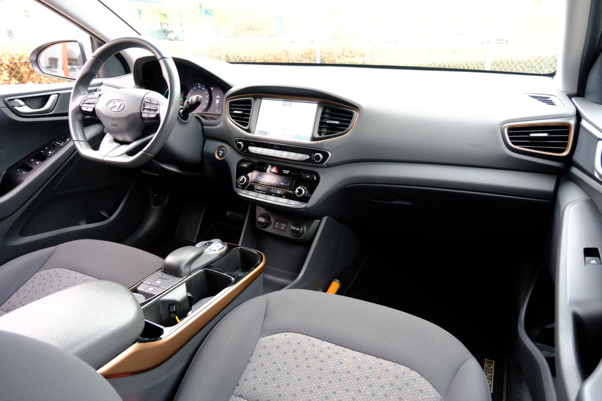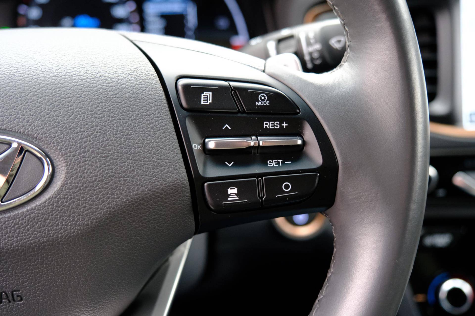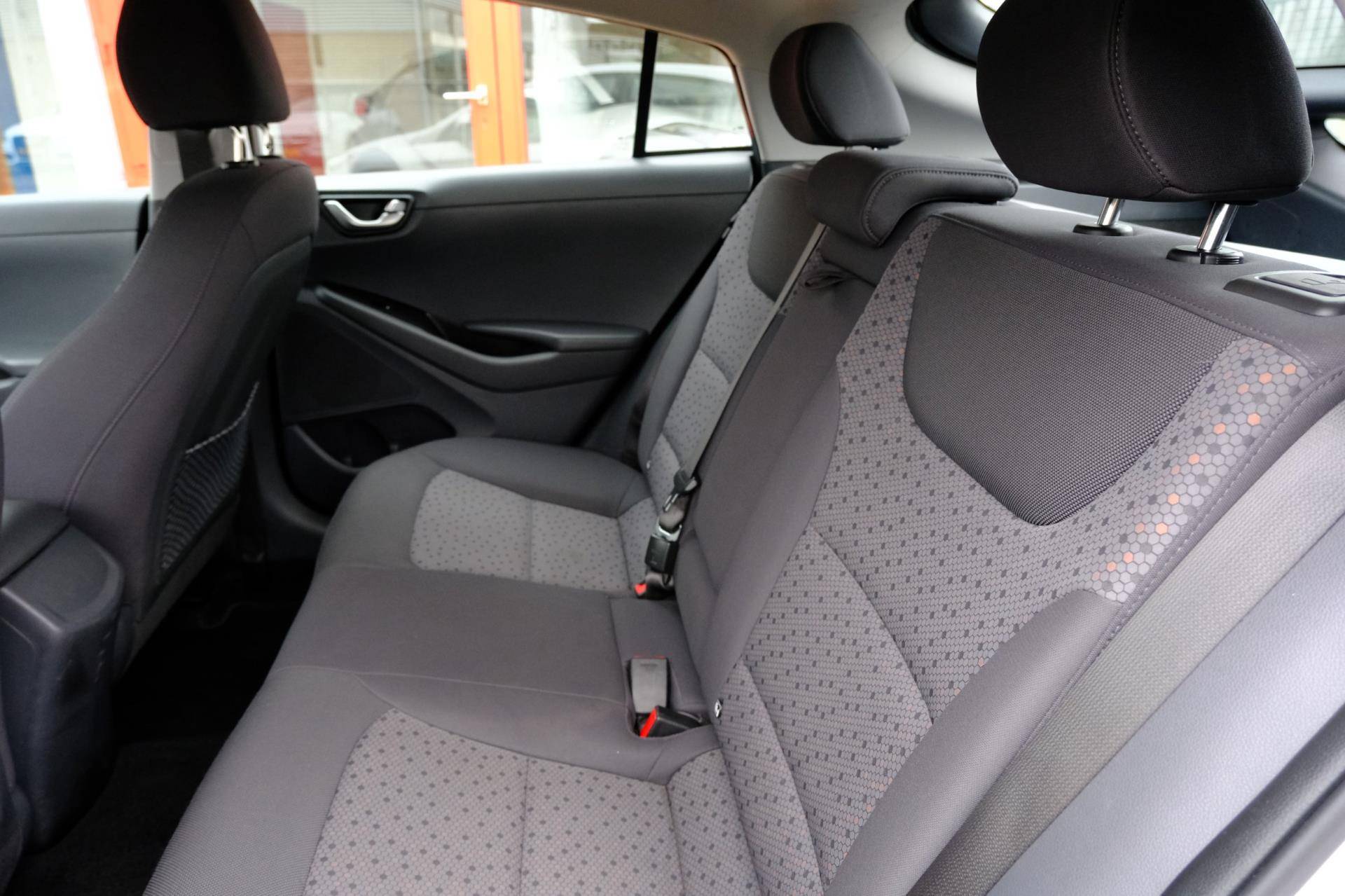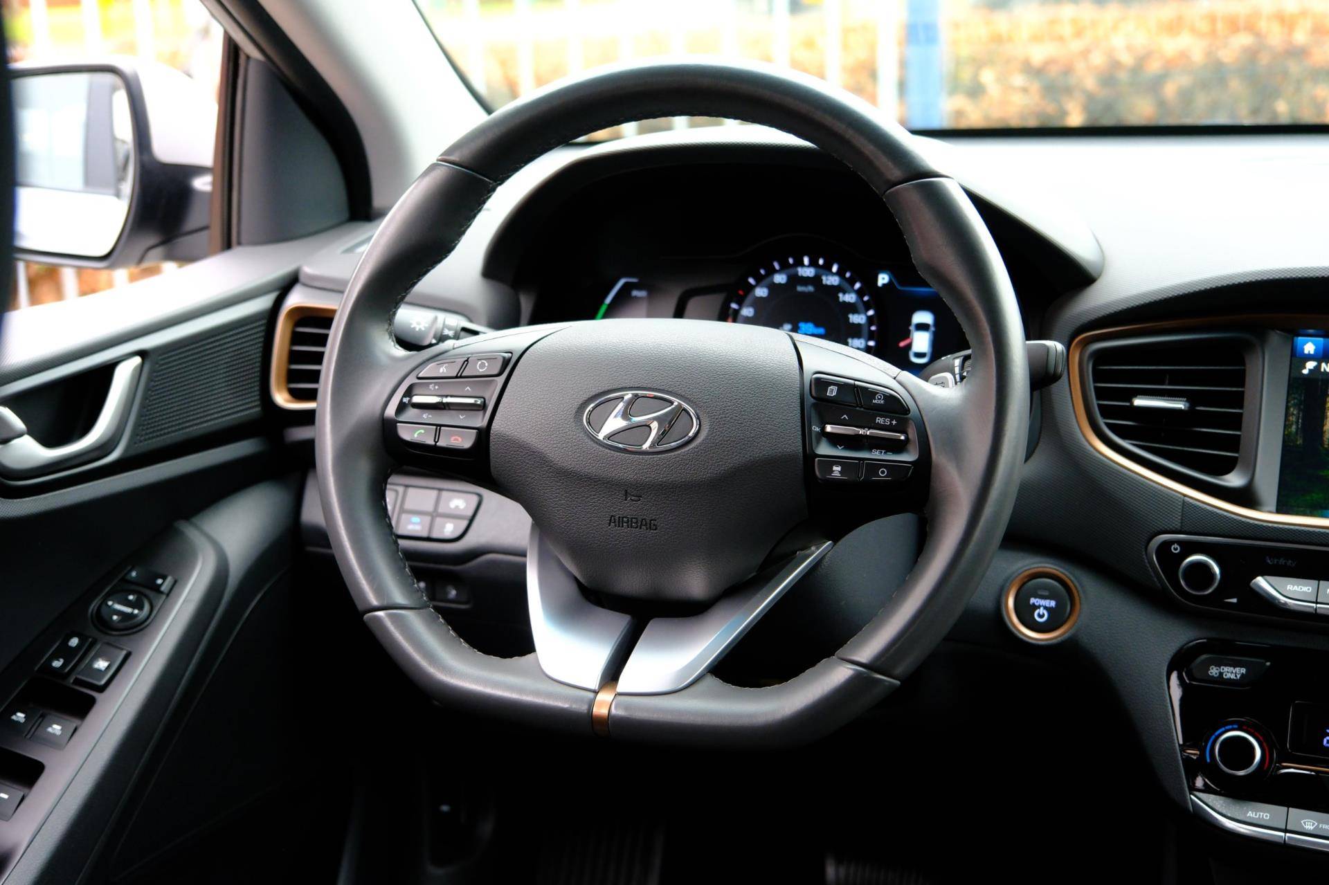 Kom maar, kom maar, kom maar... ho! Prettig hoor, zo'n achteruitrijcamera. Adaptive cruise control houdt de ingestelde snelheid vast en houdt afstand tot het voertuig voor u. Deze Hyundai is voorzien van knoppen op het stuur om het navigatiesysteem en het audio-installatiesysteem met DAB-ontvangst te bedienen. Deze Hyundai IONIQ is voorzien van sensoren aan de achterzijde om een achteropkomend verkeer waarschuwing te geven als de afstand tussen u en een achterligger te klein is. De automatische airconditioning zorgt voor een prettige binnentemperatuur. Deze Hyundai is voorzien van keyless entry, lederen stuur, boordcomputer en lederen versnellingspook.