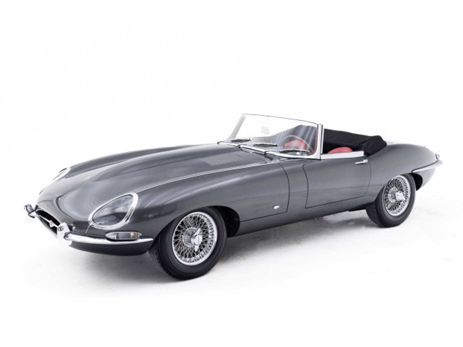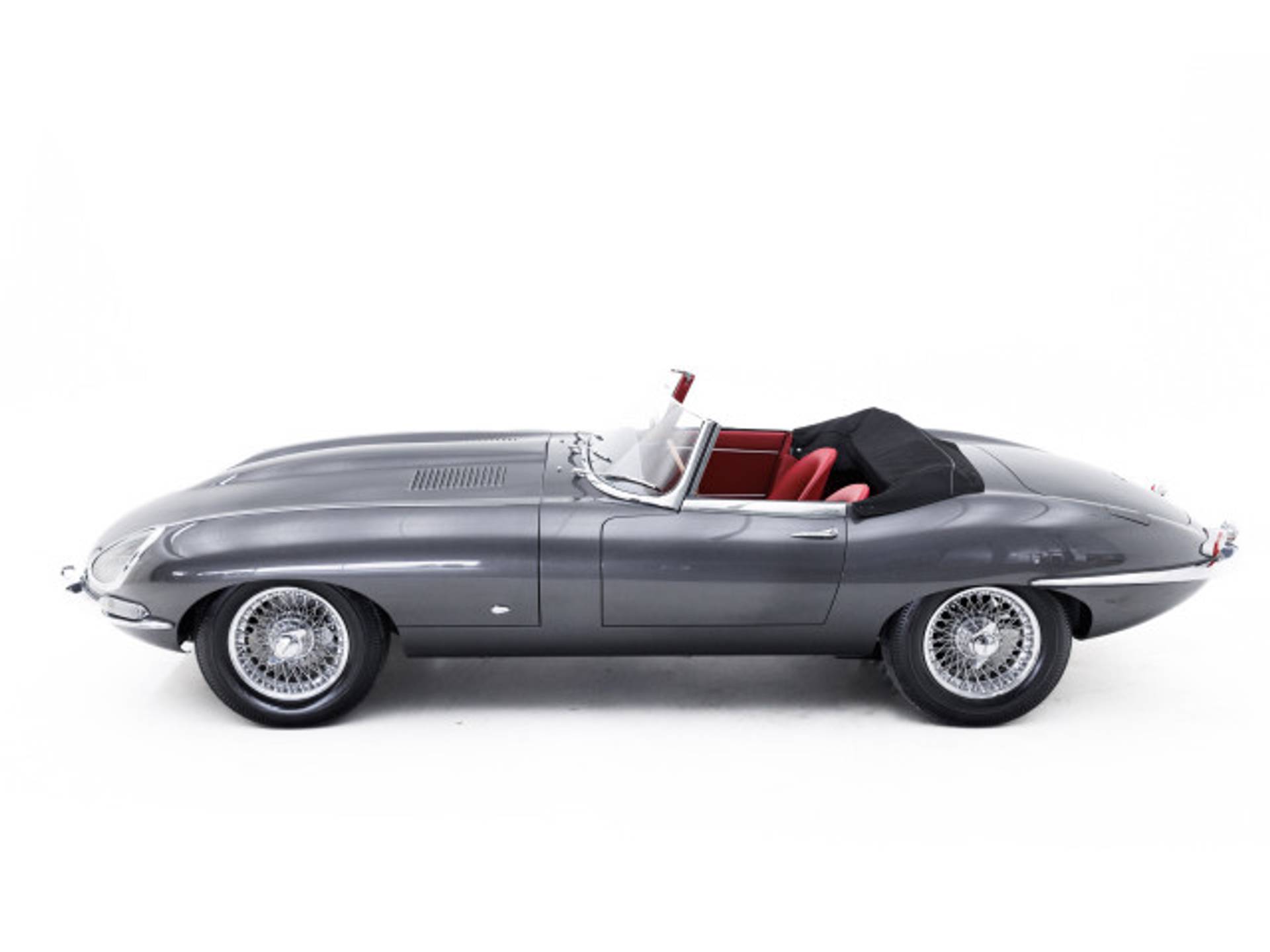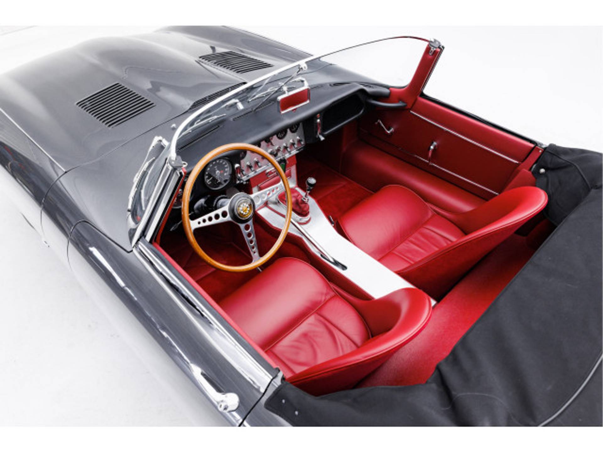 De E-type is uitgevoerd in de correcte en originele kleuren Gunmetal Grey met eenrood lederen interieur en een zwarte kap.