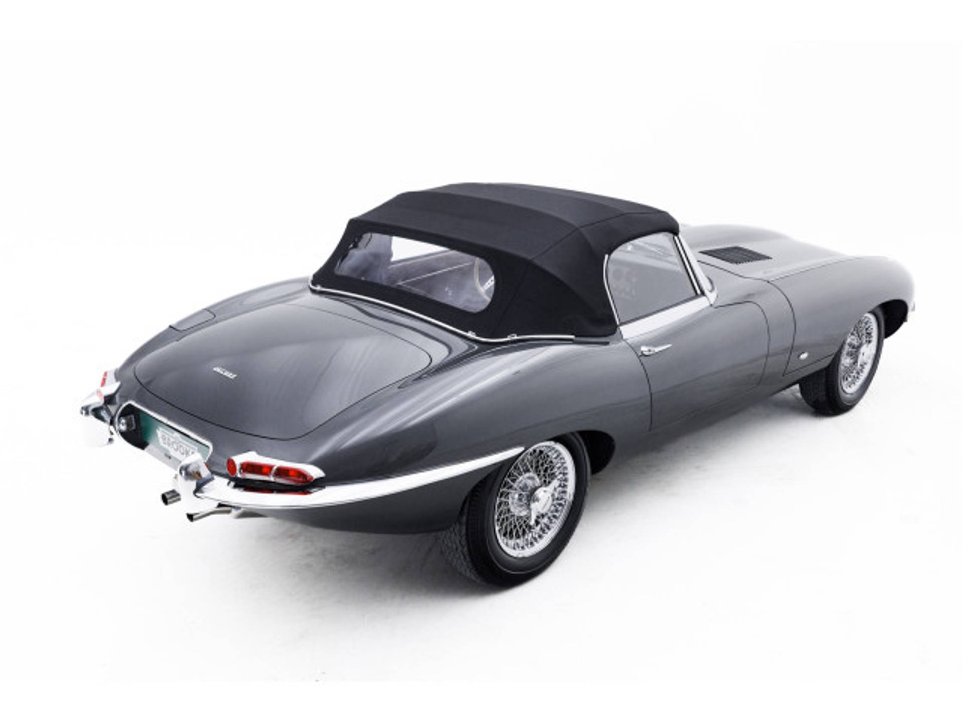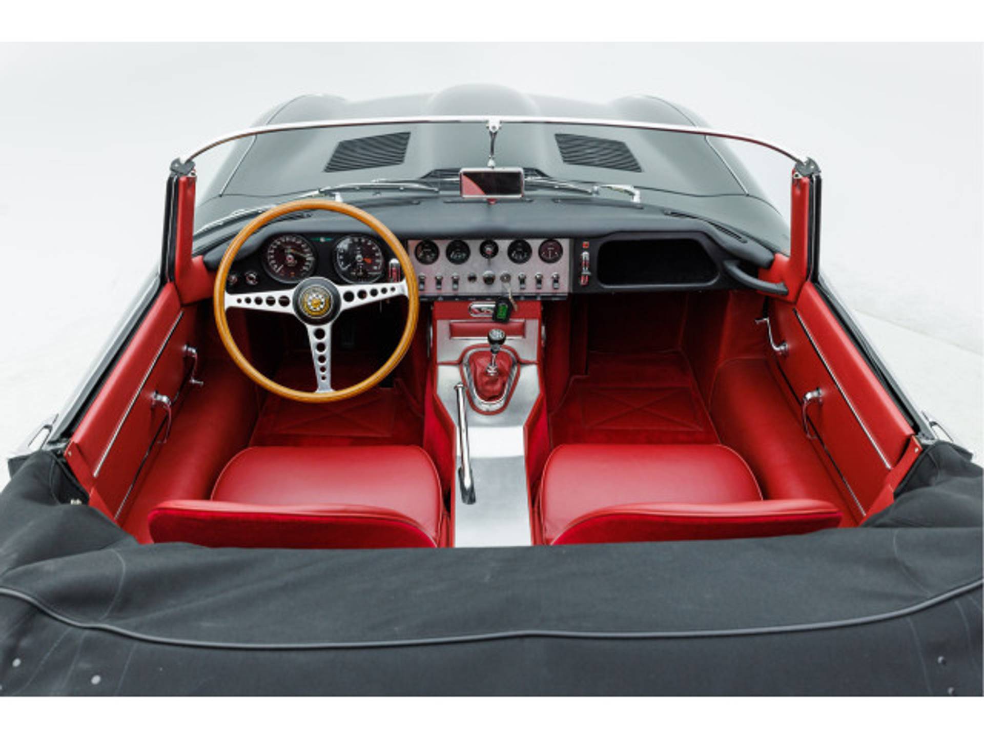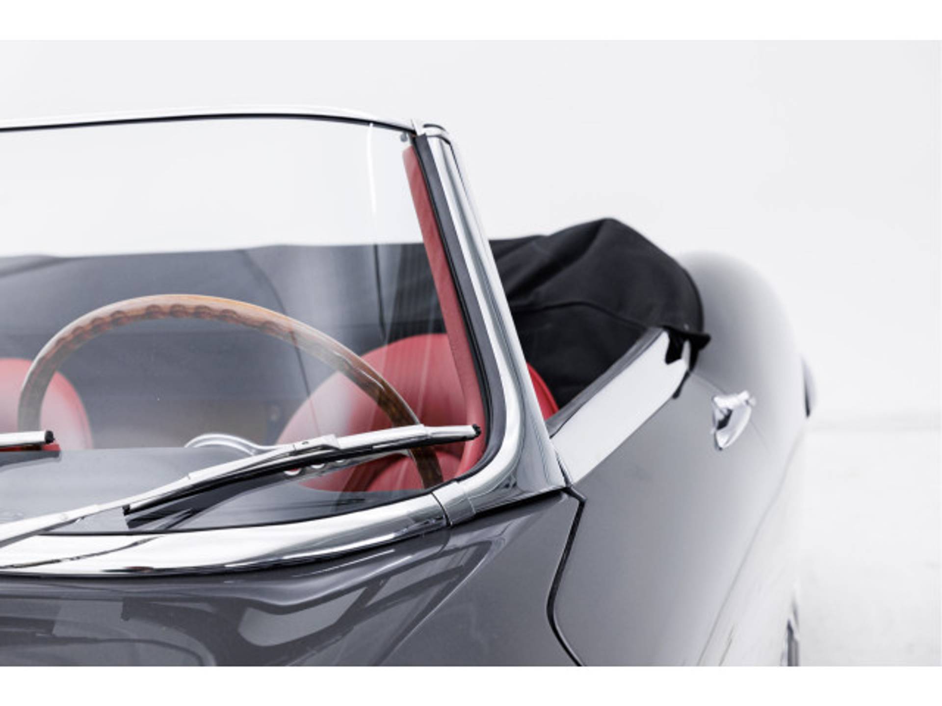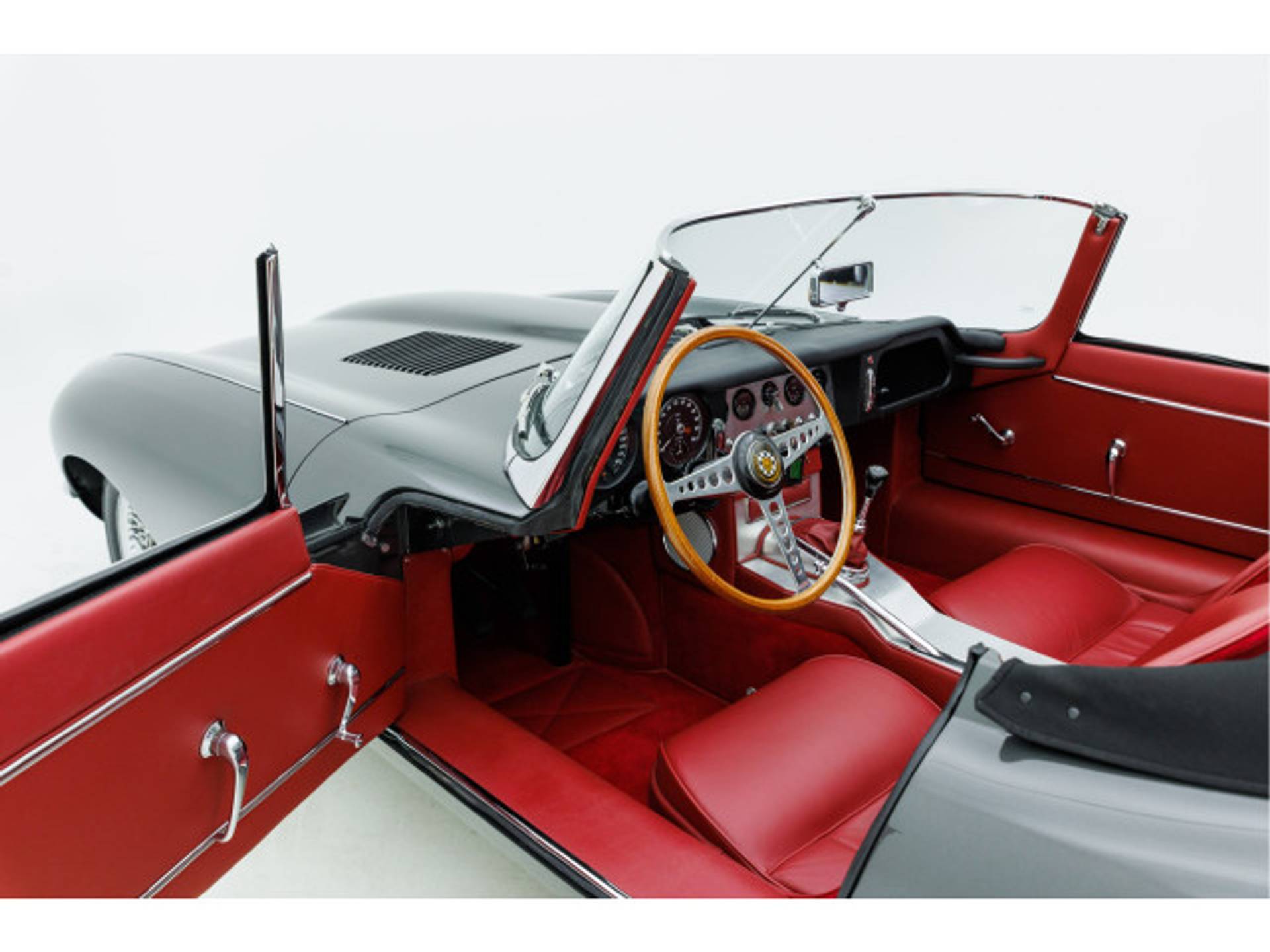 De E-type is uitgevoerd in de correcte en originele kleuren Gunmetal Grey met eenrood lederen interieur en een zwarte kap.