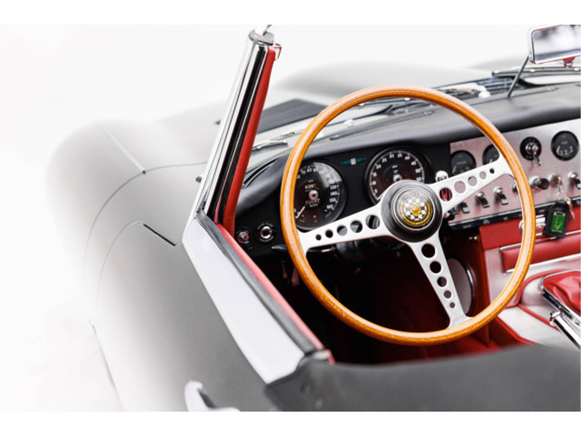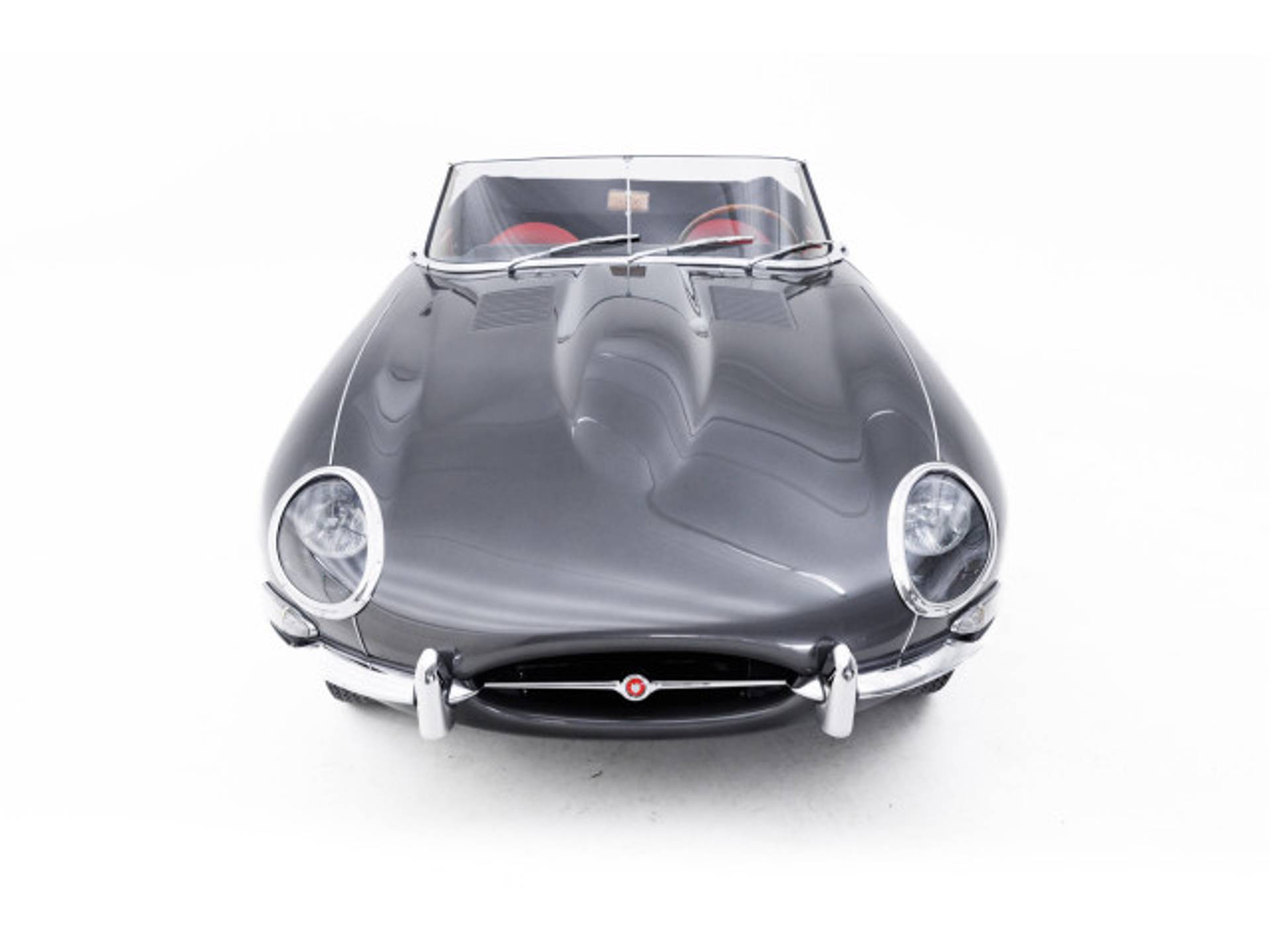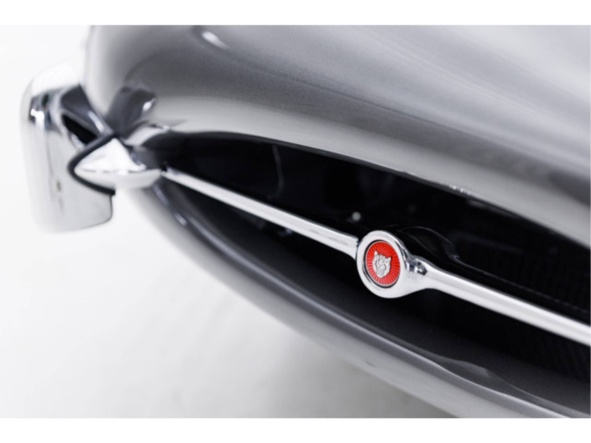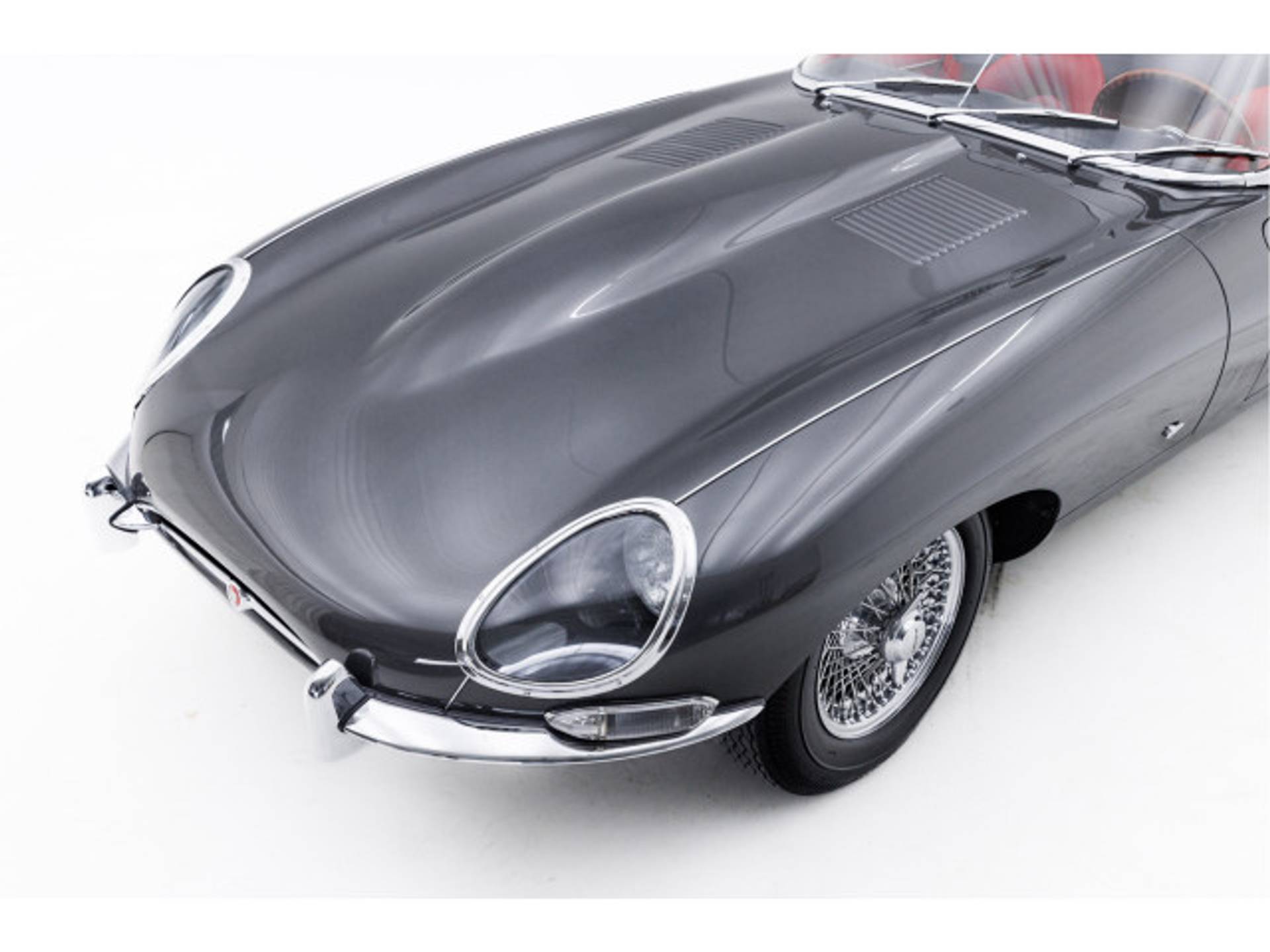 De bijzonder aantrekkelijke kleurcombinatie “Gunmetal Grey” met rood leder haalt het maximale uit het toch al zo fantastische lijnenspel van de E-Type.