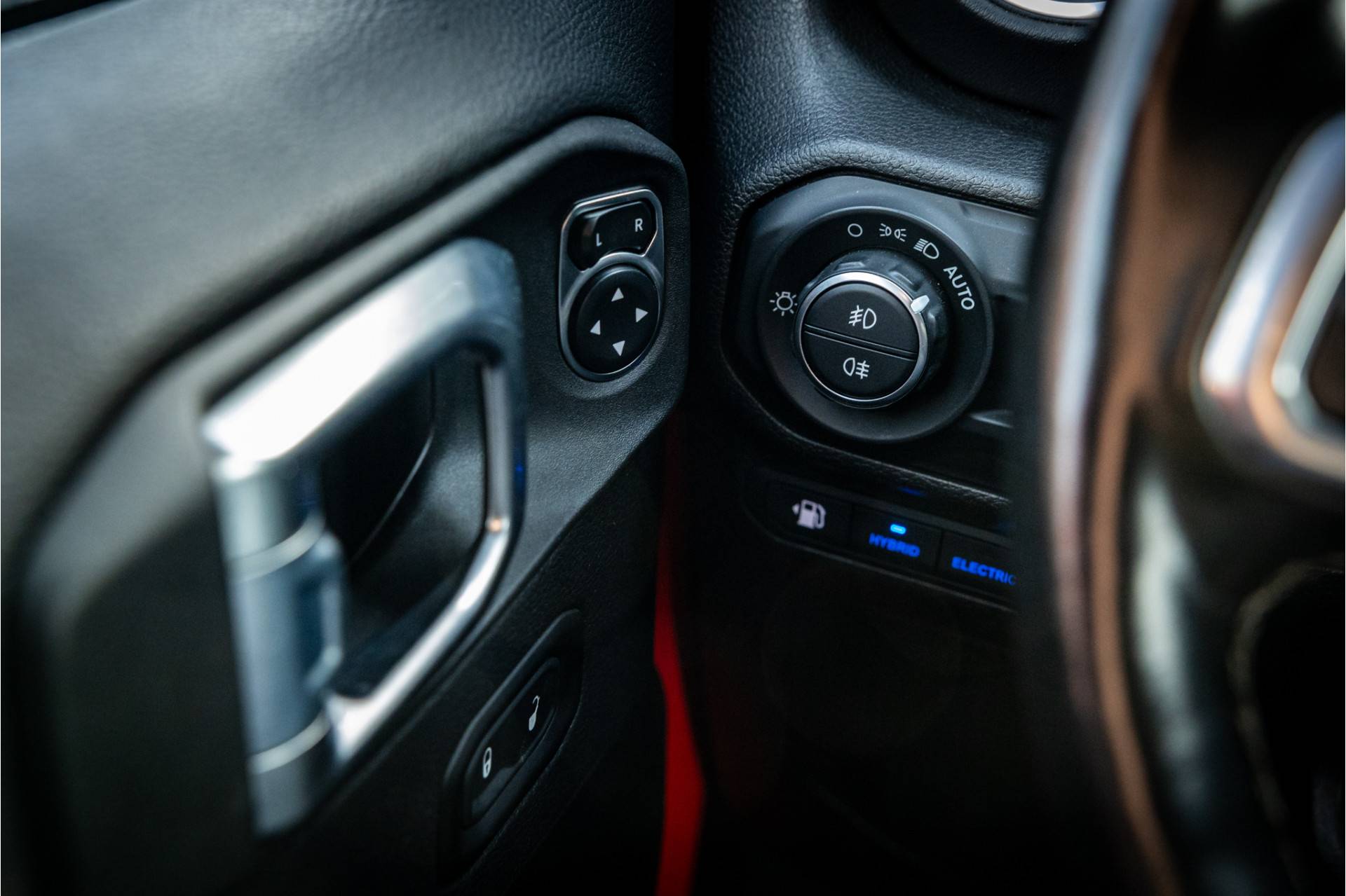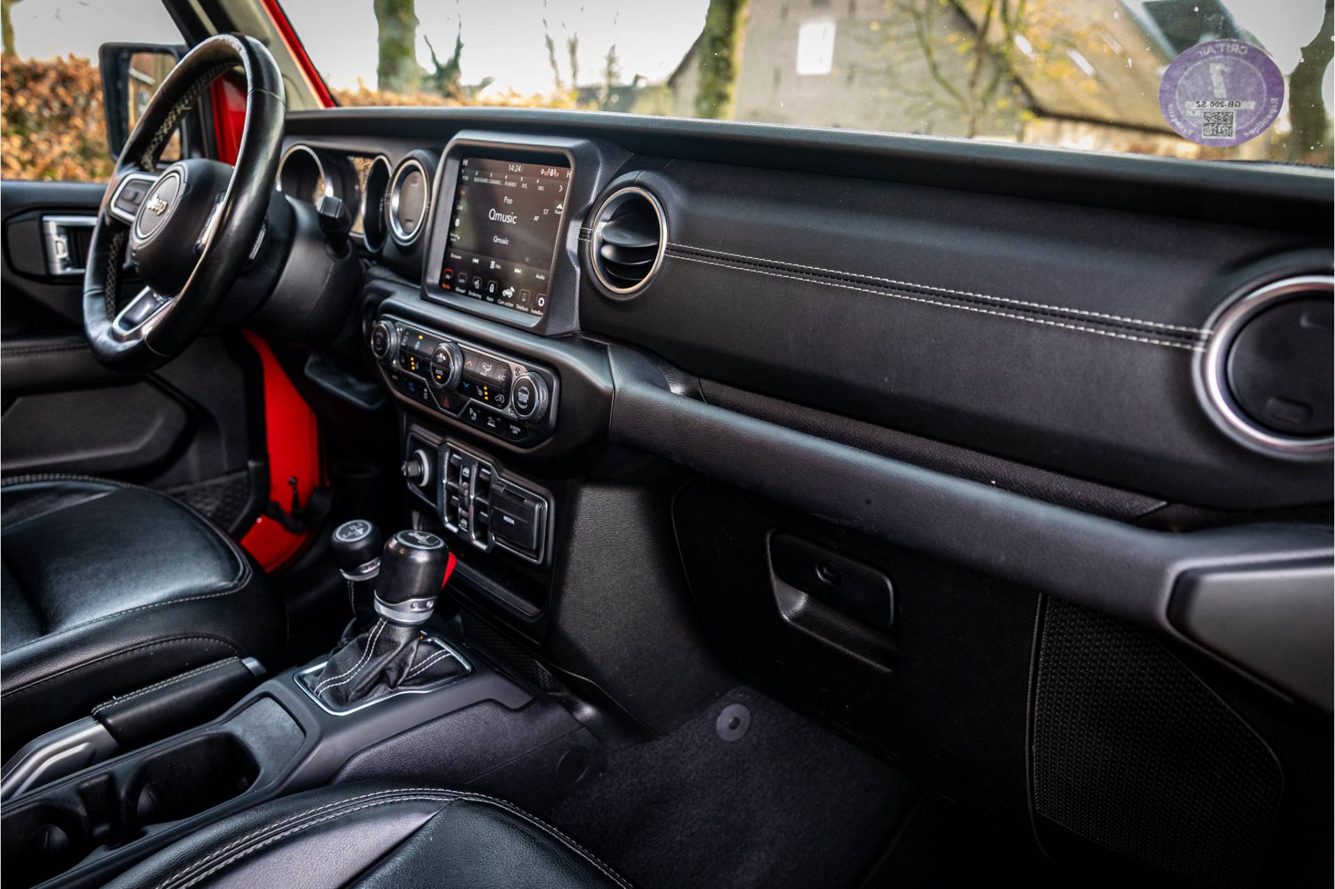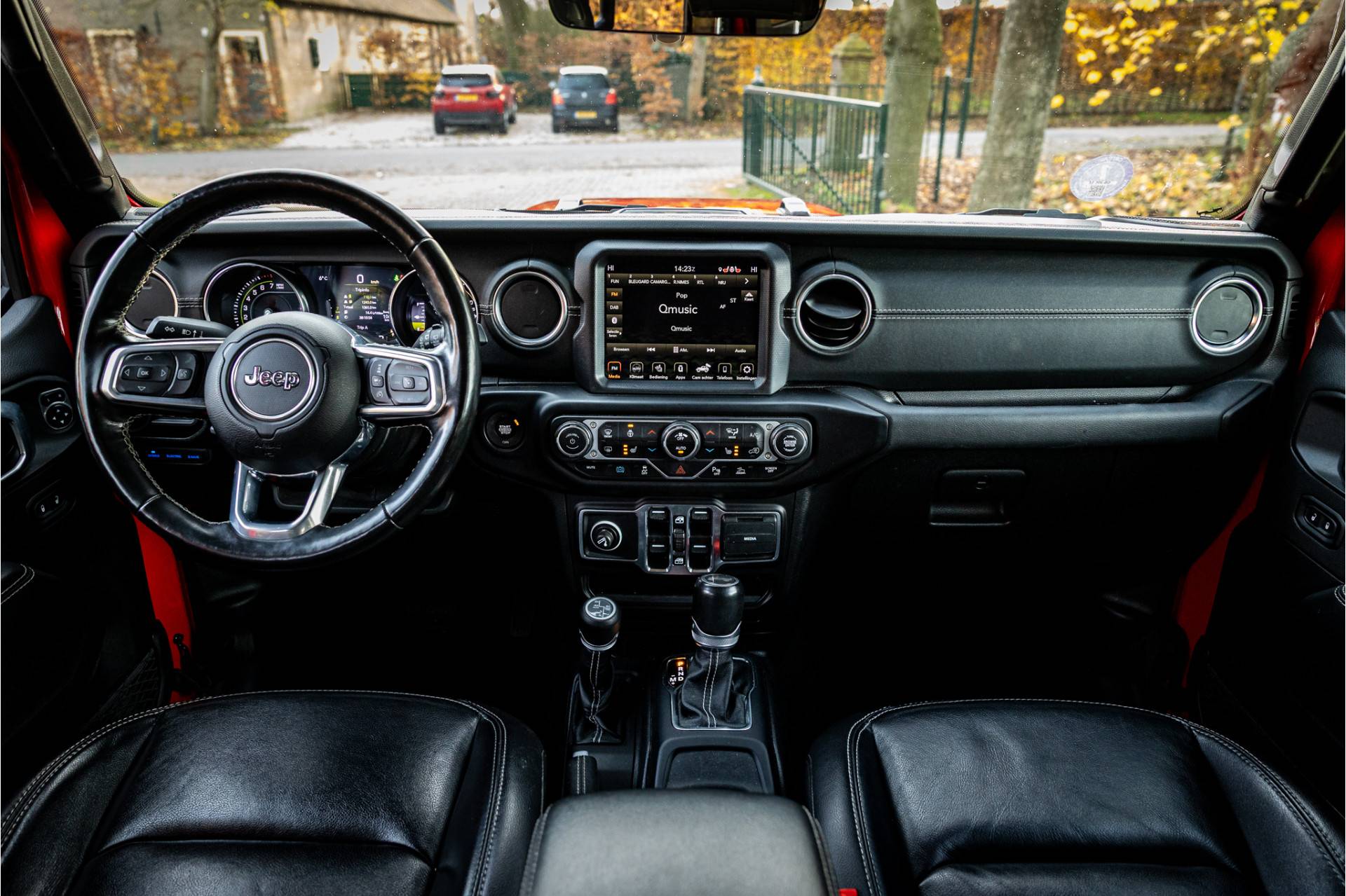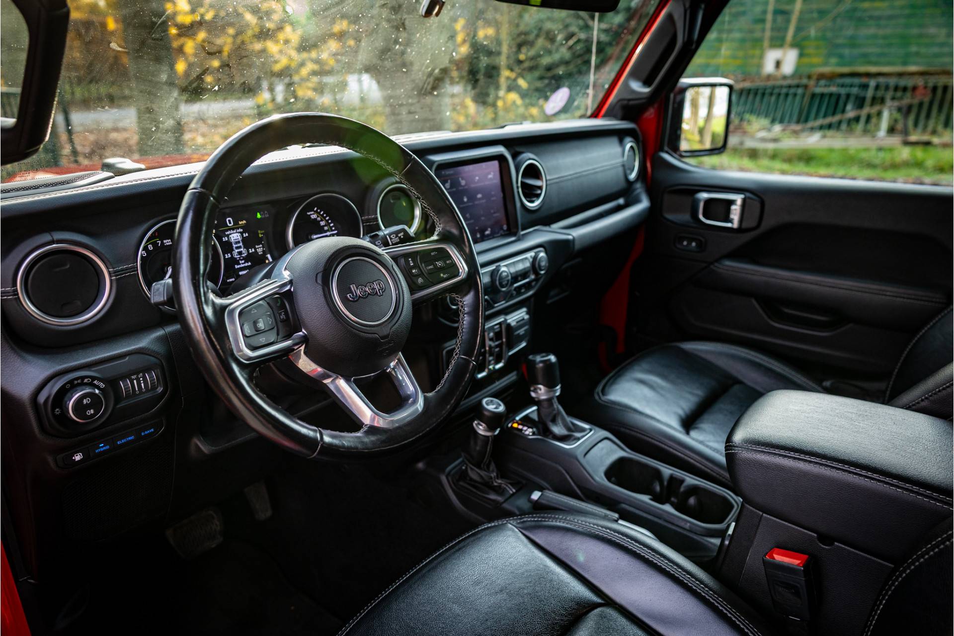 Keurige Jeep Wrangler Unlimited 4xe 380 Sahara met Overland Pack met plug in hybride aandrijving. Lakkleur is Firecracker Red en het interieur is voorzien van zwart leder met Overland logo. Deze Wrangler kan open worden gereden dankzij de uitneembare dakpanelen. Ook de portieren kunnen worden verwijderd en de voorruit is omklapbaar. Het rijden in de stad en snelweg kan volledig elektrisch worden gedaan, de elektrische actieradius bedraagt 45 kilometer.