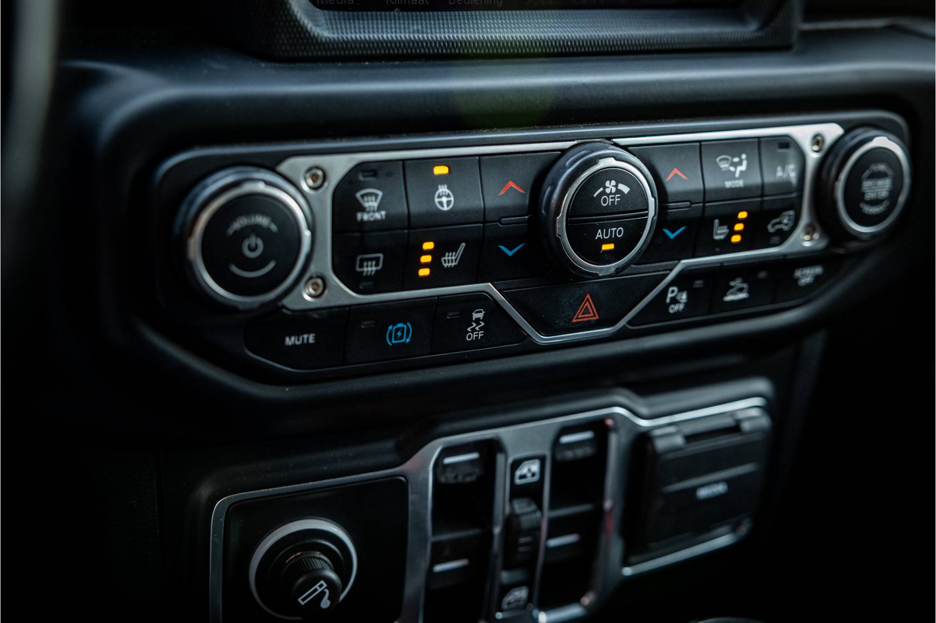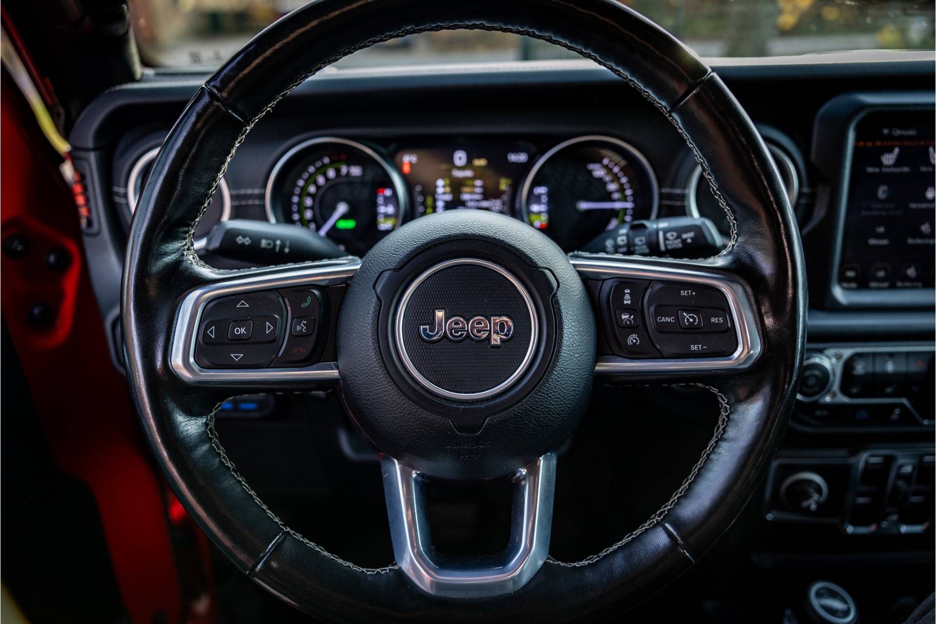 Tot de verdere uitrusting behoort adaptive cruise control met stop, keyless entry, afneembare trekhaak, dode hoek assistent, 8.4" touchscreen navigatie met Apple Carplay en Android Auto, Alpine Audio systeem met 9 speakers, bluetooth connectiviteit, Jeep navigatiesysteem, LED koplampen met auto high beam functie, camera voor en achter, verwarmbare voorstoelen en stuurwiel, dual zone klimaatregeling, 17" lichtmetalen velgen, hard cover reservewiel, parkeersensoren voor en achter, metallic lak, torx tool kit voor verwijdering van deuren en dak en omklappen voorruit en volwaardig reservewiel op achterklep.