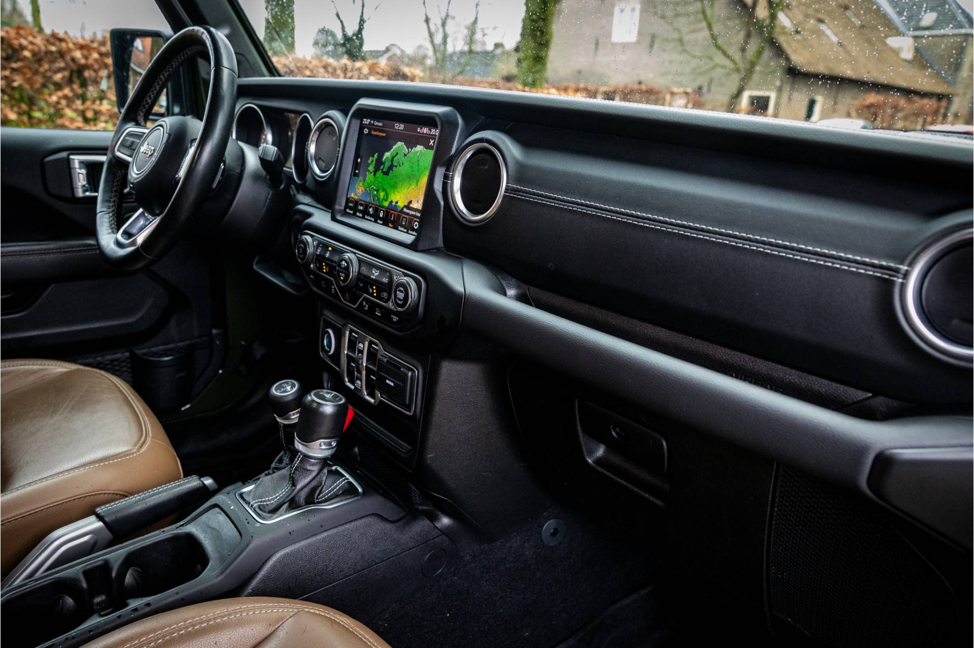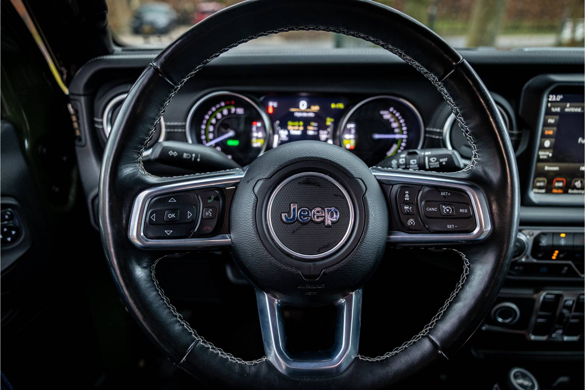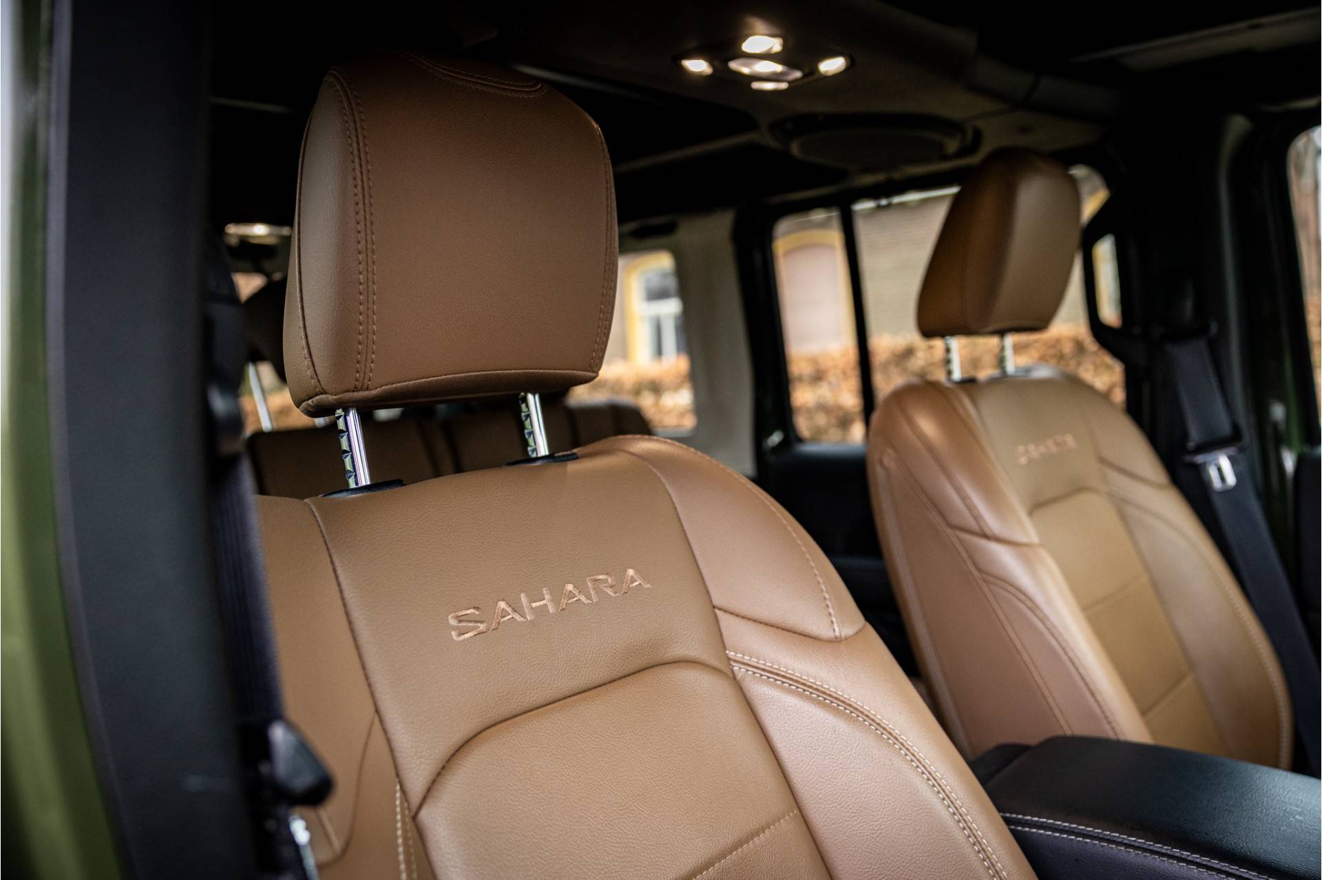 Tot de verdere uitrusting behoort adaptive cruise control met stop en go, keyless entry, dode hoek assistent, 8.4" touchscreen Jeep navigatie, Apple Carplay en Android Auto, Alpine Audio systeem met 9 speakers, LED koplampen met auto high beam functie, camera voor en achter, afneembare trekhaak, bluetooth connectiviteit, verwarmbare voorstoelen en stuurwiel, lederen bekleding, voorstoelen voorzien van Sahara logo, dual zone klimaatregeling, 17" lichtmetalen velgen, parkeersensoren voor en achter, trailer assist en volwaardig reservewiel op achterklep.