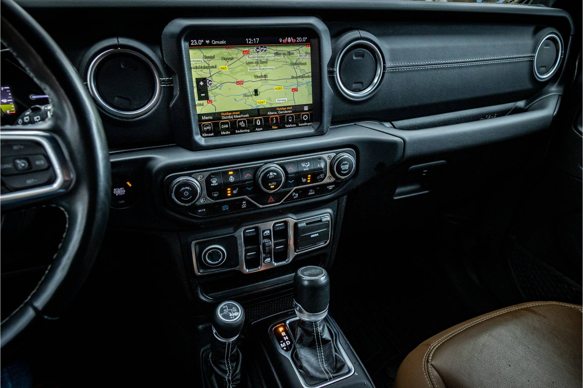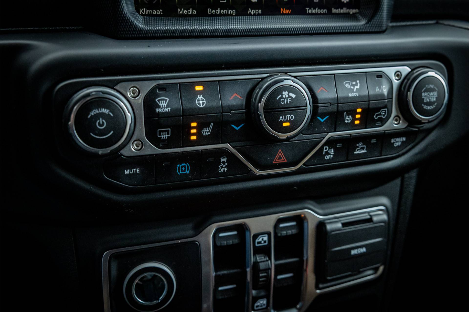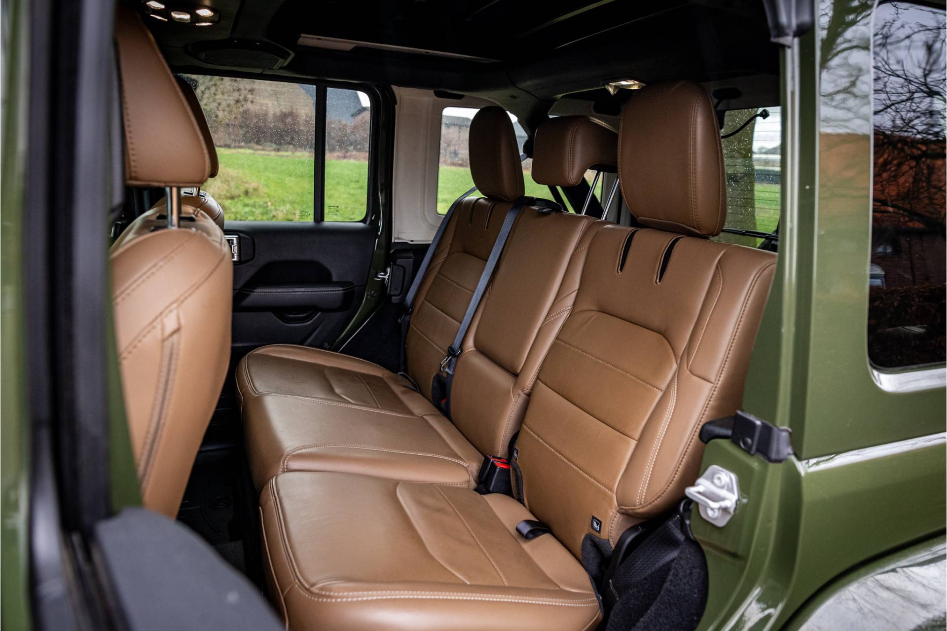 Tot de verdere uitrusting behoort adaptive cruise control met stop en go, keyless entry, dode hoek assistent, 8.4" touchscreen Jeep navigatie, Apple Carplay en Android Auto, Alpine Audio systeem met 9 speakers, LED koplampen met auto high beam functie, camera voor en achter, afneembare trekhaak, bluetooth connectiviteit, verwarmbare voorstoelen en stuurwiel, lederen bekleding, voorstoelen voorzien van Sahara logo, dual zone klimaatregeling, 17" lichtmetalen velgen, parkeersensoren voor en achter, trailer assist en volwaardig reservewiel op achterklep.