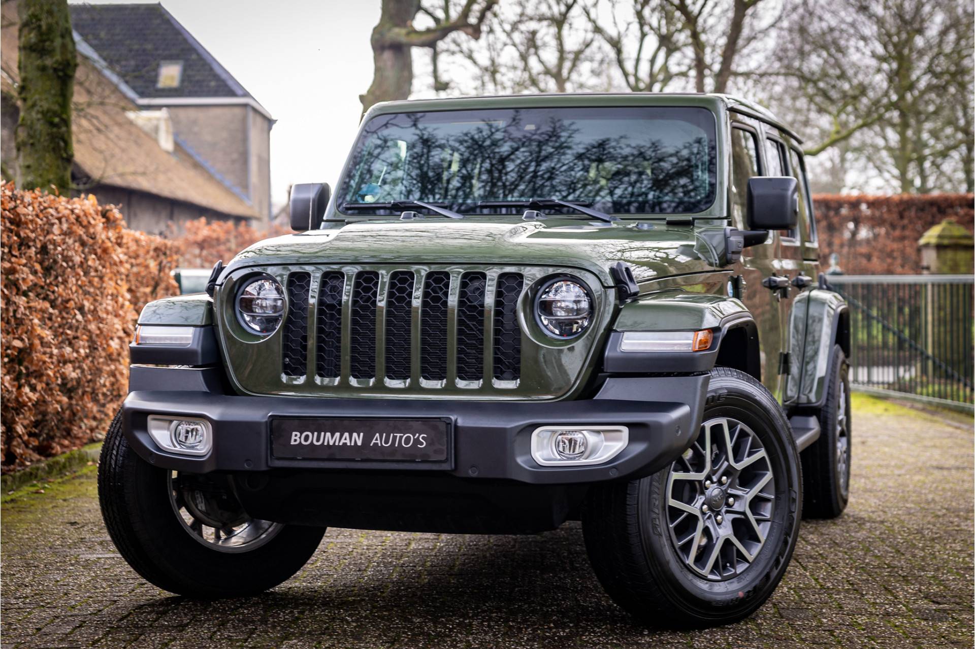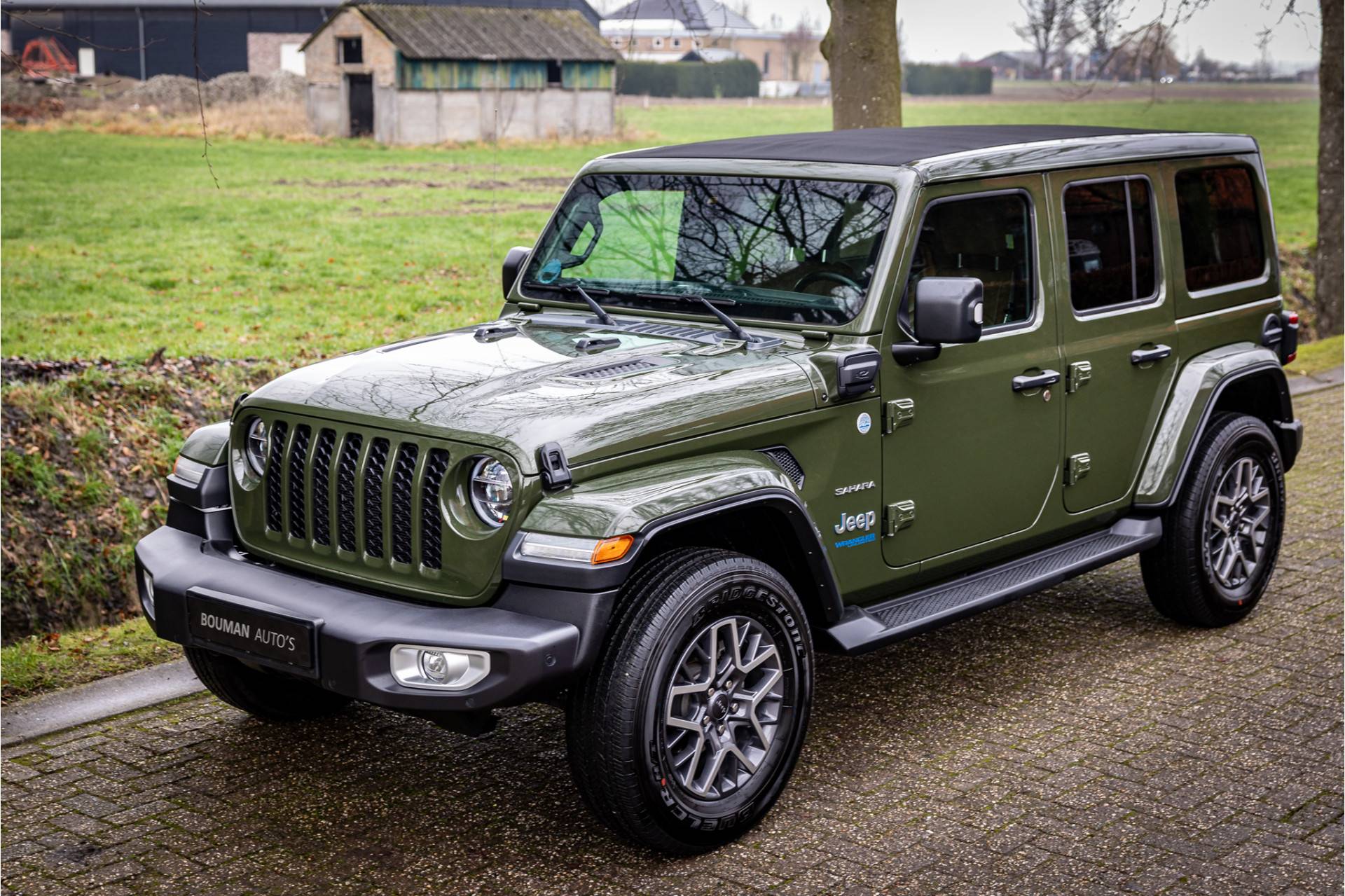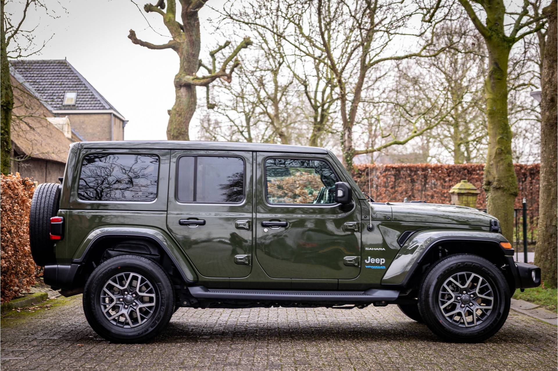 Keurige Jeep Wrangler Unlimited 4xe 380 Sahara met plug in hybride aandrijving. Lakkleur is Sarge Green en het interieur is voorzien van cognac leder. Deze Wrangler is volledig open te rijden dankzij de elektrisch bedienbare softtop die over de gehele lengte opengeschoven kan worden. Ook de portieren kunnen worden verwijderd en de voorruit is omklapbaar. Ook de portieren kunnen worden verwijderd en de voorruit is omklapbaar. Het rijden in de stad en snelweg kan volledig elektrisch worden gedaan, de elektrische actieradius bedraagt 45 kilometer.