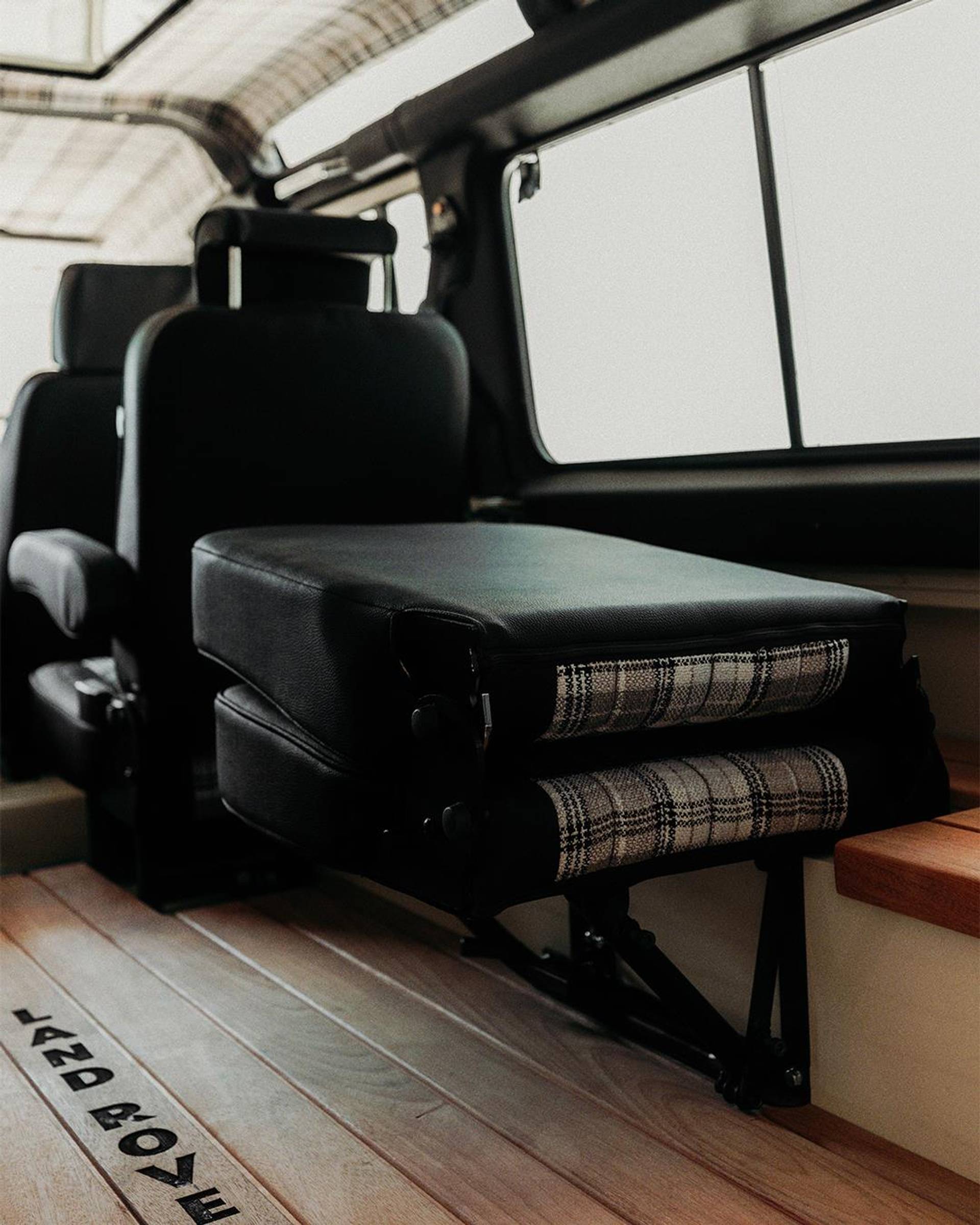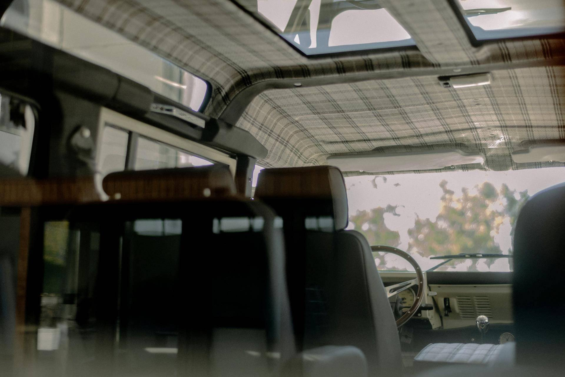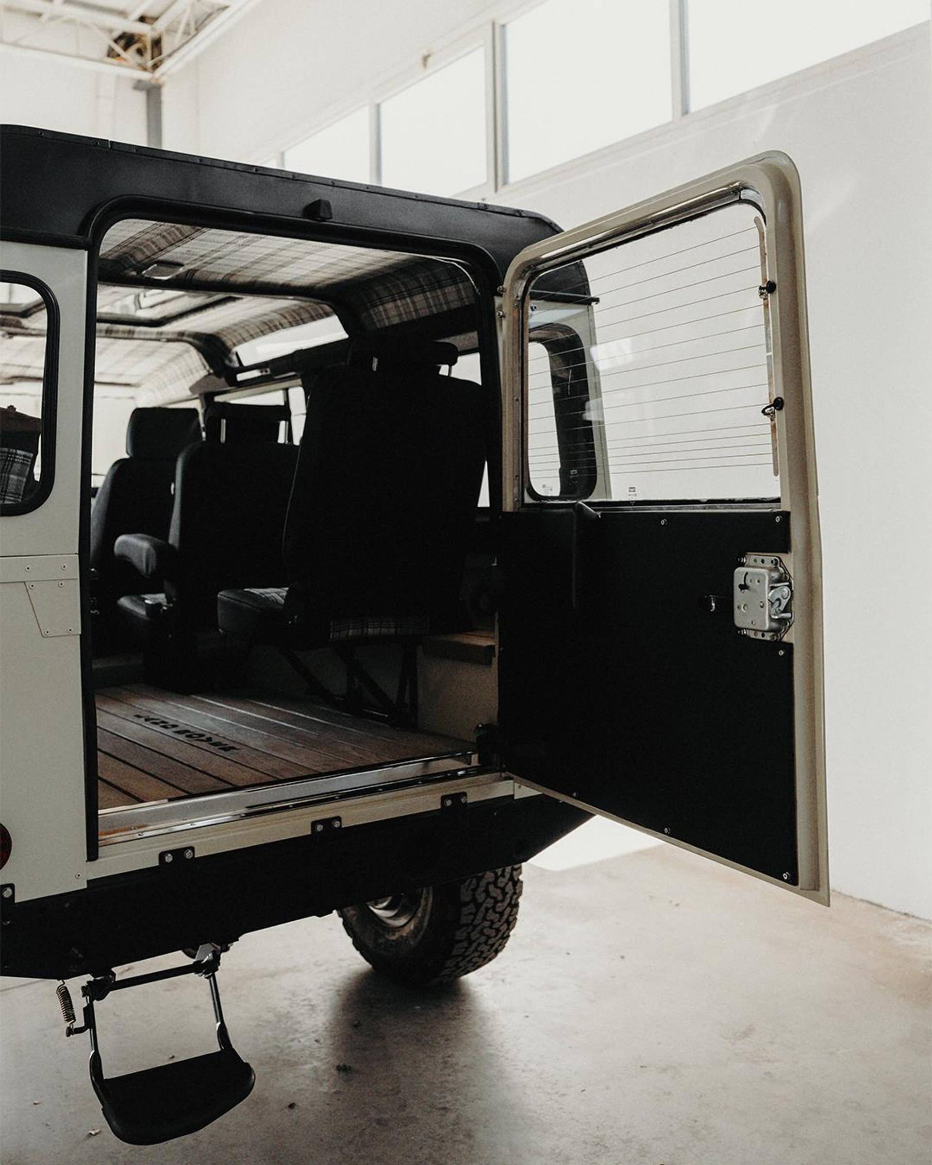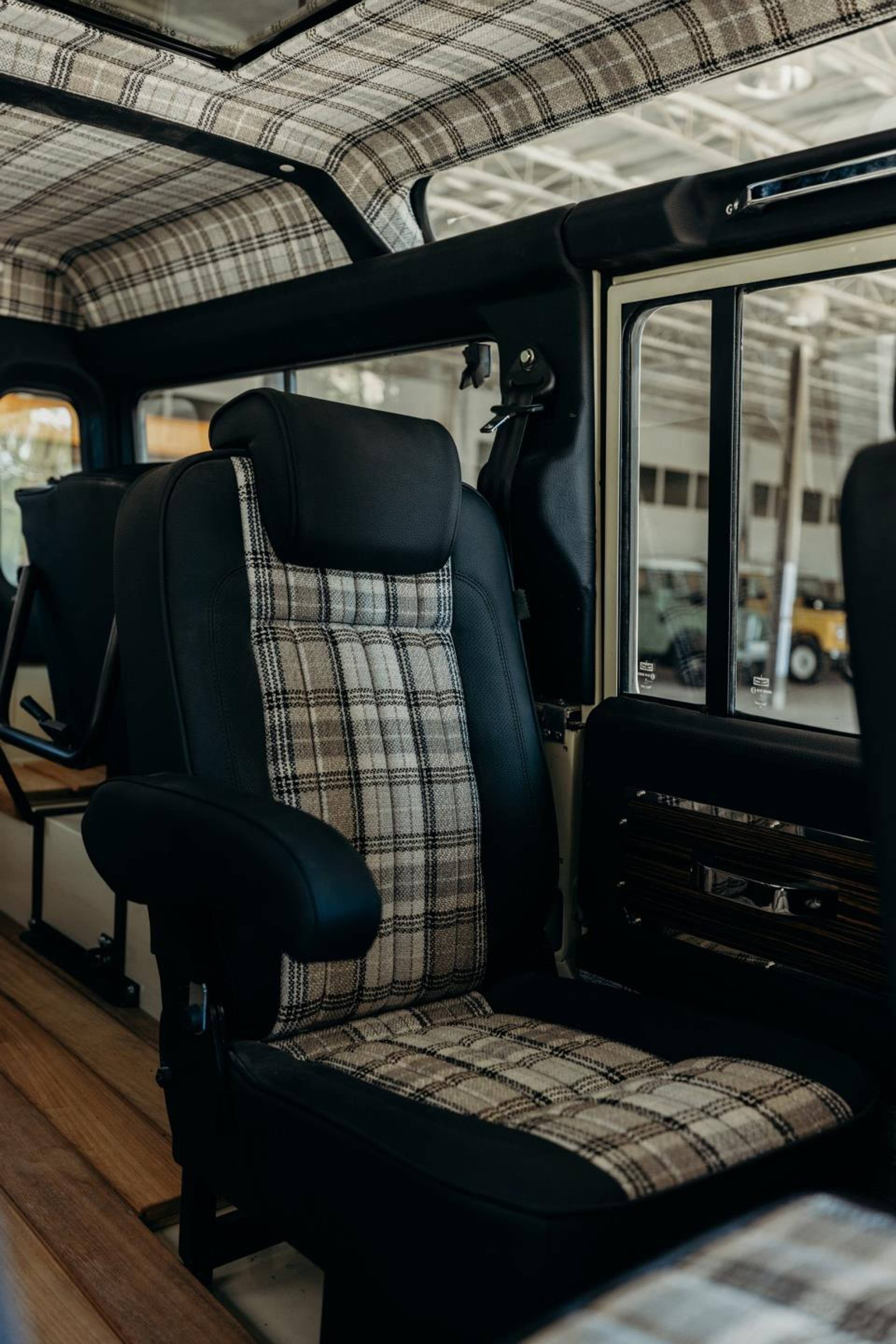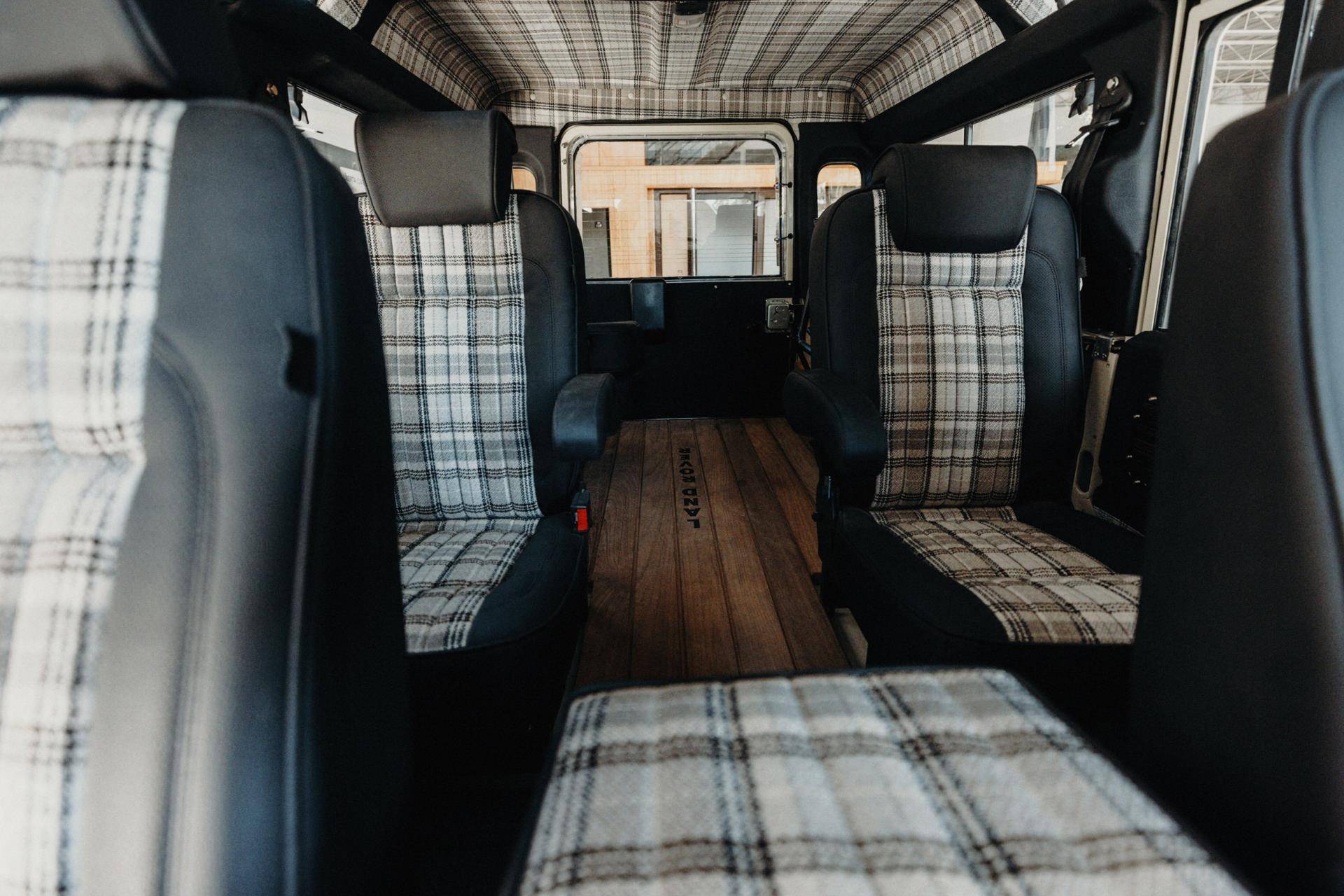 Comfort upgrades have been carefully integrated without compromising the Defender’s authentic character. These include improved suspension, power steering, and a modern air-conditioning system discreetly integrated into the original ventilation layout. Enhanced sound and thermal insulation significantly improves cabin comfort compared to standard Defenders. The interior features a flexible 2+2+2 seating configuration, premium details such as teak wood flooring, and a restored interior that balances rugged utility with refined craftsmanship.