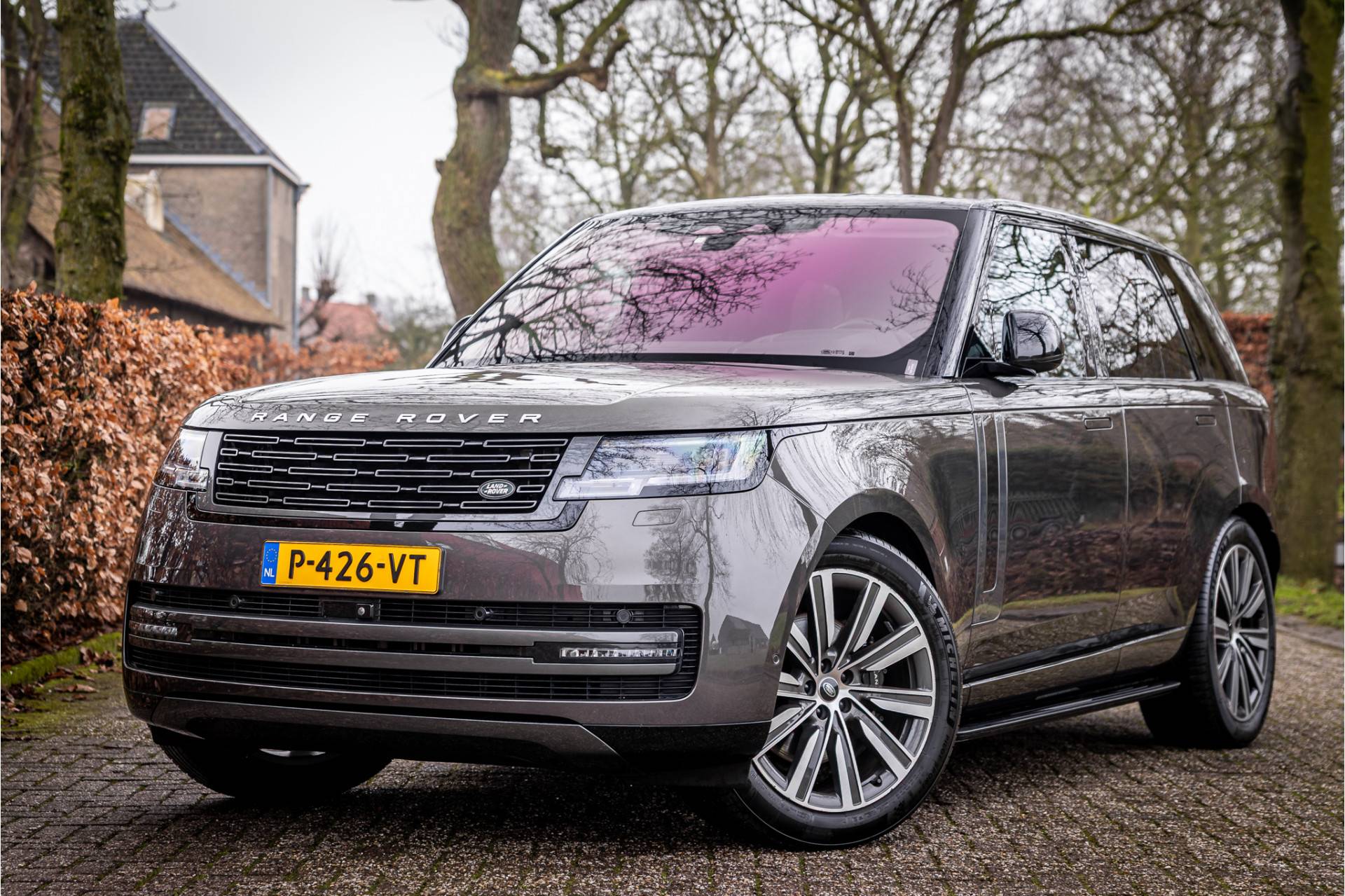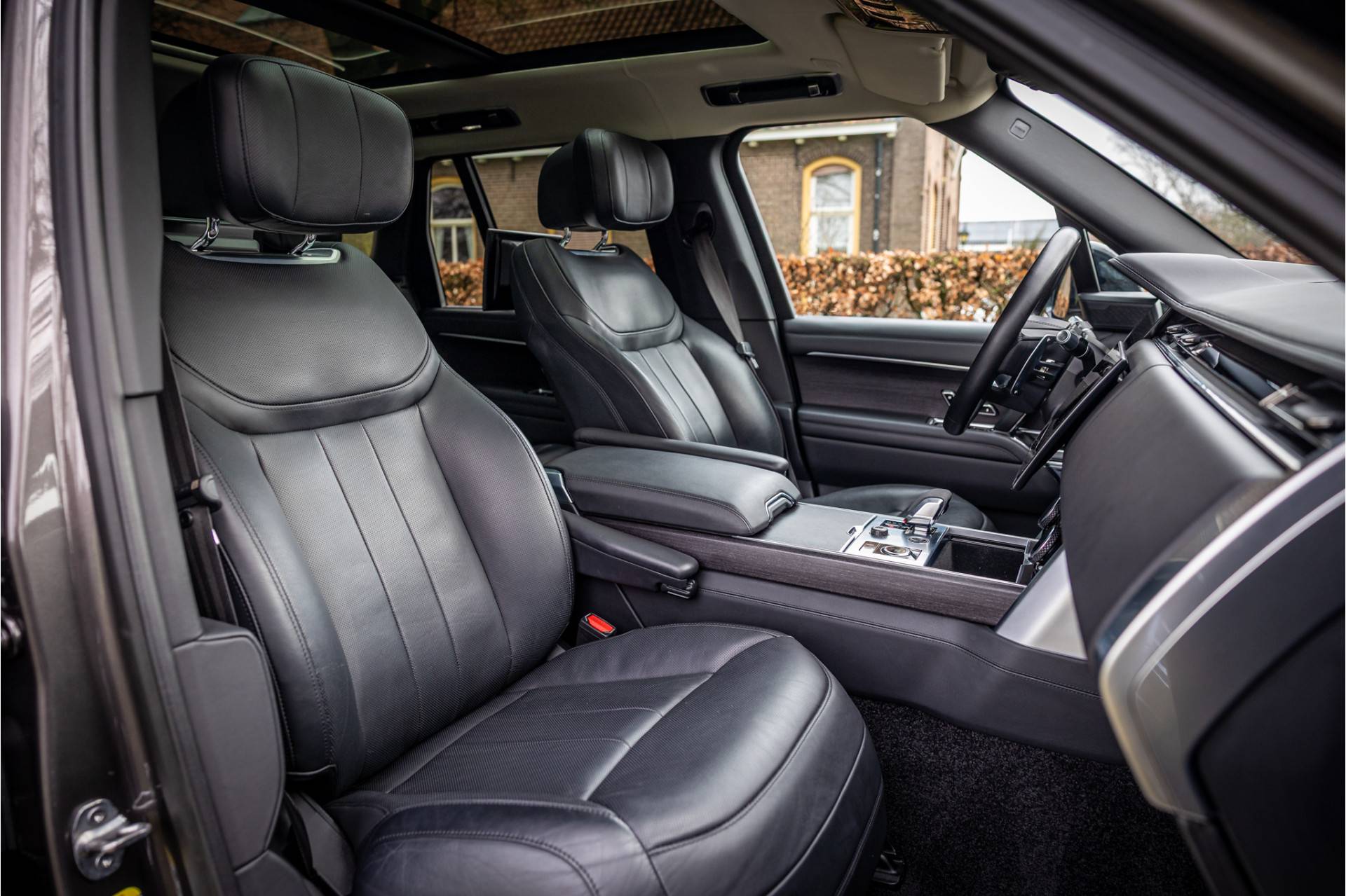 Fraaie Range Rover P400 First Edition aangedreven door zijdezachte zescilinder en stijlvolle kleursamenstelling. Lakkleur is Charente Grey premium metallic, het interieur is bekleed met geperforeerd Perlino zwart leder wat ook is doorgevoerd op het dashboard. De volledige interieurhemel is bekleed met leder.