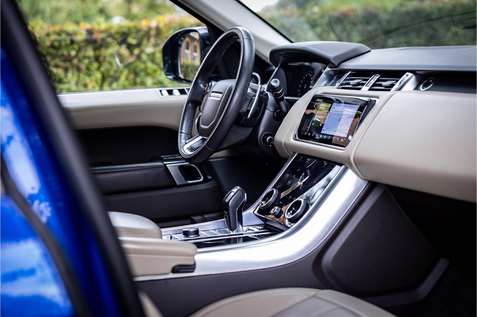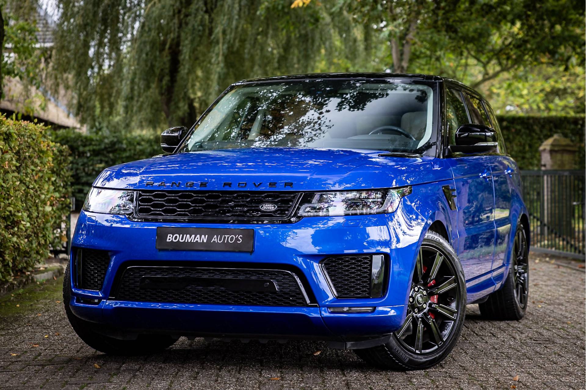 Fraaie Range Rover Sport in HSE Dynamic uitvoering met hybride aandrijflijn. Deze auto is afkomstig van de eerste eigenaar en in nette staat. Lakkleur is SVO Velocity Blue, dit is een exclusieve lak afkomstig van Landrover Special Vehicle Operations, deze afdeling is gespecialiseerd in het individualiseren van Range Rover modellen. Deze lakkleur heeft een meerprijs van 5.500 euro. Het interieur is bekleed met Ebony beige leder. De auto is aan de buitenzijde voorzien van een black pack in combinatie met rode remklauwen. Het dak is gespoten in hoogglans zwart wat een fraai contrast geeft met de blauwe lakkleur.