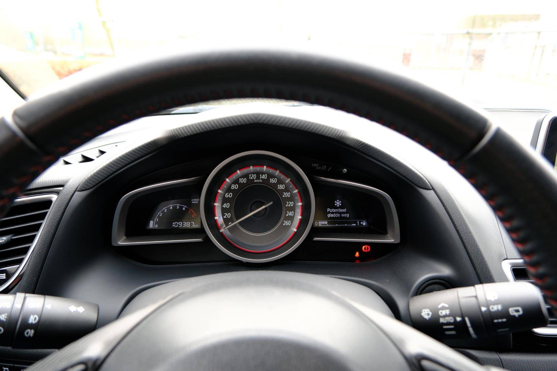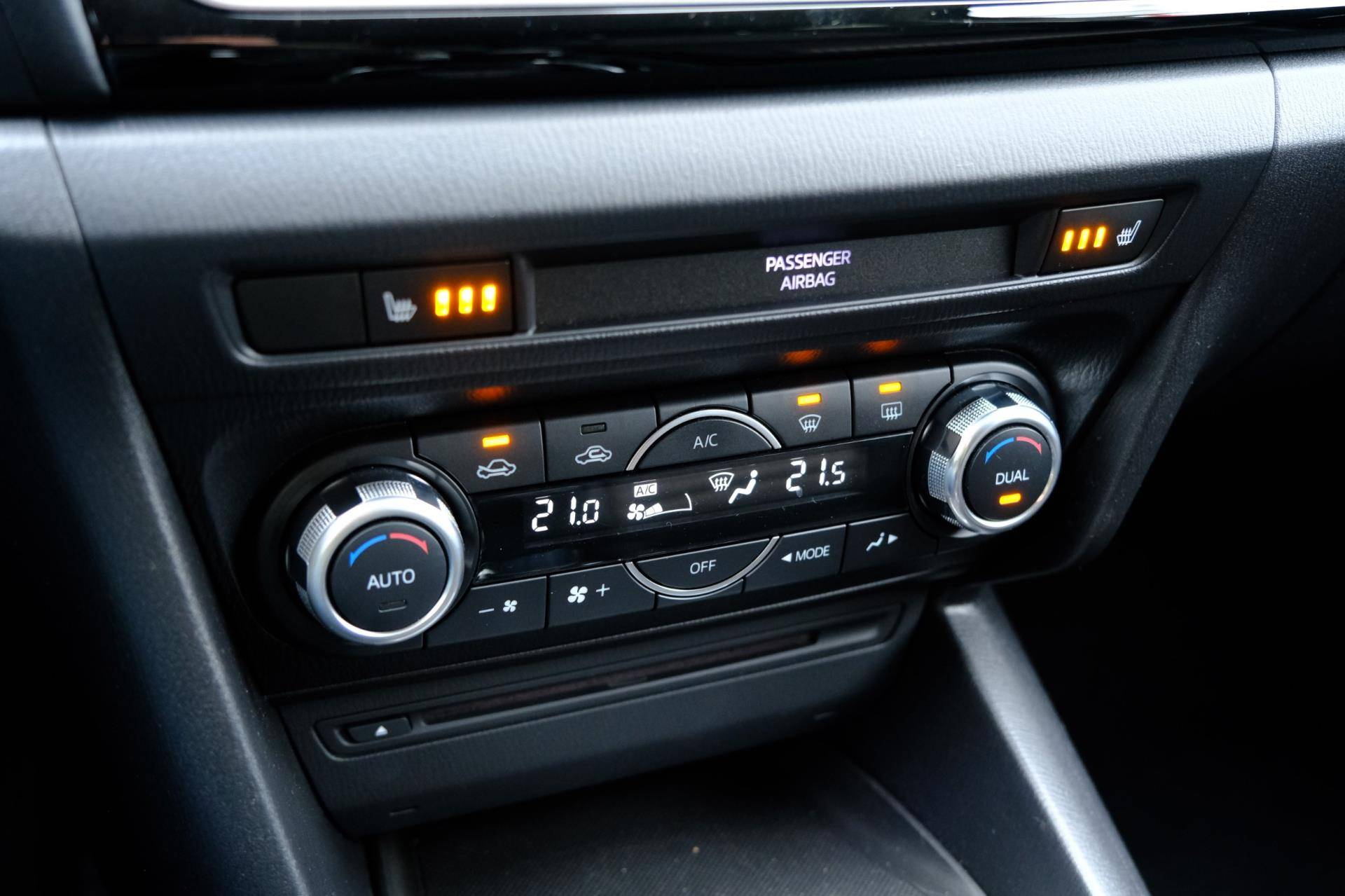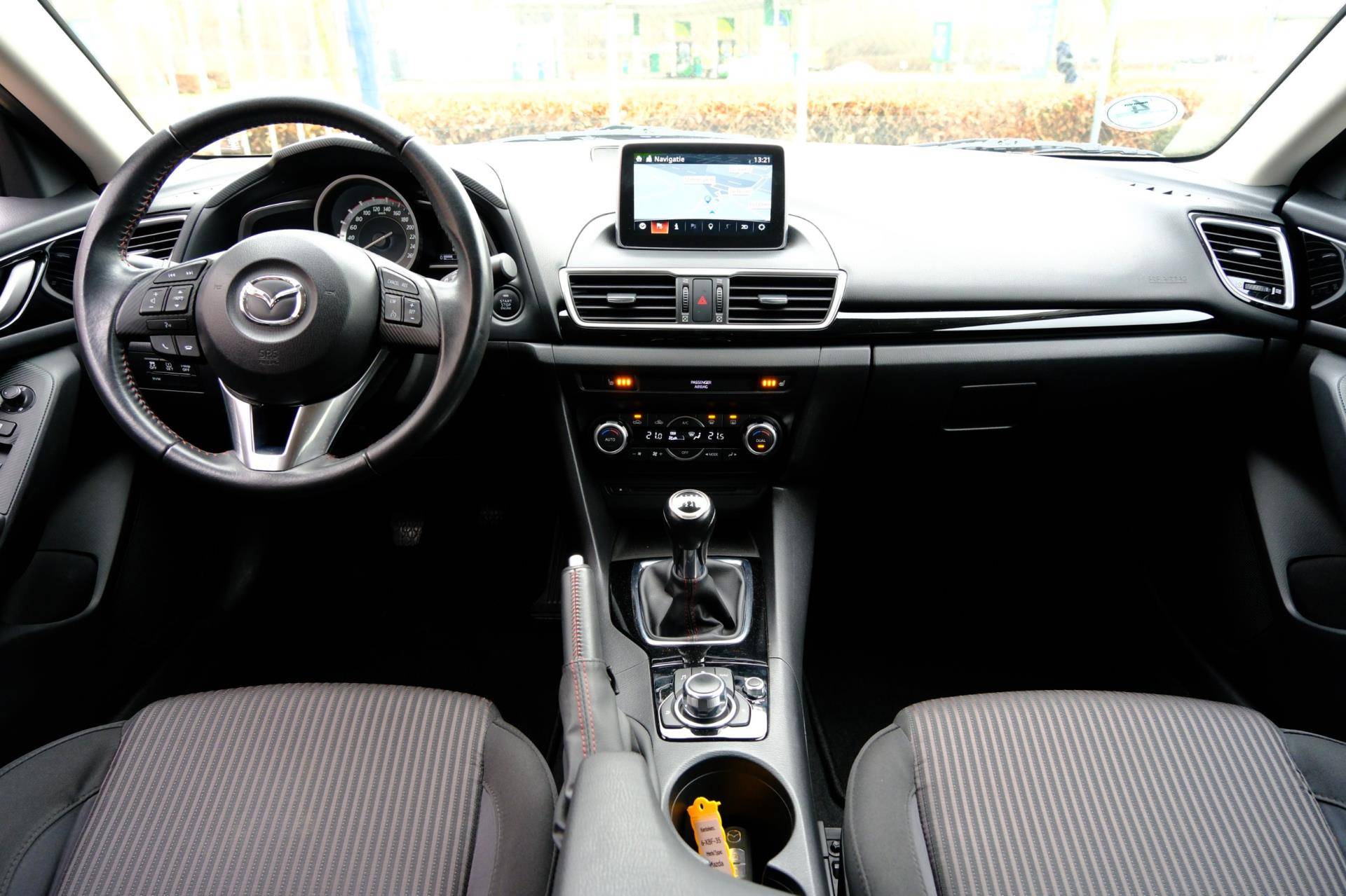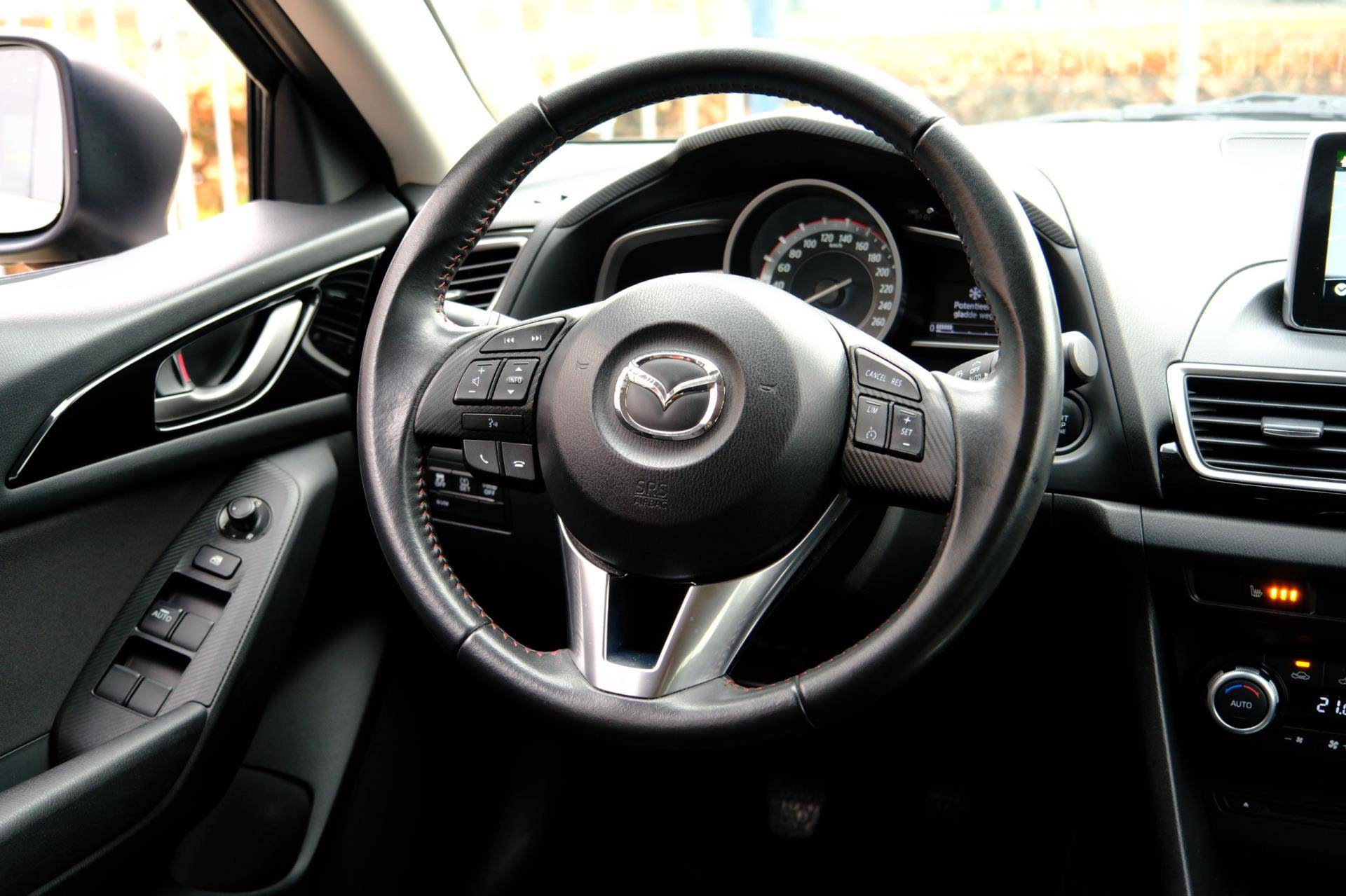 U kunt uw ogen op de weg houden, want het audiosysteem en het full map navigatiesysteem bedient u vanaf het stuurwiel. Het comfort wordt verhoogd door de aanwezige automatische airconditioning. De meeste schade bij inparkeren komt van een randje of paaltje dat u even niet zag. Maar de parkeersensoren zien alles en waarschuwen op tijd. Om de veiligheid onderweg te verhogen, heeft deze Mazda zowel een automatisch inschakelbare verlichting als een regensensor aan boord, zodat hij zelf de verlichting en de ruitenwissers kan inschakelen. Kleine ritjes, grote reizen - altijd een relaxte aankomst dankzij de cruise control. Met automatisch dimmende binnenspiegel, lederen stuur, centrale deurvergrendeling met afstandsbediening en boordcomputer is deze auto helemaal compleet.
