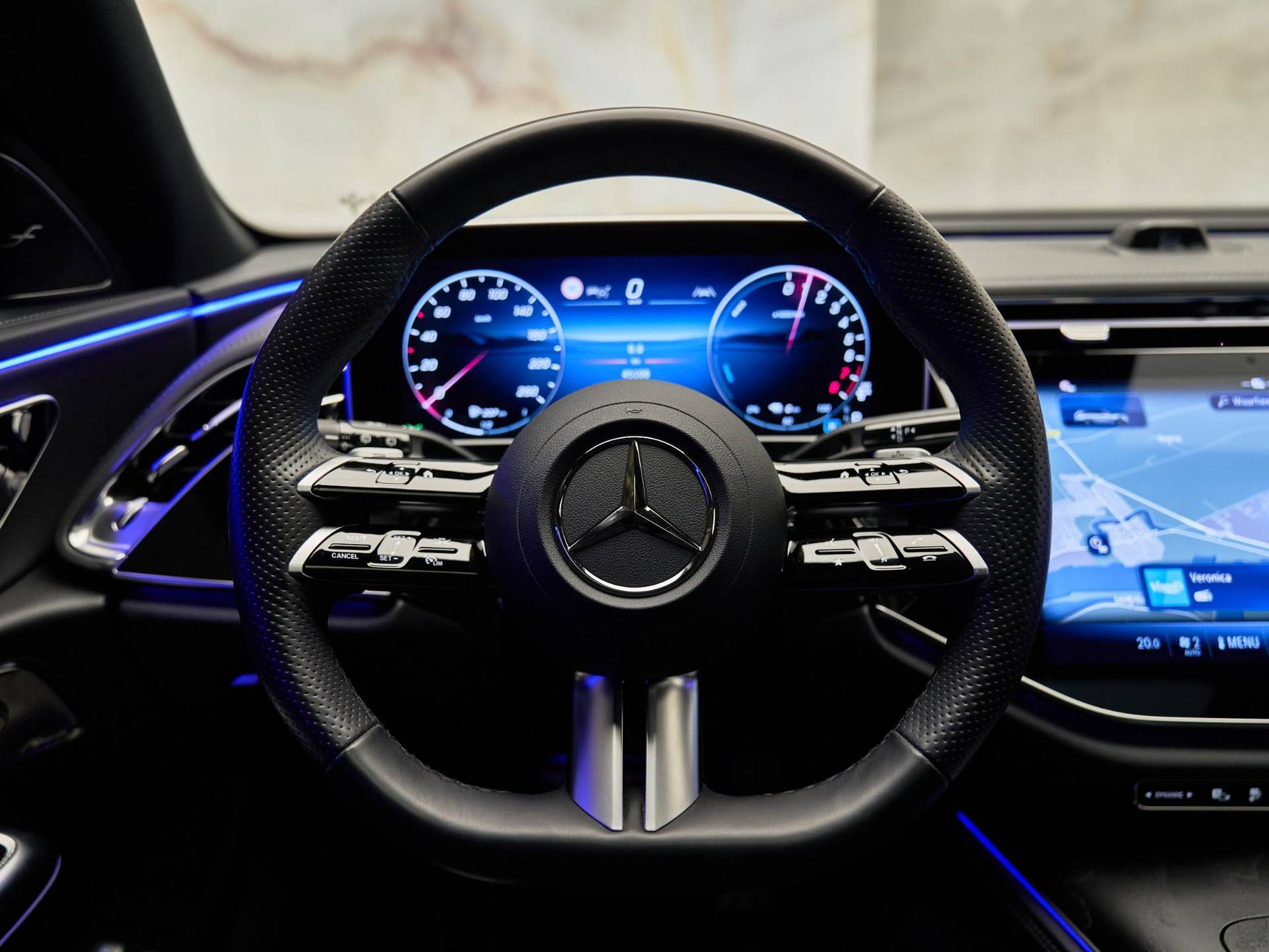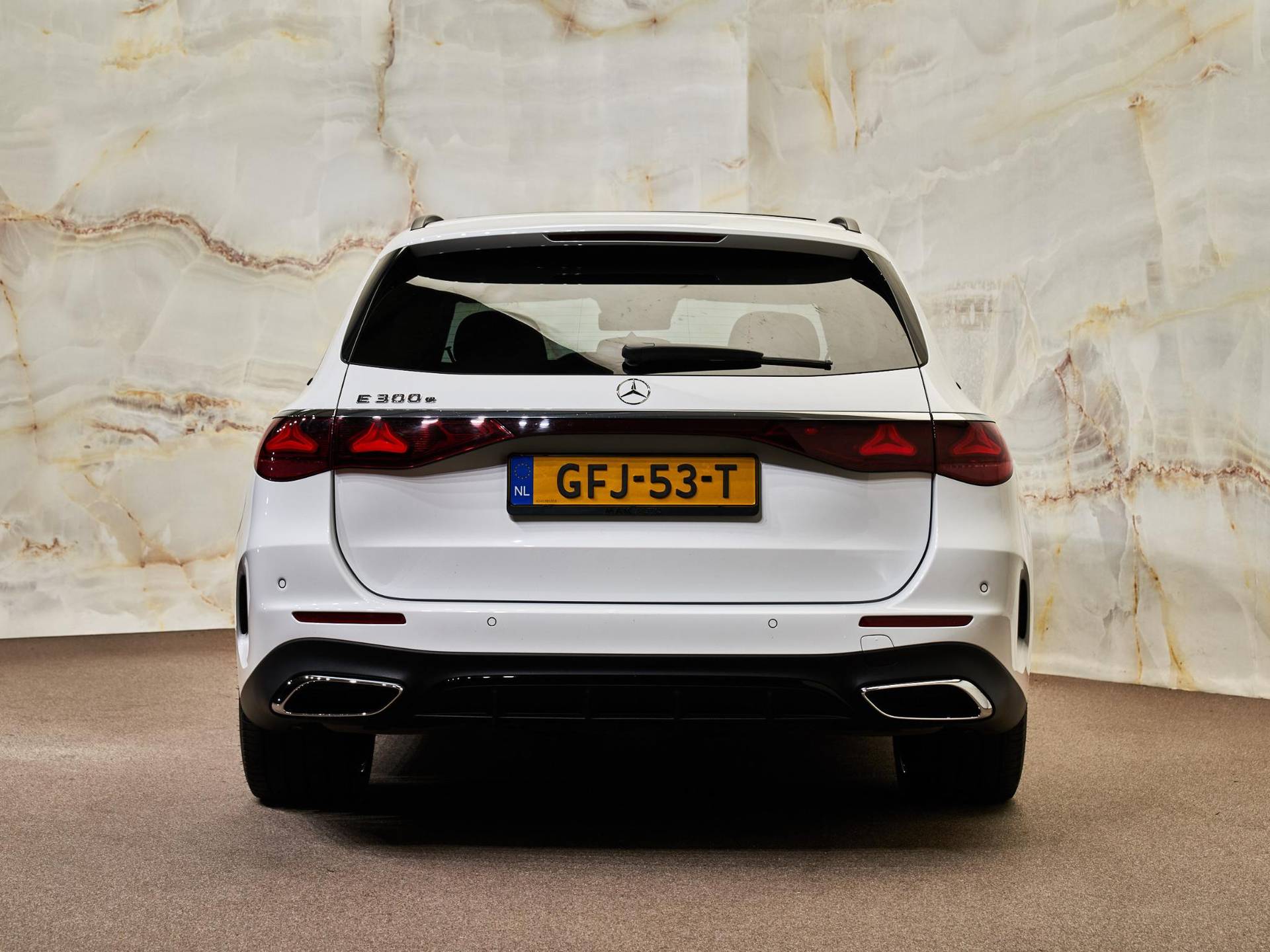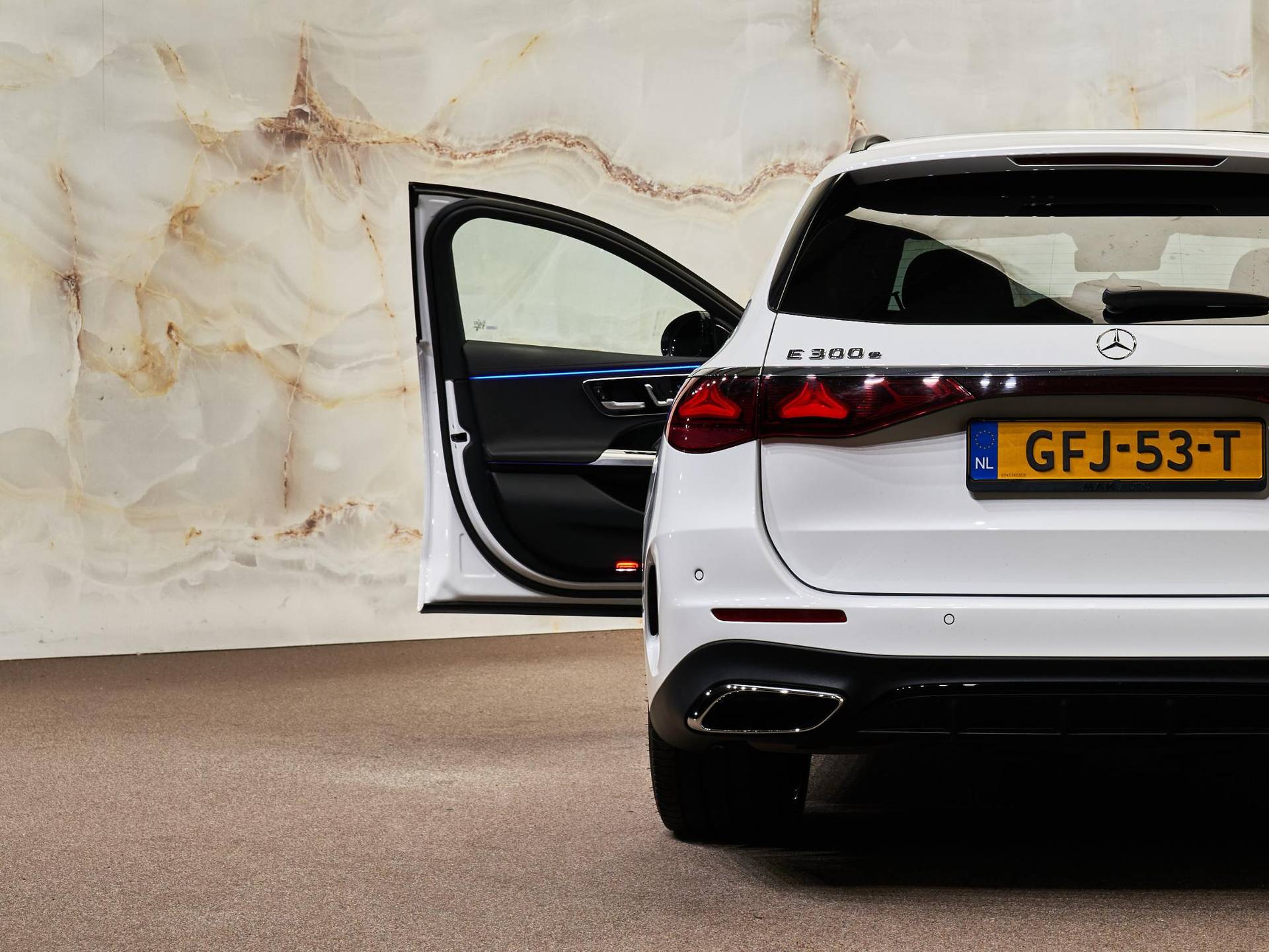 Het AMG Line exterieur (P31) en AMG Line interieur (P29) geven deze E-Klasse een uitgesproken sportieve uitstraling. In combinatie met het Nightpakket (P55), AMG-styling (772) en 20 inch multispaaks lichtmetalen AMG-velgen (RVR) oogt de auto dynamisch en modern. Het interieur is verder verfijnd met openporig essenhout (753), verlichte instaplijsten (U25), AMG-vloermatten (U26) en een supersportstuurwiel in leder (L5C).