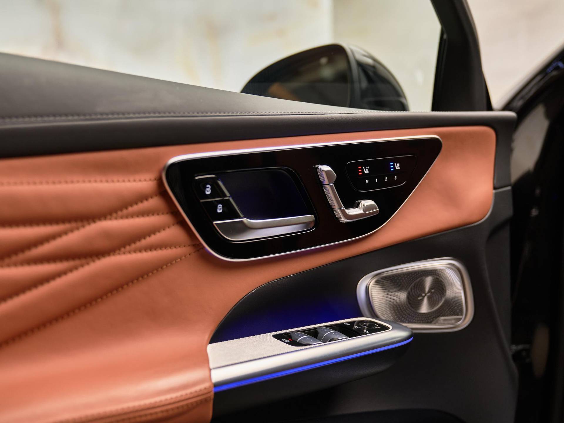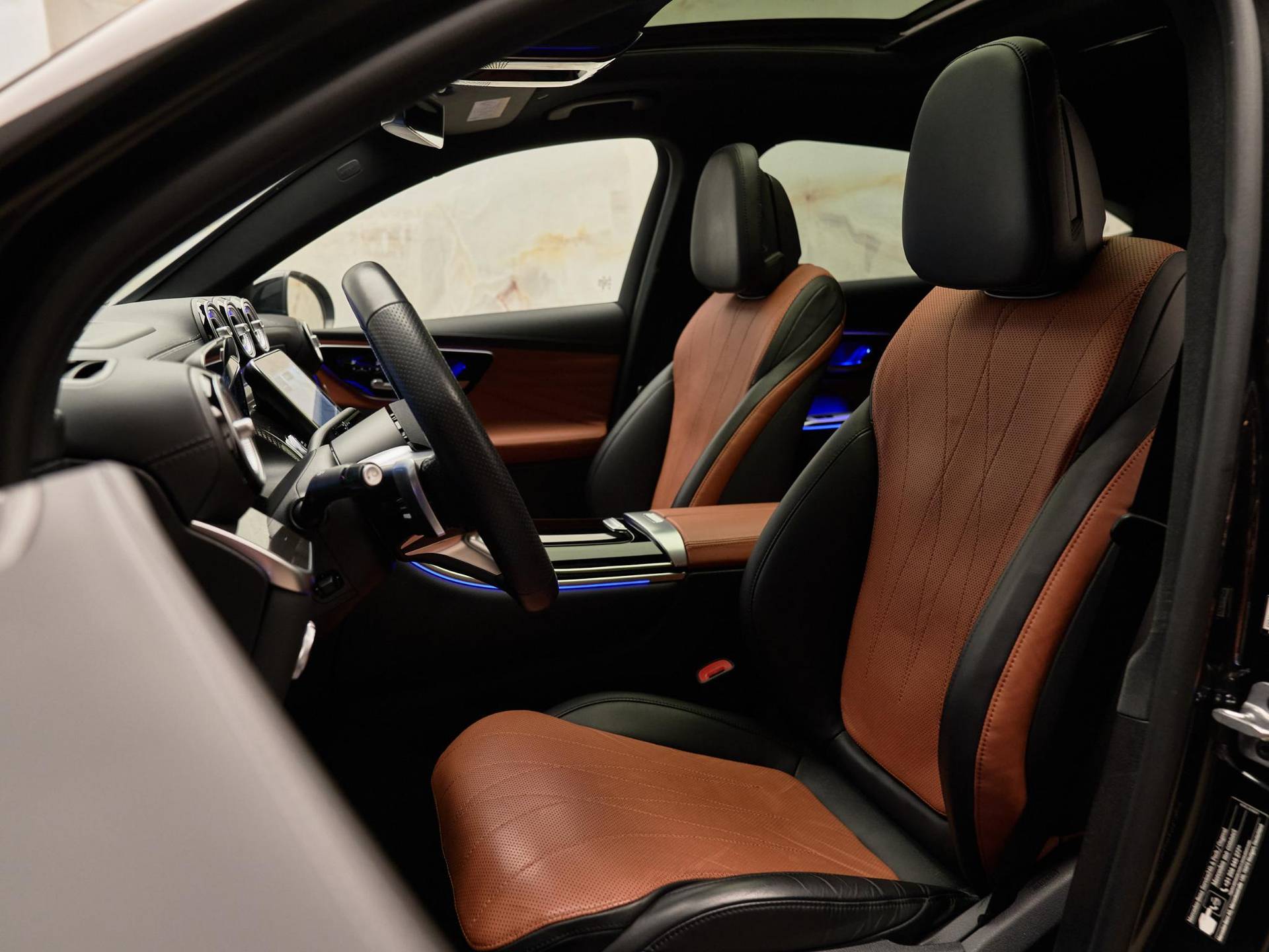 Voor maximaal comfort beschikt deze GLC over AIRMATIC luchtvering (489), die zorgt voor een uitzonderlijk soepele rit. De verwarmde en geklimatiseerde stoelen vóór (401) en de multicontourstoelen met massagefunctie (399) creëren een ultieme zitervaring. De achterpassagiers genieten van extra comfort dankzij de stoelverwarming achter (872). Met het Panoramaschuifdak (413) komt er extra licht en ruimte de cabine binnen. Het Memorypakket (275) in combinatie met de elektrisch verstelbare stoelen (241, 242) en het verwarmde stuurwiel (443) maken het interieur compleet. De sfeerverlichting Premium Plus (894) en hoogwaardige materialen zoals ARTICO-dashboardbekleding (U34) geven het interieur een luxe ambiance.