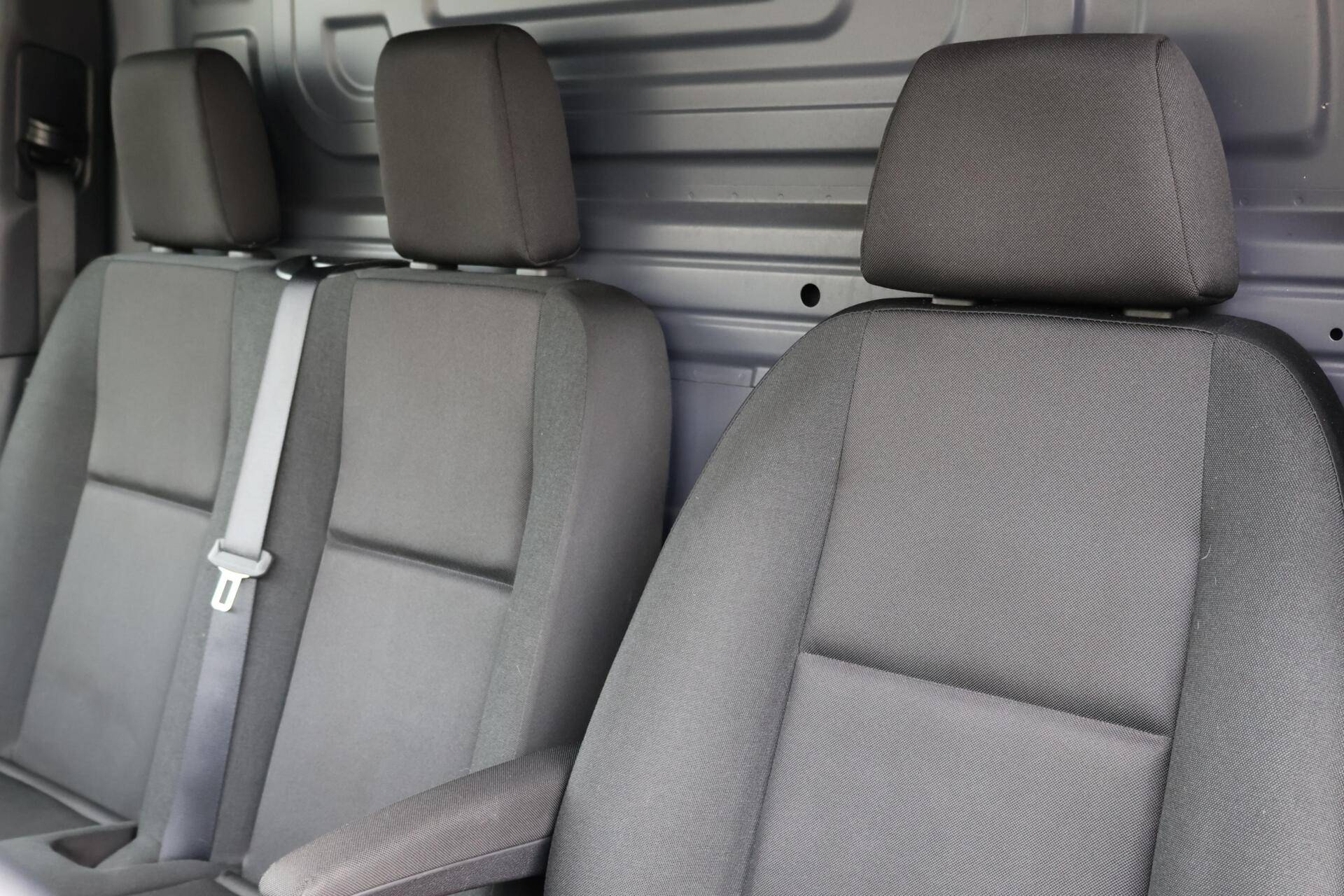 Uitgevoerd in Arktikweiß met zijschuifdeur rechts en volledig tussenschot. Binnenin drie zitplaatsen, comfortabele stoelen (verwarmd) en draaibare voorstoelen. Een cabine die functioneel is, maar duidelijk een stap boven basis.