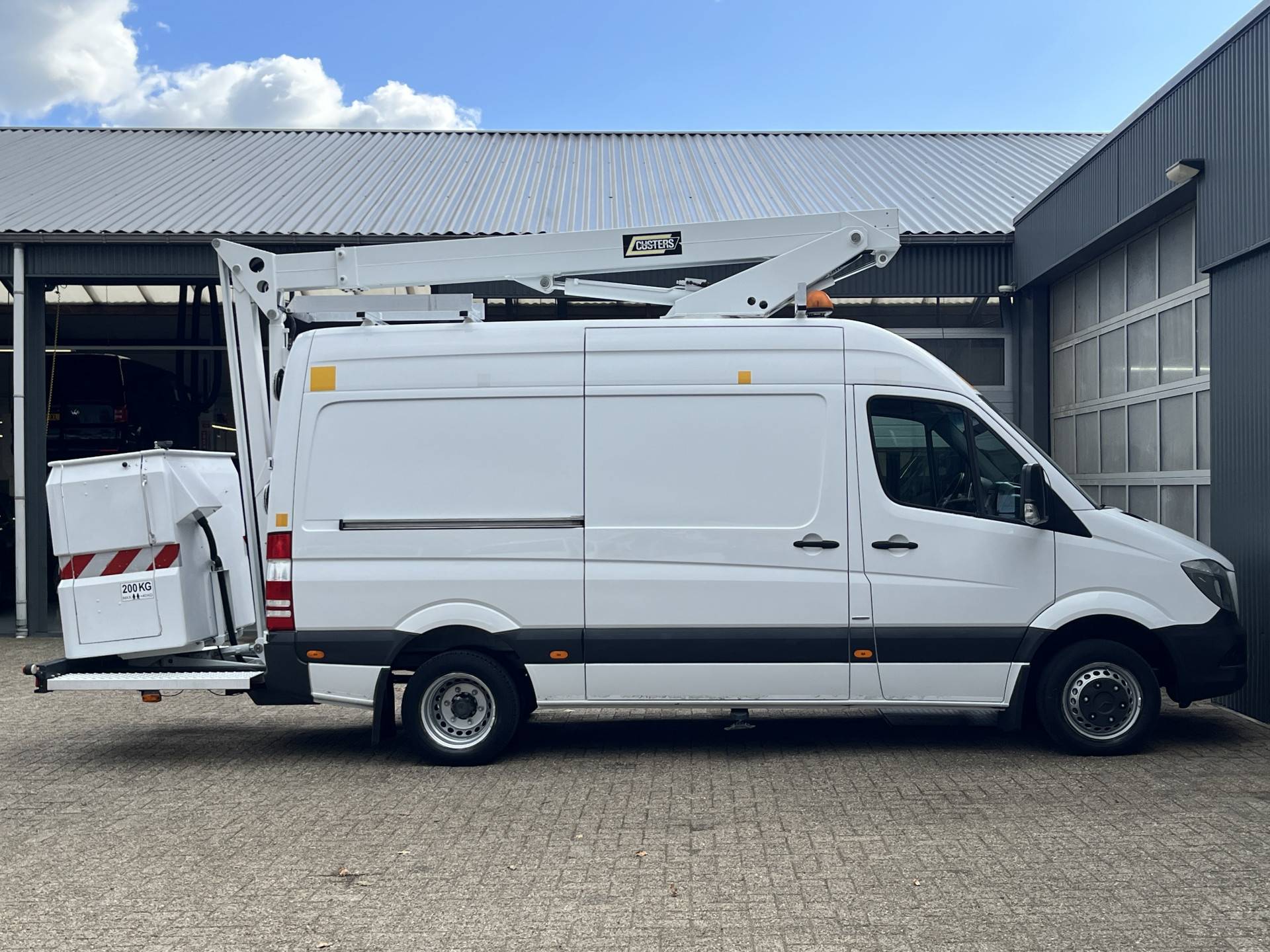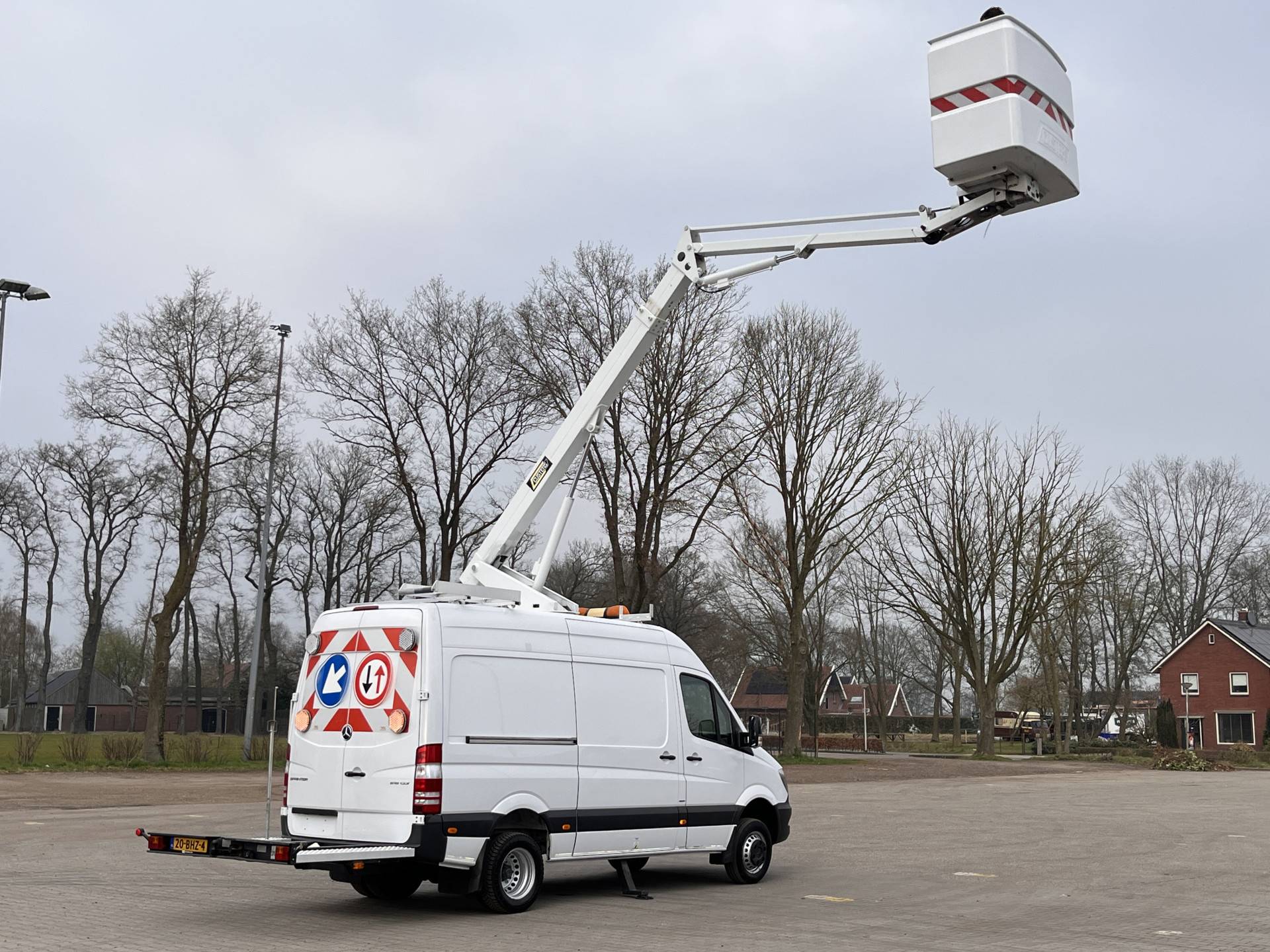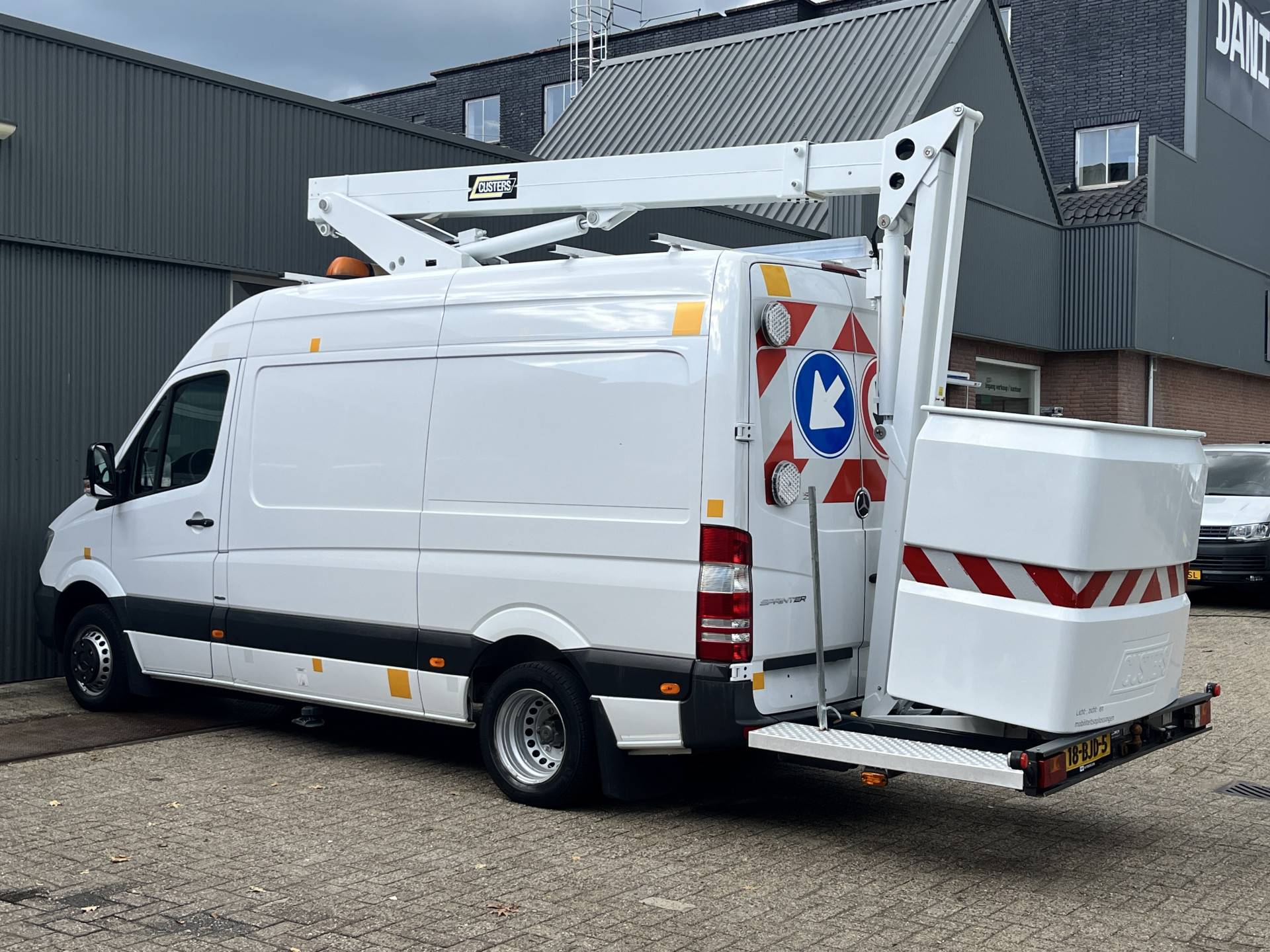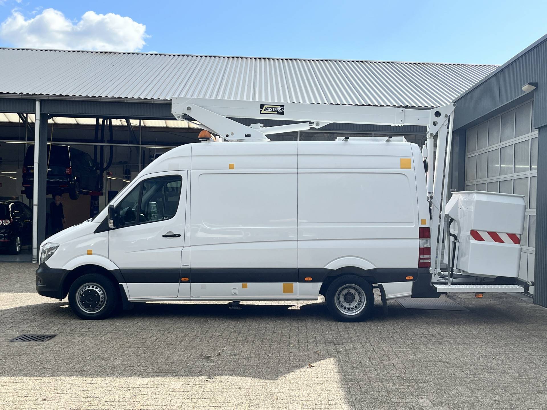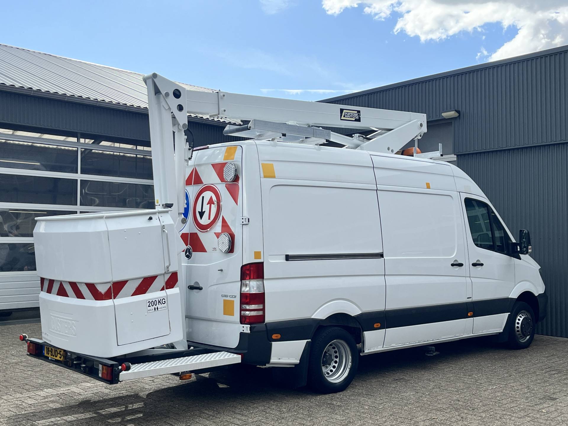 Een zeer nette Mercedes Sprinter 516 160pk Hoogwerker 14 meter Pto Omvormer Verkeersbord Bedieningspaneel Kastinrichting Airco Cruise control Tachograaf Steunpoten Telefoonverbinding Euro 6