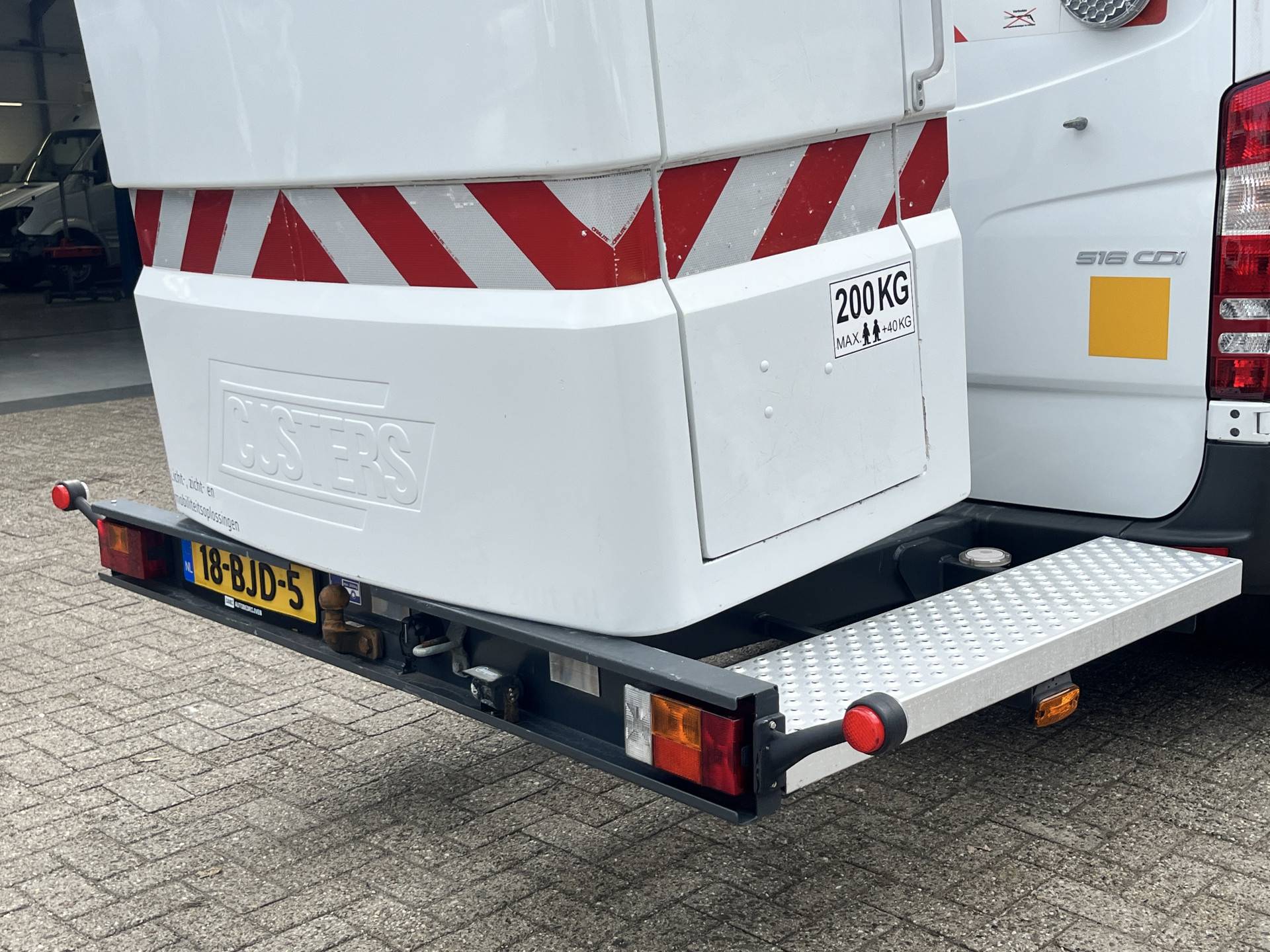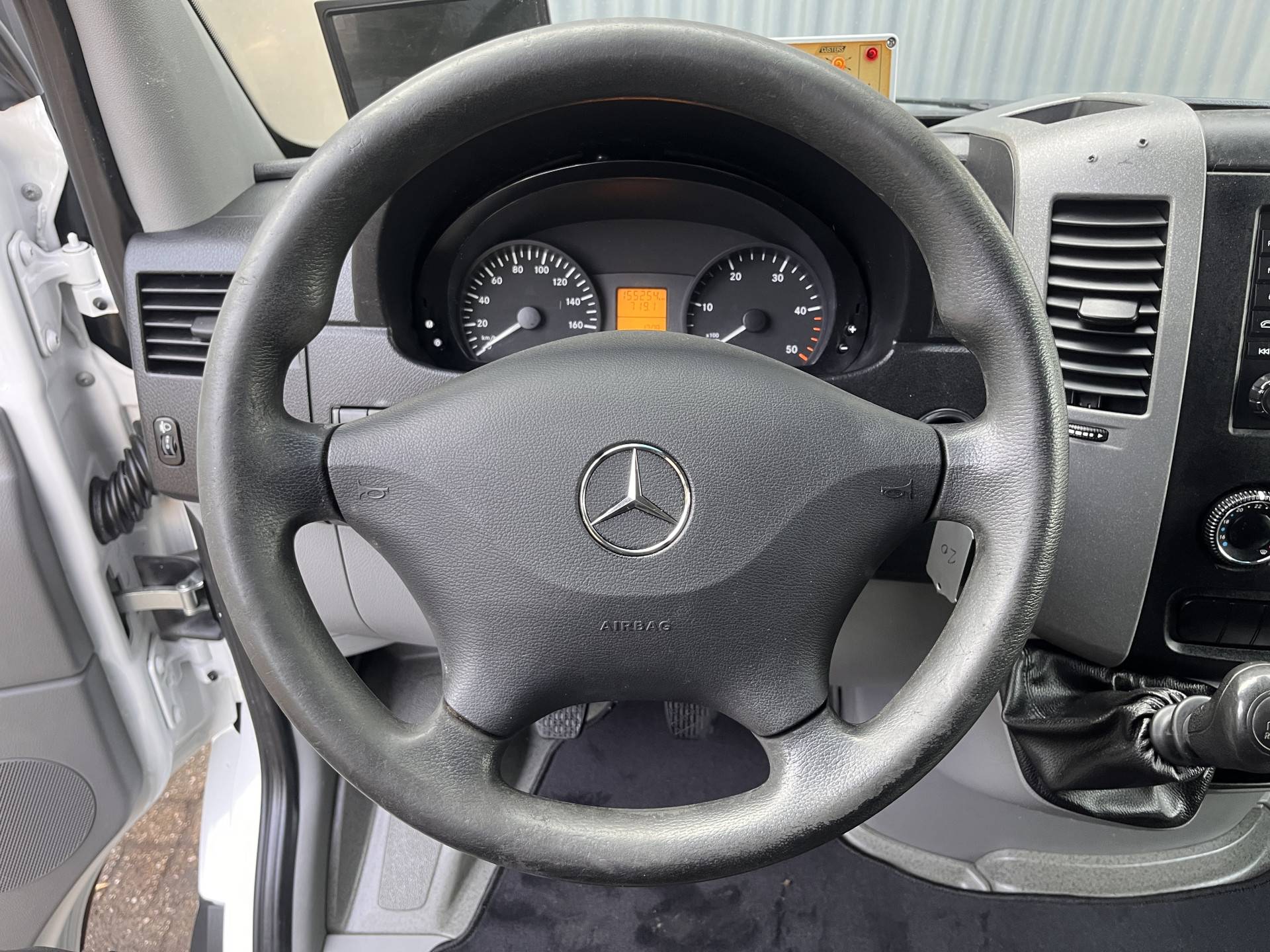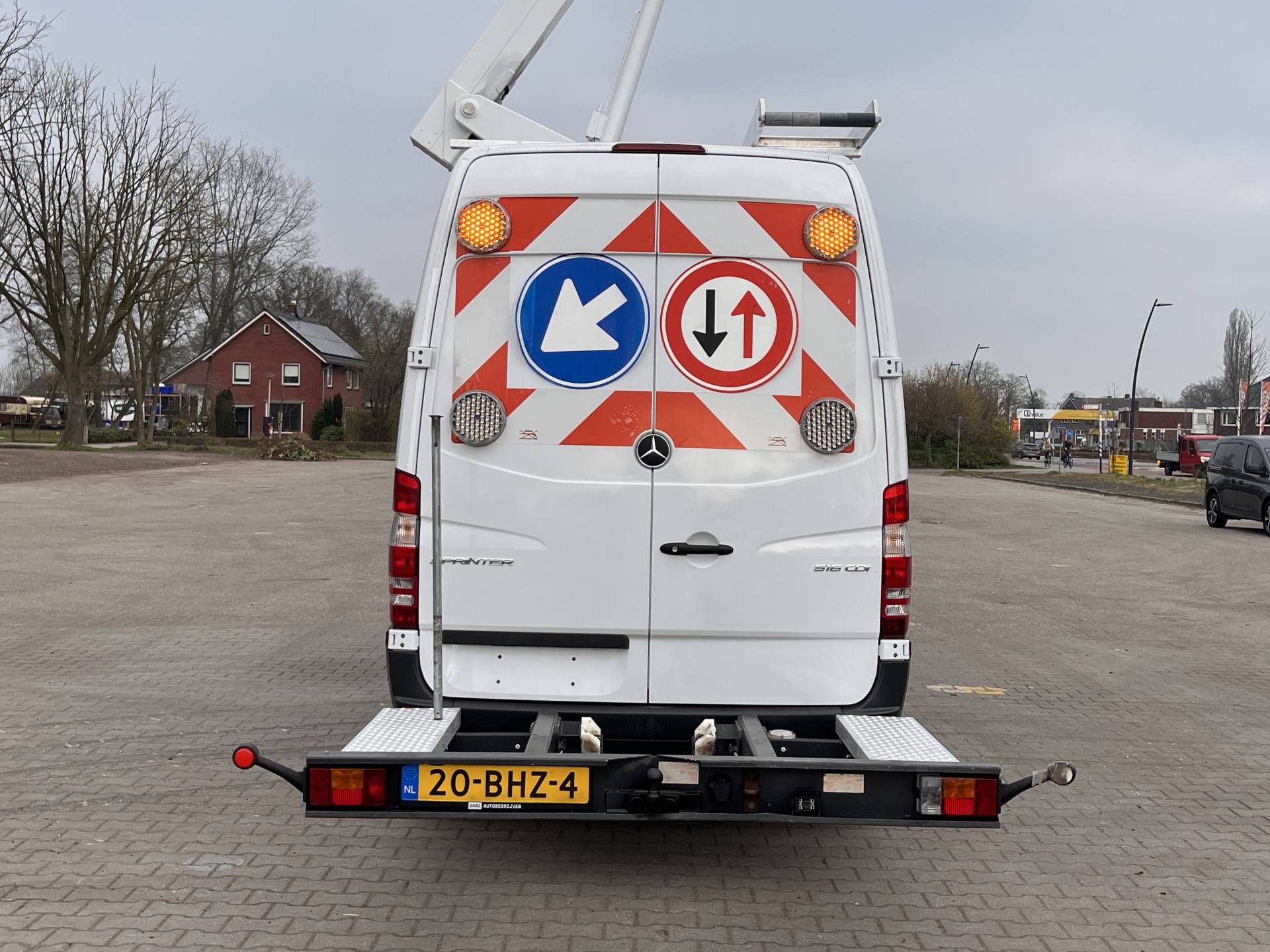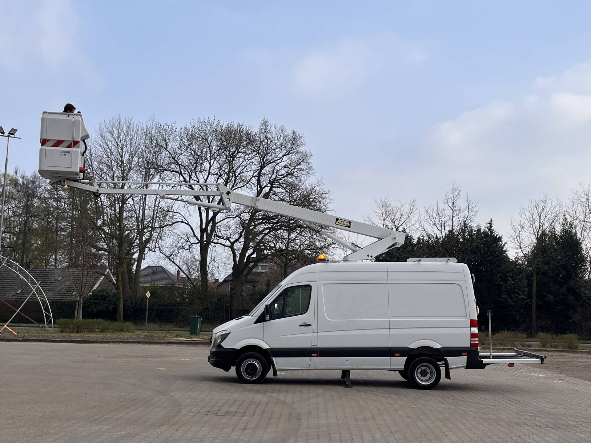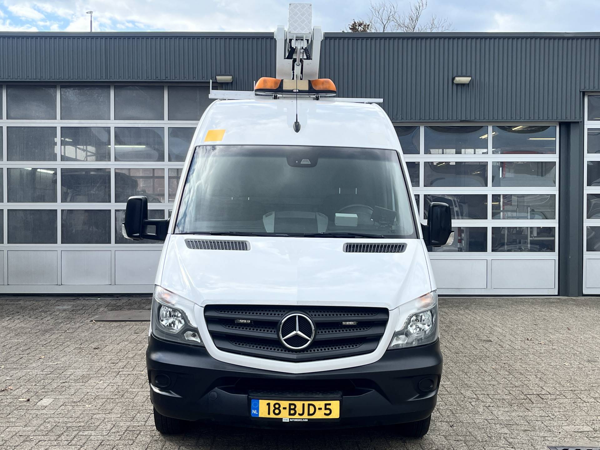 Een zeer nette Mercedes Sprinter 516 160pk Hoogwerker 14 meter Pto Omvormer Verkeersbord Bedieningspaneel Kastinrichting Airco Cruise control Tachograaf Steunpoten Telefoonverbinding Euro 6