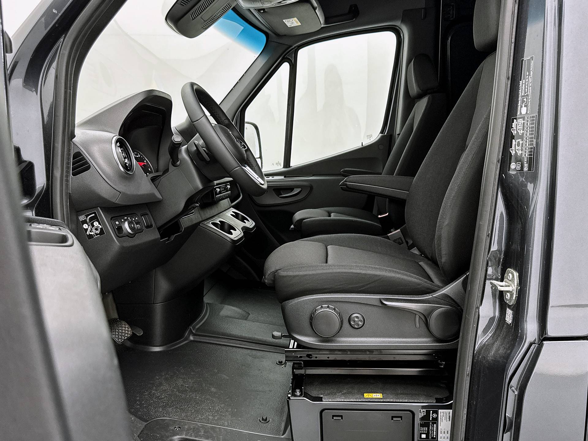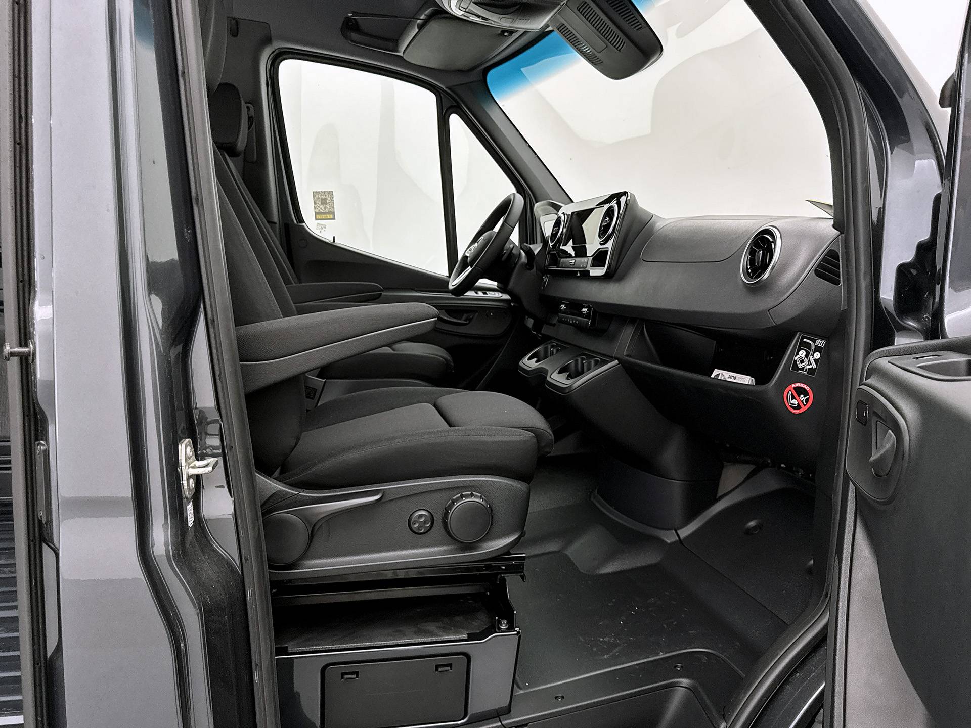 Ook praktisch: de voorstoelen zijn 180 graden draaibaar, ideaal voor overleg of laptopwerk onderweg.